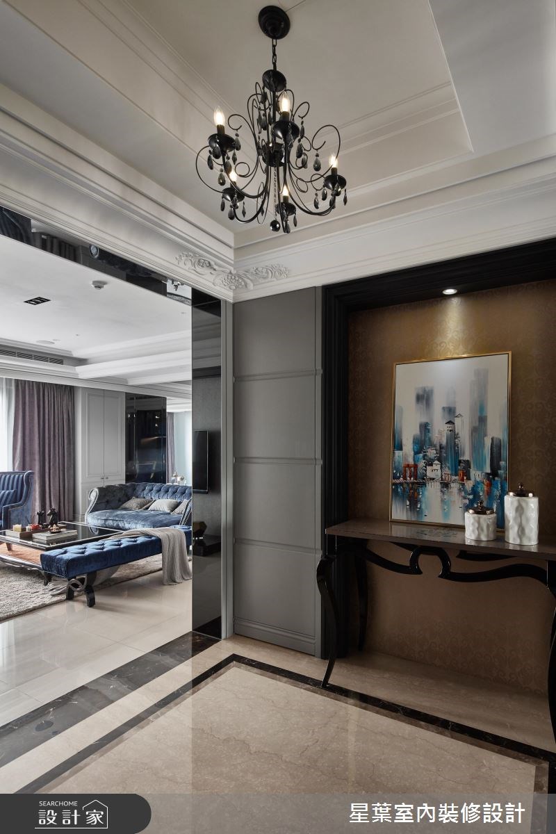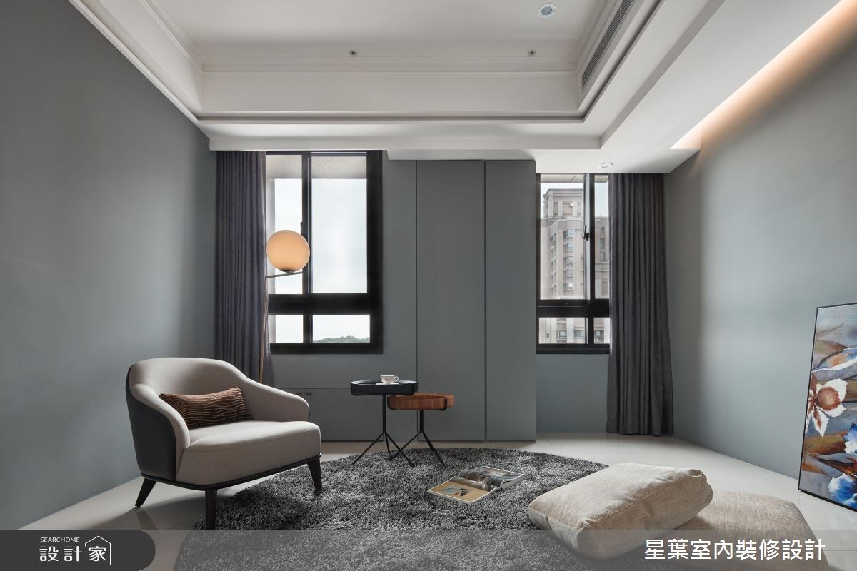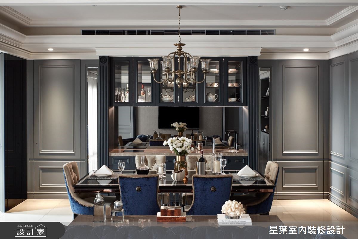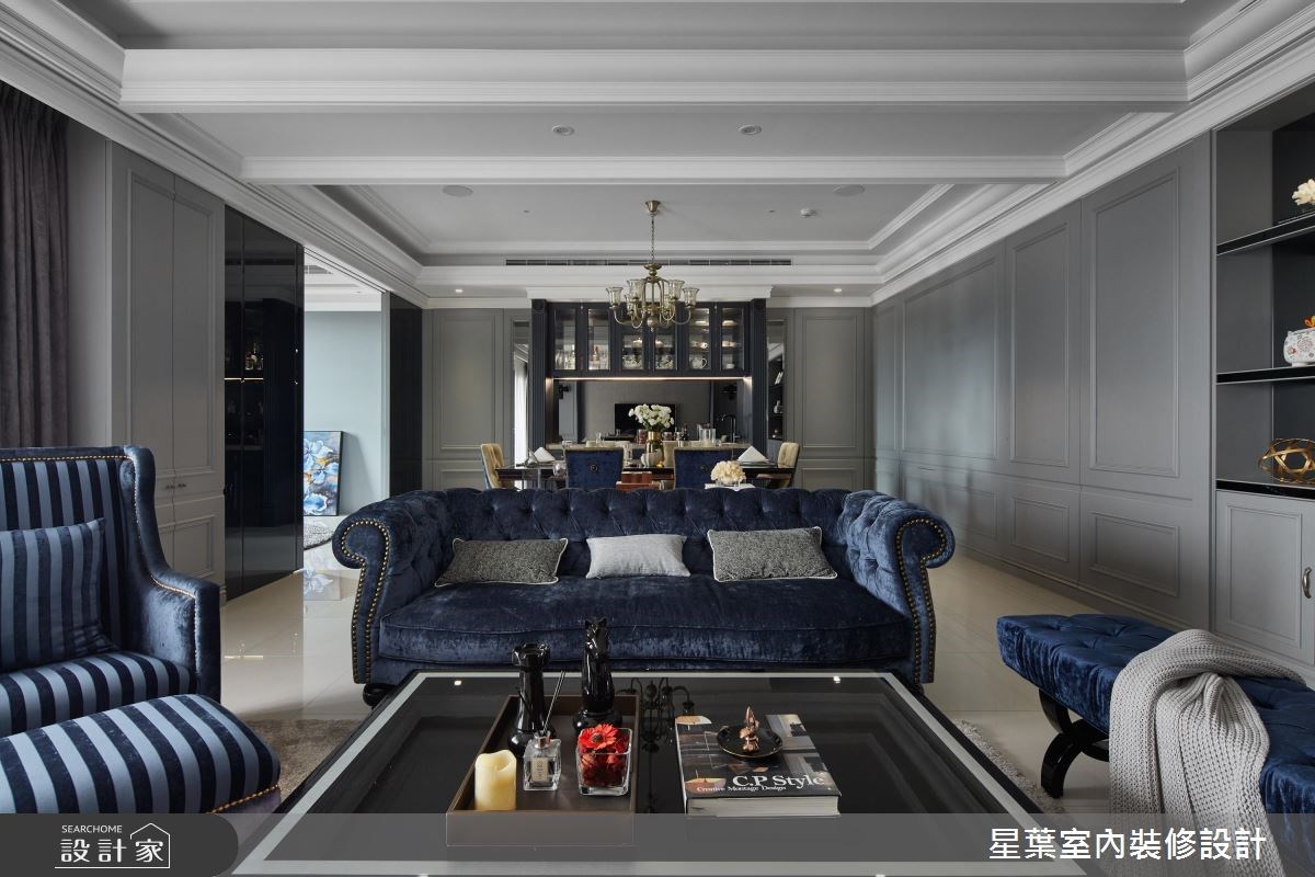 50 坪宅邸,男屋主喜歡現代感設計,女屋主嚮往著新古典風的優雅氣質,因此設計師運用成熟系的深色調搭佐異質材,揉合出現代又古典的場域氛圍,完美打造低調奢華生活風景。 公領域藉由色彩及質材傳達設計主軸,讓客、餐廳成為空間的主角。首先,運用壁面及櫃體線板的設計再刷上氣質灰藍,帶出新古典風格。再者,絨布沙發及餐椅選用皇家藍沉穩場域氛圍,成為視覺焦點。另外,桌面質材運用黑色光滑質感的石材,呼應客、餐廳立面黑玻,低調地讓奢華氛圍飄散在各領域。而私領域則延攬古典氣質,加諸粉色及亮黃色調,創造臥房空間活潑又優雅的氣息。 小編的最愛 敞開餐廳旁黑玻活動式門片,變出一個隱藏版多功能空間!寬敞且日光充足的場域並沒有擺置書桌,一張沙發、兩個小茶几倚靠窗邊,擺上地毯、坐墊,形塑溫暖放鬆的氛圍,是貓咪們最舒服自在的小窩,也可以成為夫婦閱覽、休憩與陪伴愛貓的多功能發懶角落。