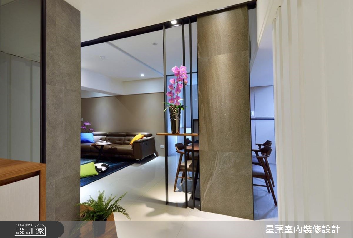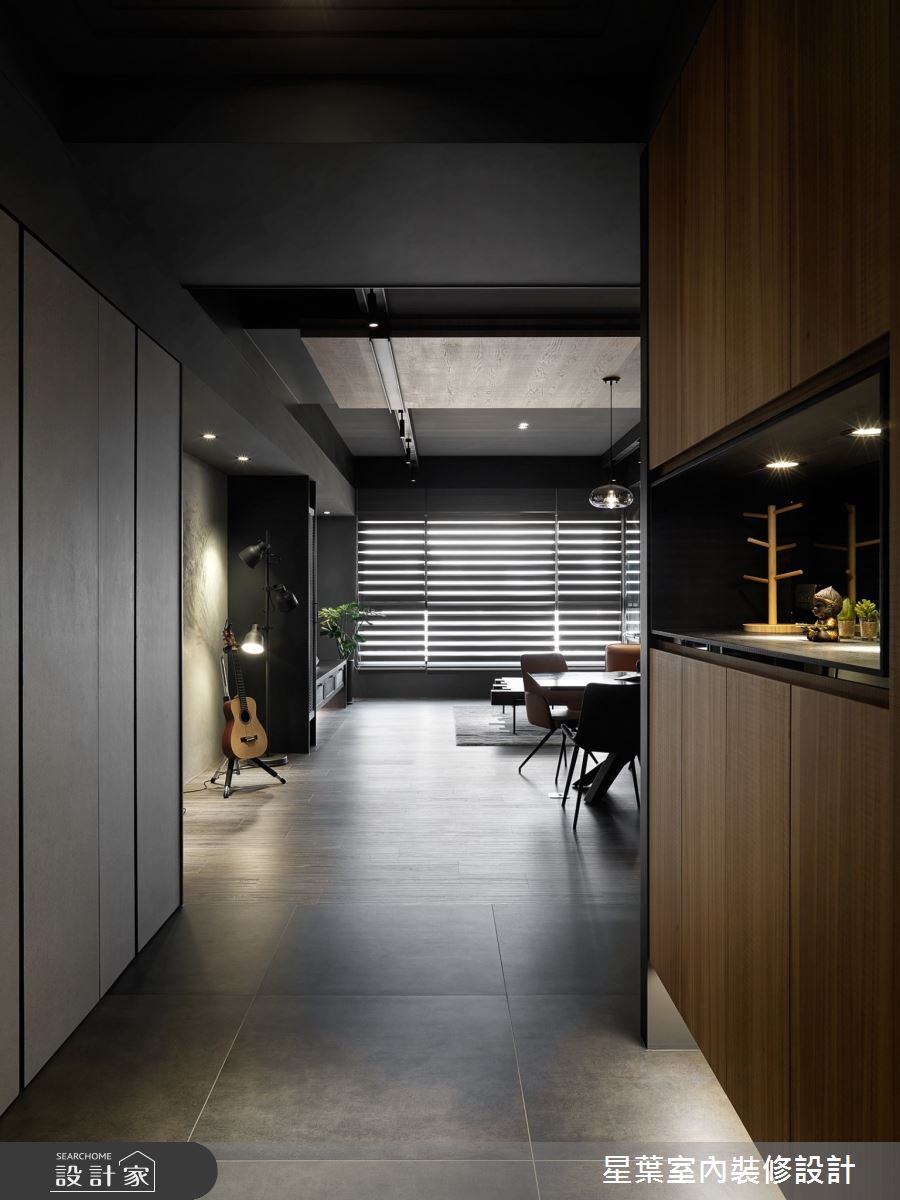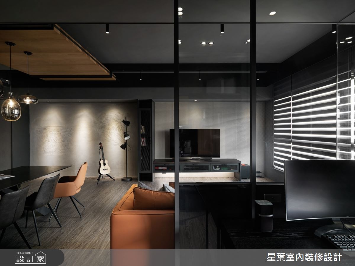 27 坪現代風住宅,屋主為單身族群,設計上多處採用黑玻、大理石材,交織出沉穩品味,繽紛軟件巧妙點綴,為單人生活刷上一抹自在樂趣 ! 入門玄關處,壁面純白收納櫃體鋪排出落塵區界線,全身鏡的設計與白色系相互搭配,放大了廊道視覺,創造寬敞感。沿著廊道來到客廳區,天花板格柵賦予公領域層次表情,同時劃分出客、餐場域。轉入用餐空間,吸睛的彩色餐椅與燈具點亮淺木色系空間,同時串聯客廳沙發各式軟件,為單身男子的休閒空間點綴些許活潑樂趣。餐桌後方壁面規劃酒櫃收納,以黑玻作為櫃體門片妥善收放多款珍藏美酒,懂享受的生活態度也隨著質材忽隱忽現。 小編的最愛 獨立於公領域的工作用書房,彷彿一個隱藏於開放空間的立方盒,以黑玻打造沉穩俐落感,同時兼具工作需要的專注及不壓縮空間的通透感。