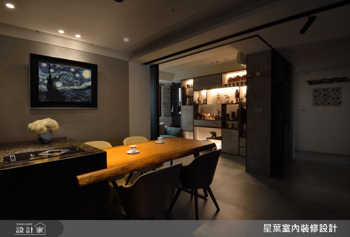 相當有主見的屋主夫妻,喜愛四處去旅行,因此設計師透過靈活的櫃體規劃,將收藏品陳列得乾淨整齊,並在格局重整之後,呈現襯托屋主氣質的的雅致風範。 原先在 41 坪的住宅塞進三房加一書房,以及客餐廚兩衛,顯得空間有些擁擠,且隔間多導致通風不良,而在拆除掉其中一間房後,營造出宛若大宅的氣度,也較能夠發揮光線優勢。在色彩層面,居家以大面積的灰階,配合深藍的軟件跳色,打造身處璀璨星空之下的絕美意境。 視線穿過仿鐵工法的木作屏風,通往私領域的走道兩側,右邊是採光良好的客廳,左邊則是牆上掛有《星夜》畫作的餐廳,形成開放式的動線配置。客廳電視牆鋪設進口鑿面磁磚,呼應地坪的義大利霧面磚質感,使整體表現一致的沉穩氣勢。餐廚空間選擇實木餐桌,搭配簡約的黑白廚具,平衡了室內的視覺溫度,又提升時尚感受。 小編的最愛 環狀沙發後方,設計師區隔出大小不一的收納空間,賦予高雅杯盤活躍的生命力;運用拉門隔間的書房,同樣採取錯落的展示格,擺放從各地帶回的紀念品,在門片開闔間達成不一樣的審美。