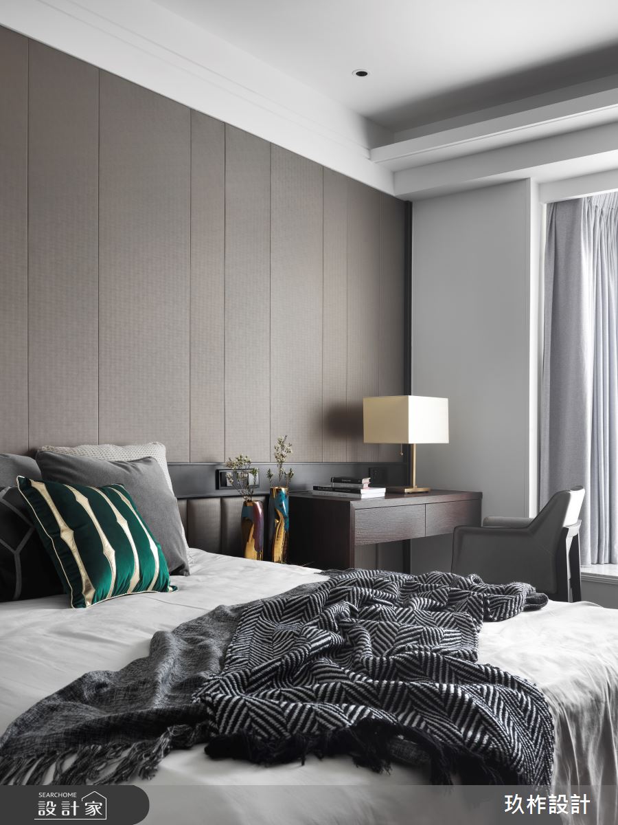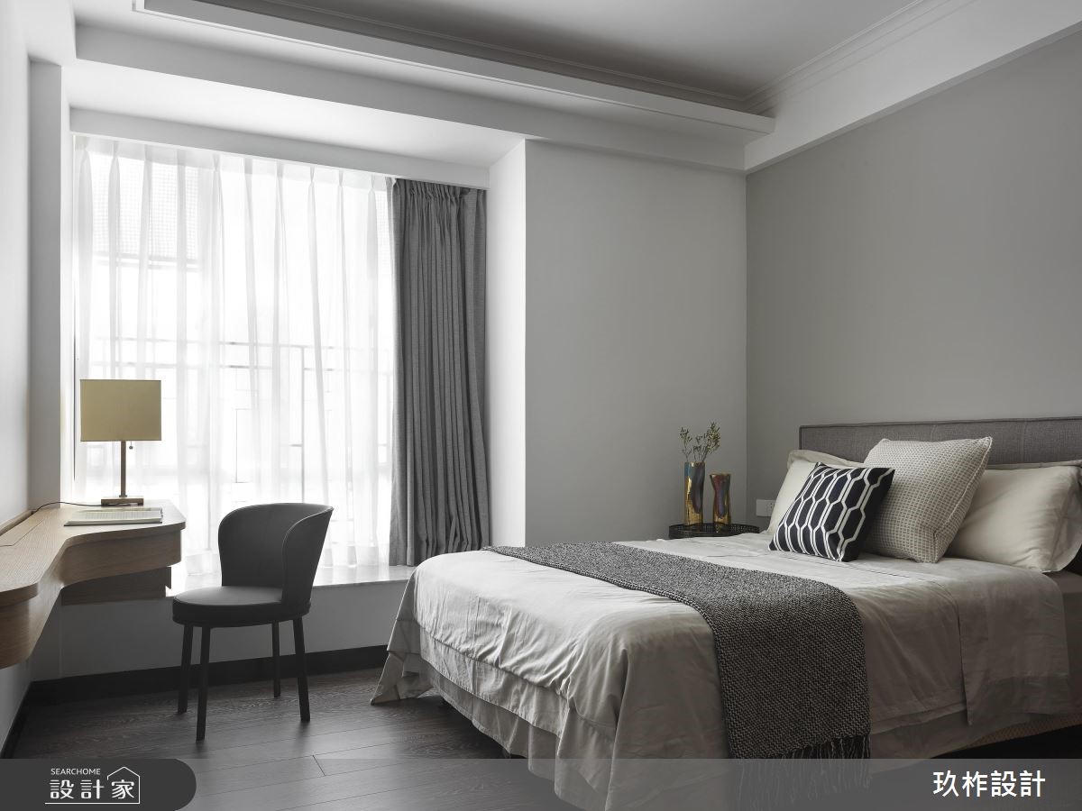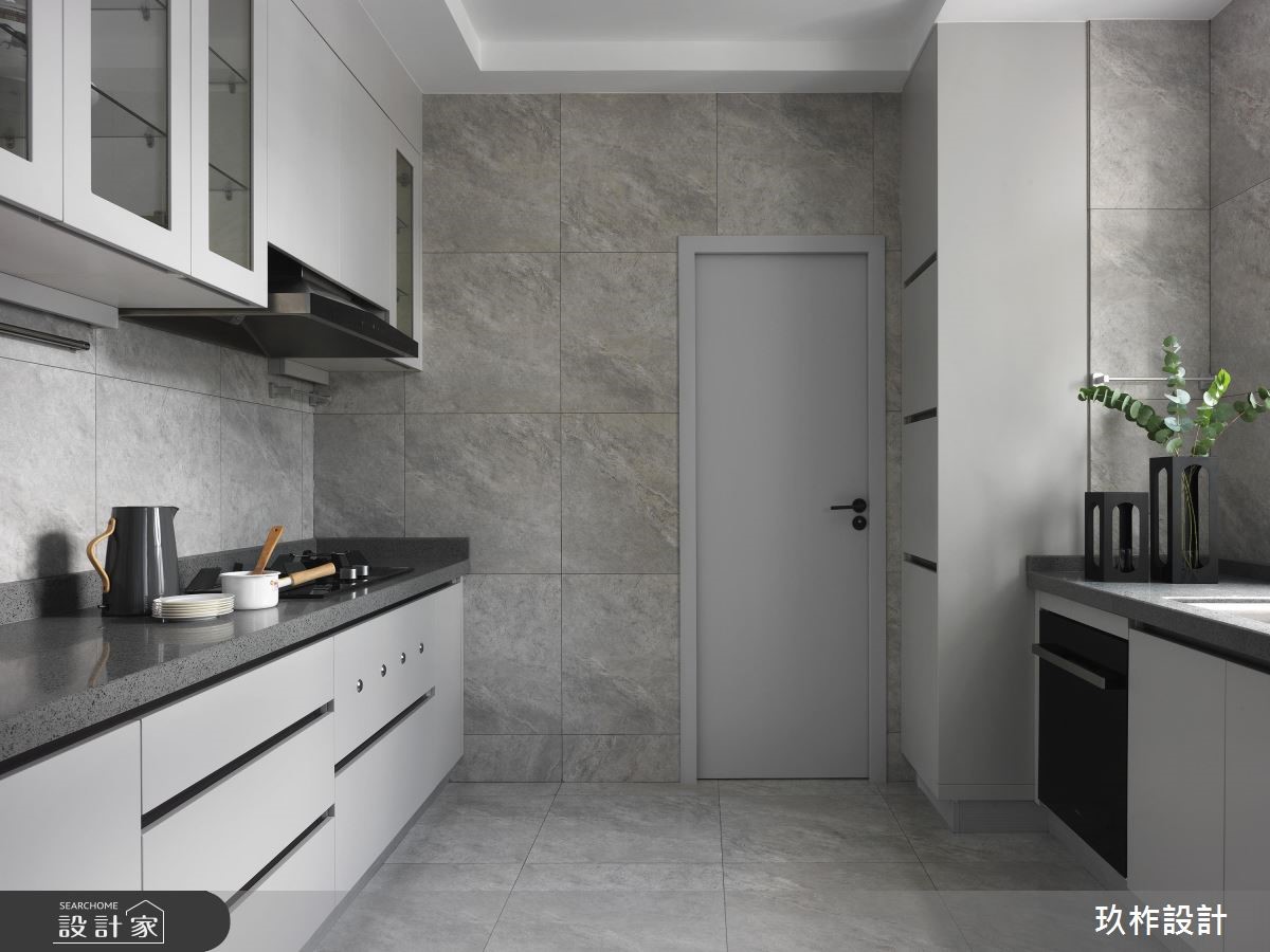 空間以大量灰白色作為主軸,搭配溫潤木質地板,勾勒出俐落閒適感,並給予現代簡約的元素,不做過多的複雜裝飾,於公領域大量採用大理石材,與溫潤木質地板形成冷暖交融,主牆大理石更勾勒獨特的分割線條,讓牆體更具立體層次,客廳沙發也特地挑選加大尺寸,瞬間提升廳區的大器感;廚房區域,則配置玻璃拉門促成光線穿透,並顧阻隔油煙功能,讓空間使用更具彈性;主臥房,承襲著輕盈的灰白調性,並沿牆面配置閱讀木桌,替房間挹注更多的使用功能。