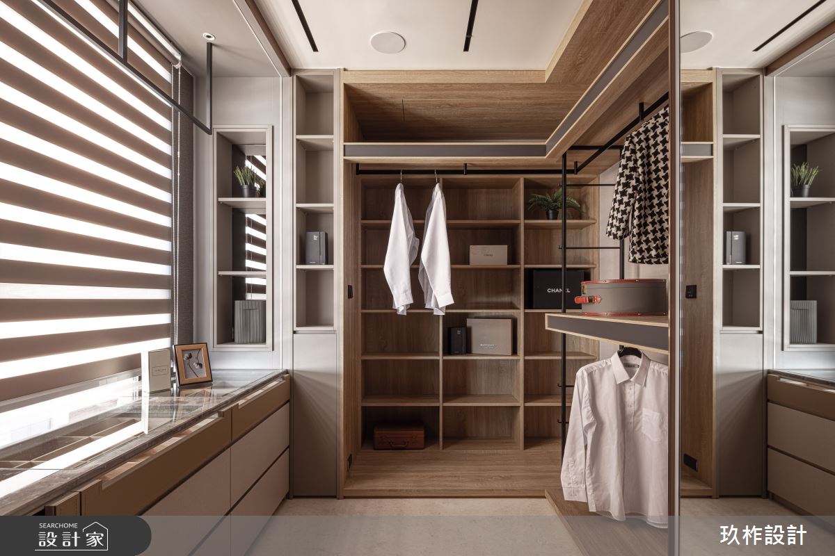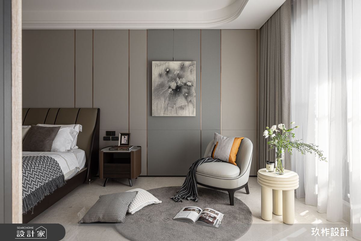 玖柞設計以乳膠漆、壁紙、超耐磨木地板、鐵件、鍍鈦金屬、木作貼皮、烤漆、系統板材、大理石、磁磚、木百葉、人造石、賽麗石、皮革、石材的搭配應用,呈現現代風居家氛圍,將此間32坪、三房、單層、新成屋(5年以下)打造成舒適愜意的家庭空間,完成3位大人全家人的夢想之居。