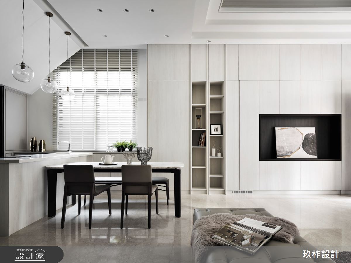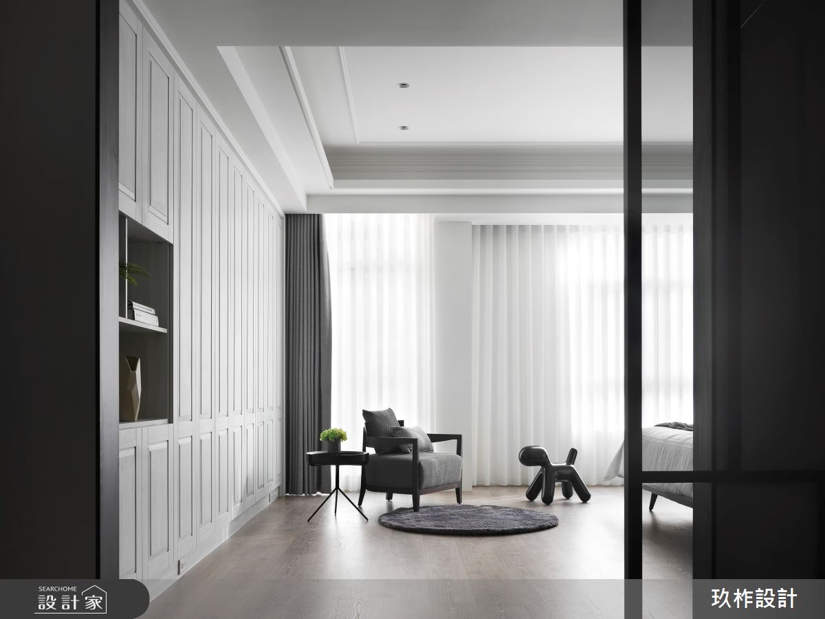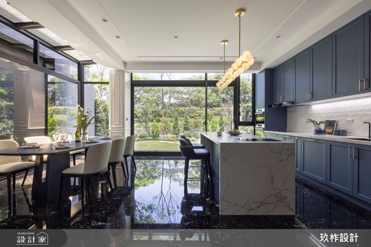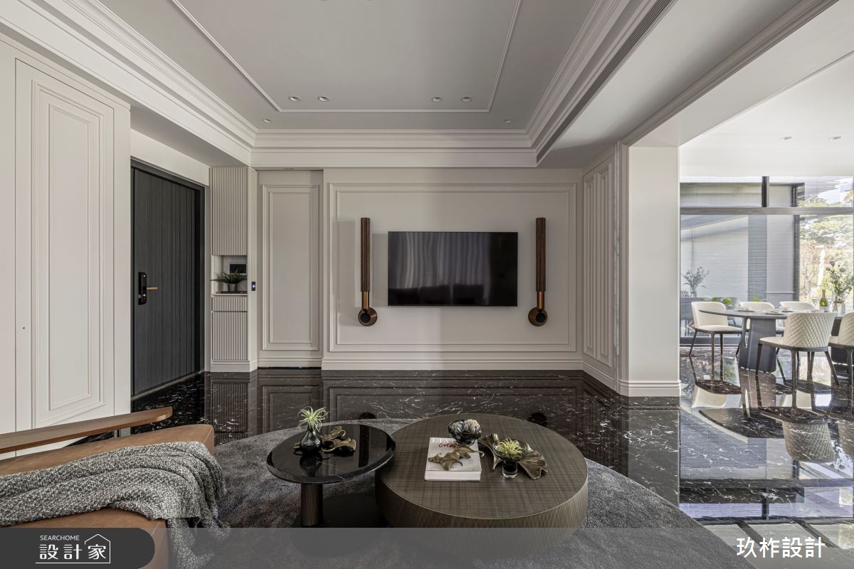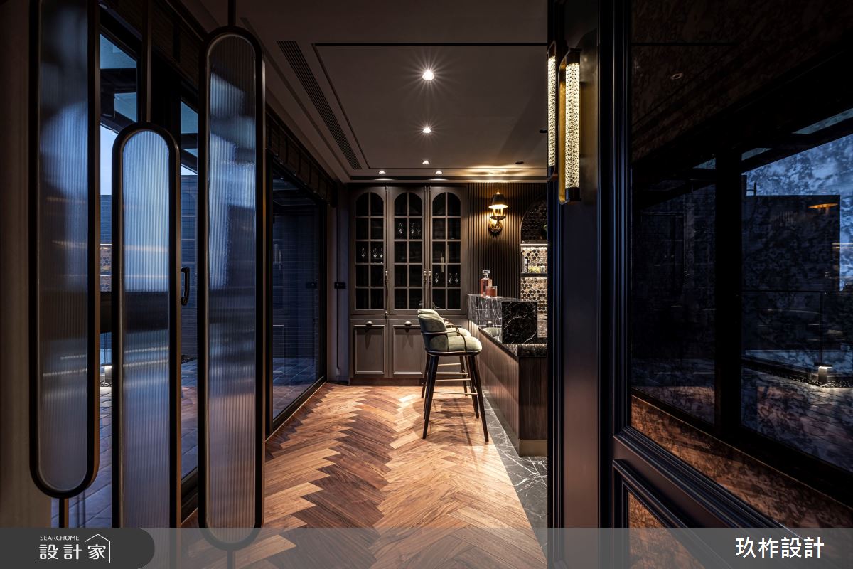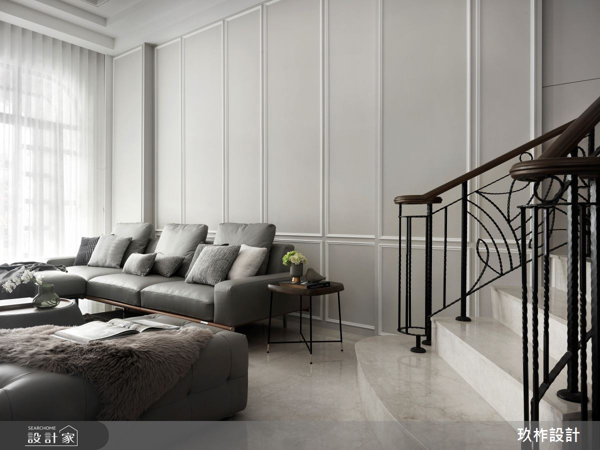 來自玖柞設計的77坪美式風住宅案,屋主一家人共有2位大人、1位小孩,是一間透天別墅新成屋(5年以下)的六房格局,設計師藉由建材以壁紙、木地板、鐵件、茶玻、鍍鈦金屬、木作貼皮、烤漆、系統板材、賽麗石、軌道燈、皮革、石材、繃布、線板、油漆的搭配應用,實現一家人的理想生活。