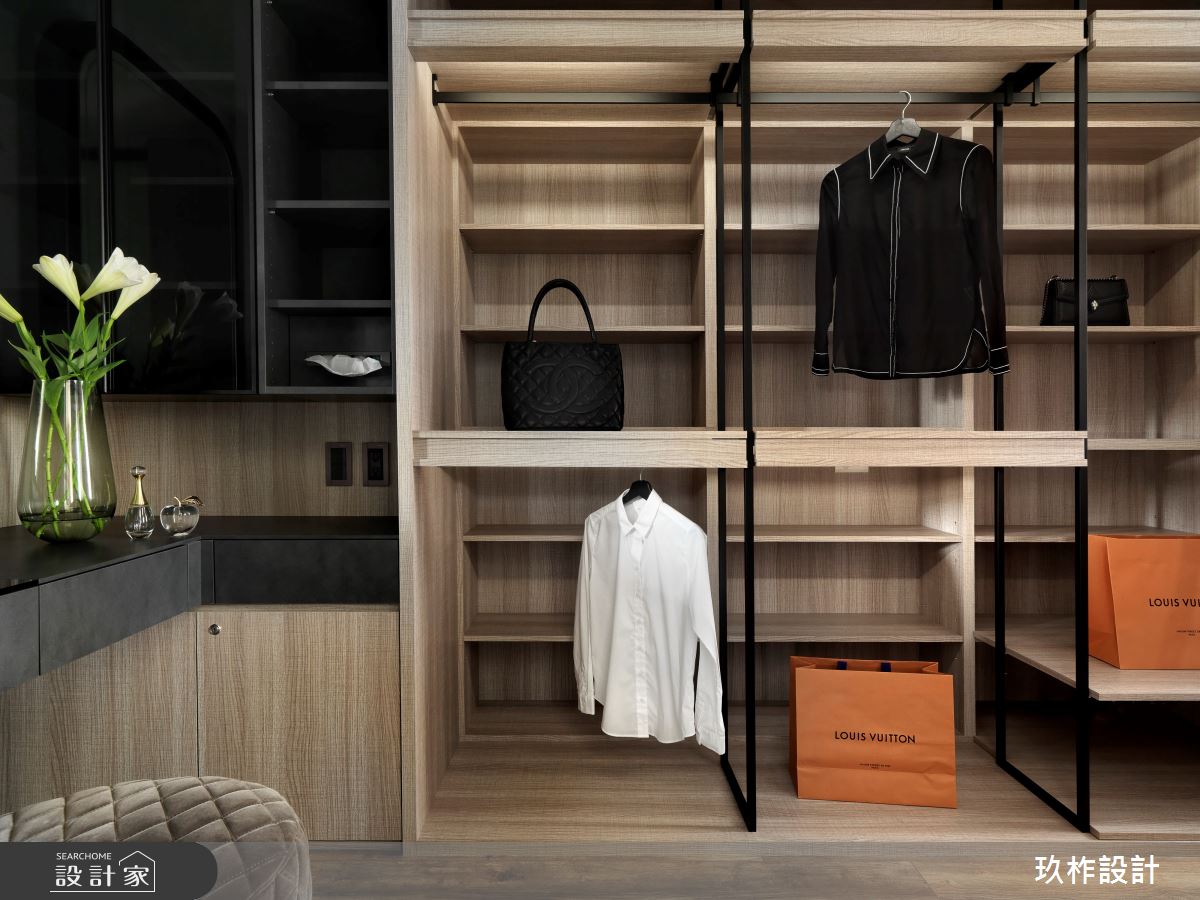 玖柞設計以乳膠漆、壁紙、超耐磨木地板、鐵件、鍍鈦金屬、木作貼皮、烤漆、系統板材、大理石、磁磚、木百葉、人造石、賽麗石、皮革、石材的搭配應用,呈現現代風居家氛圍,將此間32坪、三房、單層、新成屋(5年以下)打造成舒適愜意的家庭空間,完成3位大人全家人的夢想之居。