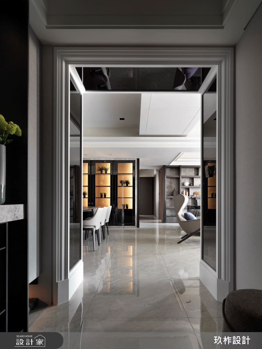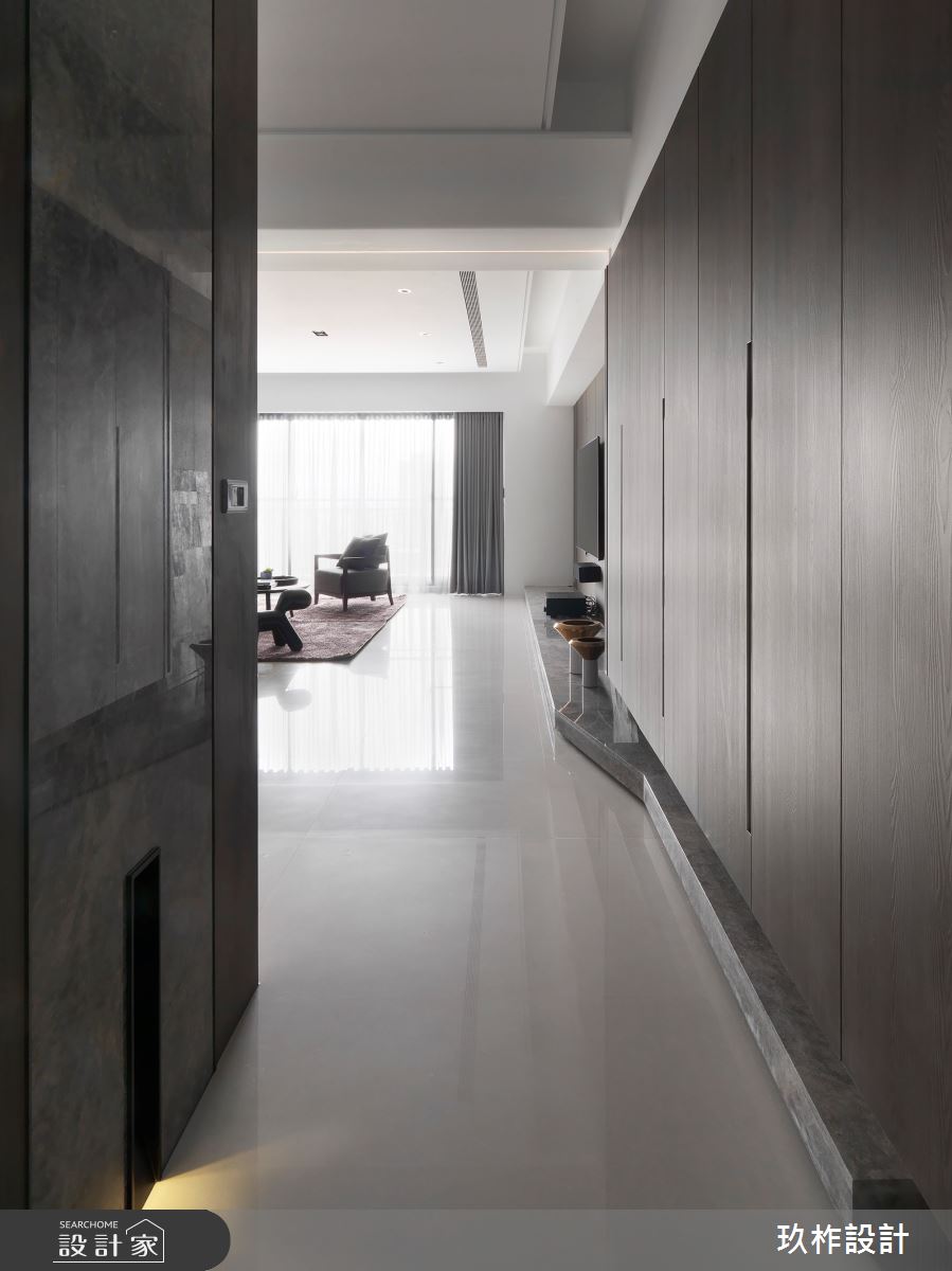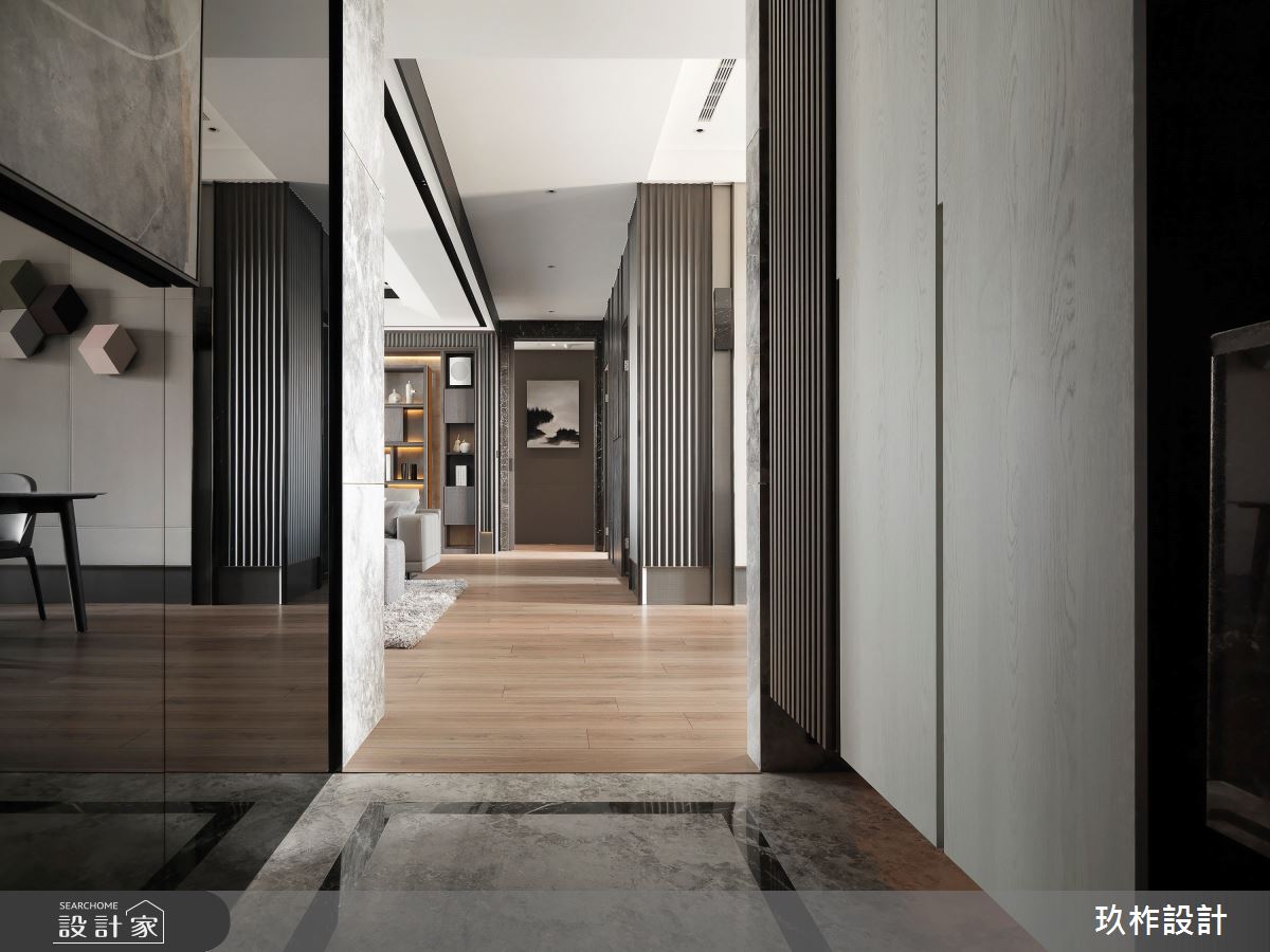 88坪現代風大宅,設計師運用精緻建材的細緻舖陳,注入低彩度色系的沉穩內斂,在輕盈流動的自然光源中,創造奢華品味氛圍,使人彷彿走進精品飯店般的居家空間! 進入大門後,即見鏡面反射式的系統櫃體,為優雅大方的居家場域揭開序幕,並以方正造型的大理石地板區分室內與落塵區。公領域採開放式設計,釋放空間向度,讓視線更具延伸性,在大篇幅的明亮採光下,藉由石材搭配金屬、木皮等建材混搭,描繪出精緻大器的非凡樣貌,同時以畫作、端景牆點綴一二,創造充滿質感的人文風情。客、餐廳之間,特別以弧形動線銜接私領域,使其在寬敞無邊的視野中,仍保有一絲含蓄內斂的隱密性。主臥室內,維繫輕柔的灰階色系,透過溫潤木質和光的作用下,製造靜謐而舒緩的休憩空間。 小編的最愛 別出心裁的衛浴空間設計,以百葉窗勾勒動人光感,結合天然建材的質感,泡澡時猶如浸沐於大自然般愜意放鬆。