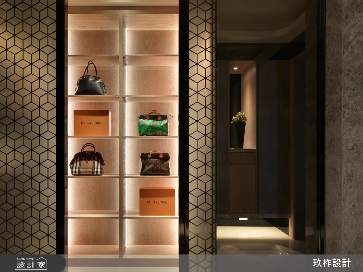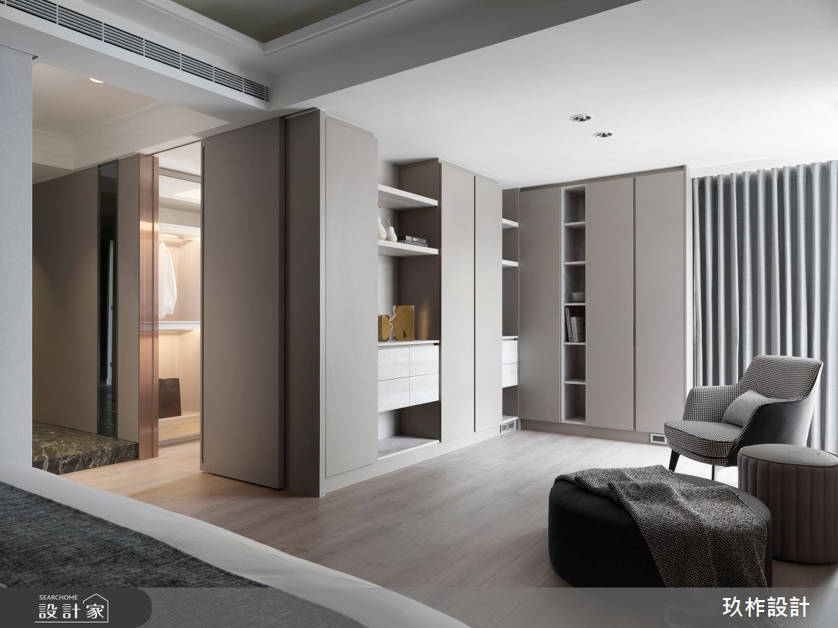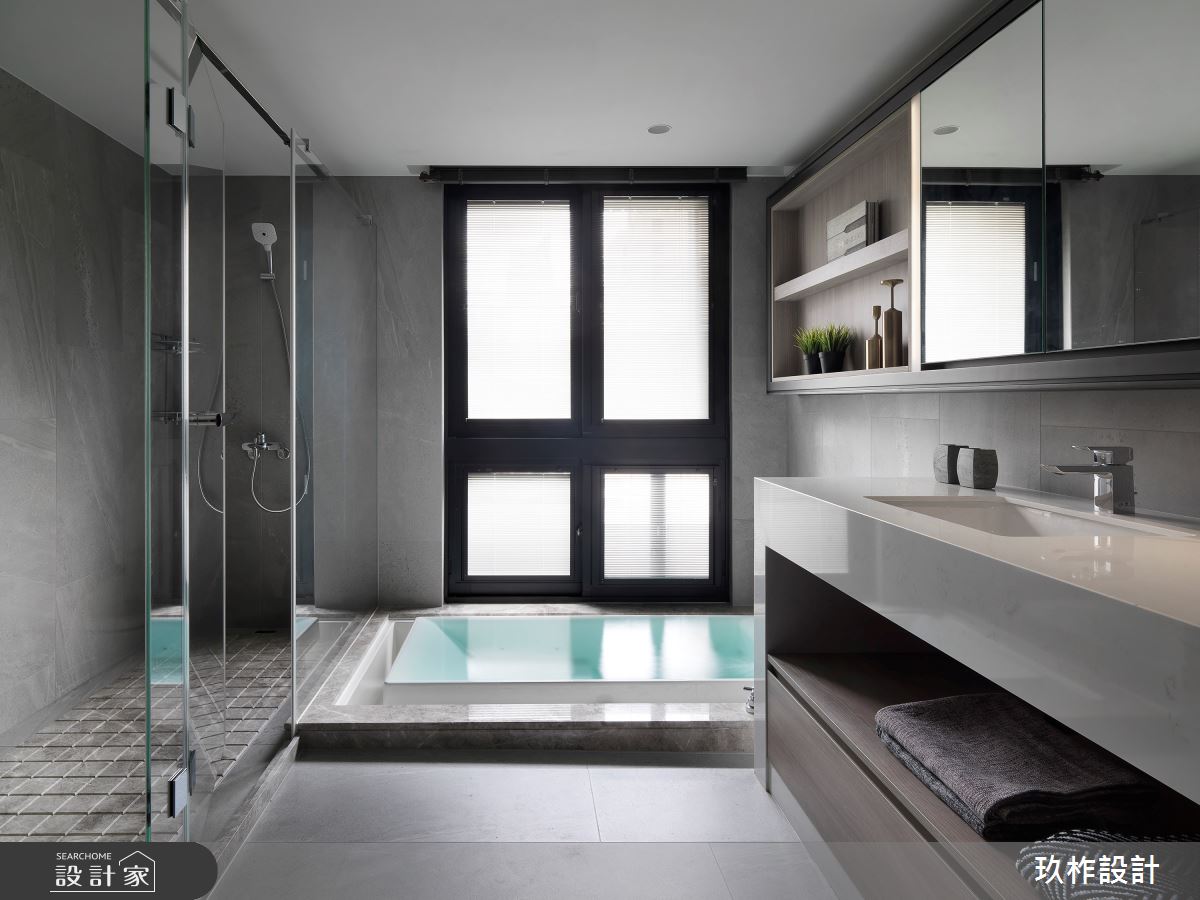 88坪現代風大宅,設計師運用精緻建材的細緻舖陳,注入低彩度色系的沉穩內斂,在輕盈流動的自然光源中,創造奢華品味氛圍,使人彷彿走進精品飯店般的居家空間! 進入大門後,即見鏡面反射式的系統櫃體,為優雅大方的居家場域揭開序幕,並以方正造型的大理石地板區分室內與落塵區。公領域採開放式設計,釋放空間向度,讓視線更具延伸性,在大篇幅的明亮採光下,藉由石材搭配金屬、木皮等建材混搭,描繪出精緻大器的非凡樣貌,同時以畫作、端景牆點綴一二,創造充滿質感的人文風情。客、餐廳之間,特別以弧形動線銜接私領域,使其在寬敞無邊的視野中,仍保有一絲含蓄內斂的隱密性。主臥室內,維繫輕柔的灰階色系,透過溫潤木質和光的作用下,製造靜謐而舒緩的休憩空間。 小編的最愛 別出心裁的衛浴空間設計,以百葉窗勾勒動人光感,結合天然建材的質感,泡澡時猶如浸沐於大自然般愜意放鬆。