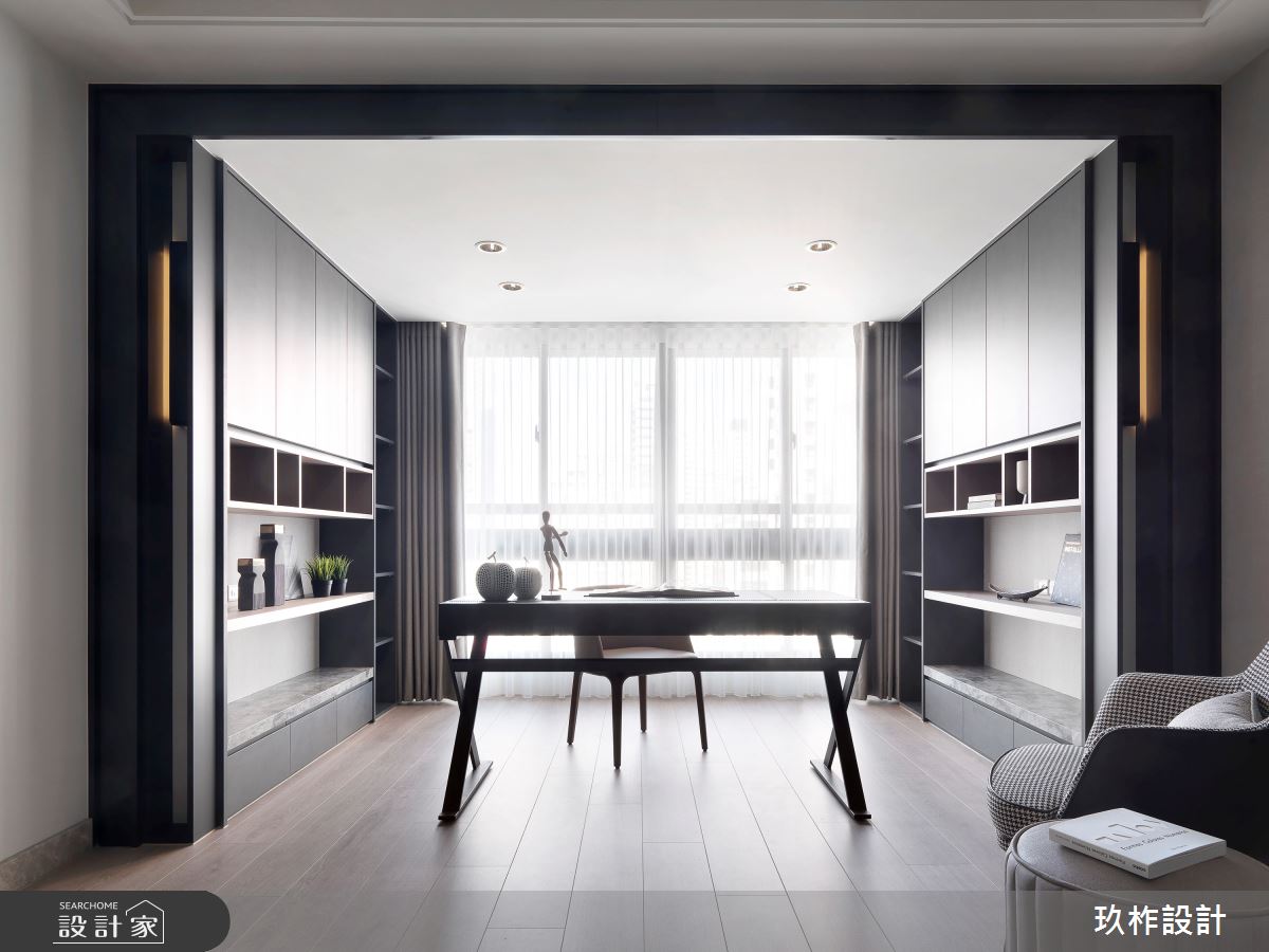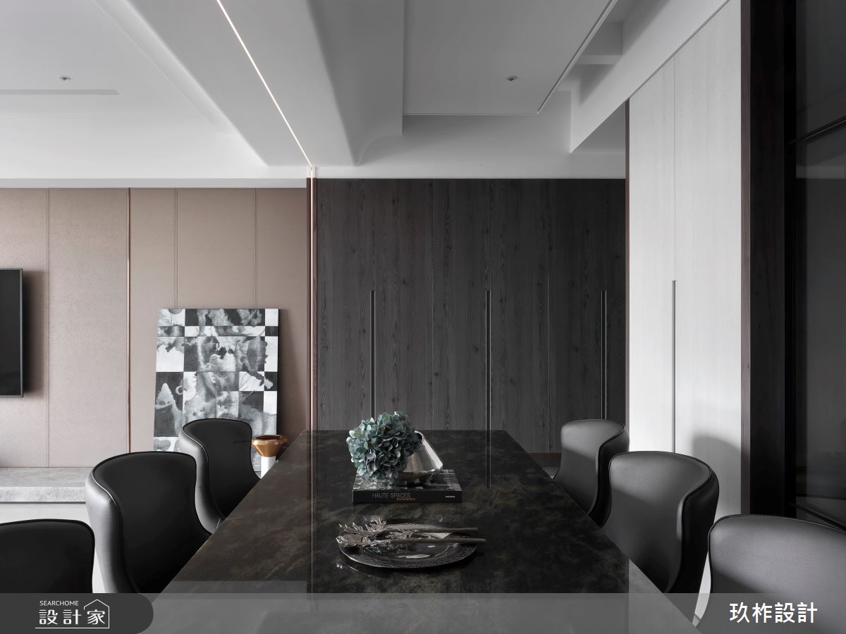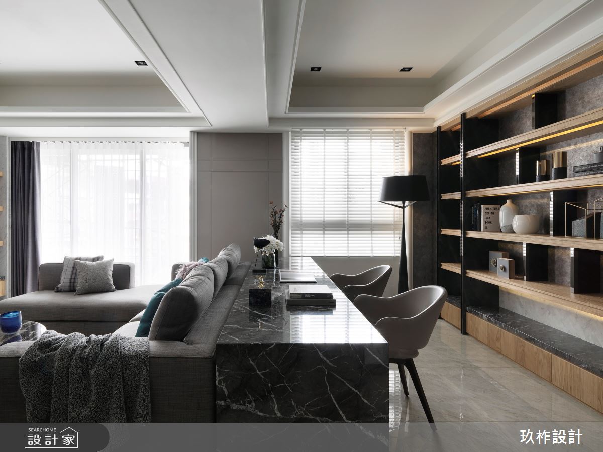 將原本四房兩廳的格局做了些微調整,拆除其中一房的隔間重新規劃成開放式書房,讓共同經營電子商務的夫妻能擁有一個舒適的居家工作環境。微調後客廳變得更加寬敞,低背沙發銜接長型辦公桌,在高度上統一之外,選用大理石、鐵件、鍍鈦搭配沈穩的黑灰色系,將空間的尺度透過色彩與建材串連起場域之間的關係。以白色大理石電視牆純淨的意象向四周擴散,隨著空間的流動增添黑色線條以及淺色木皮,透過材質的比例變化調整不同機能區域的氛圍。家具擺設上適度的裝飾搭配低調耐看的線條設計,讓空間有內涵卻不會被過度填充,長時間待在家裡工作的夫妻能在空間中找到驚喜,也能享受忙碌生活中的寧靜。