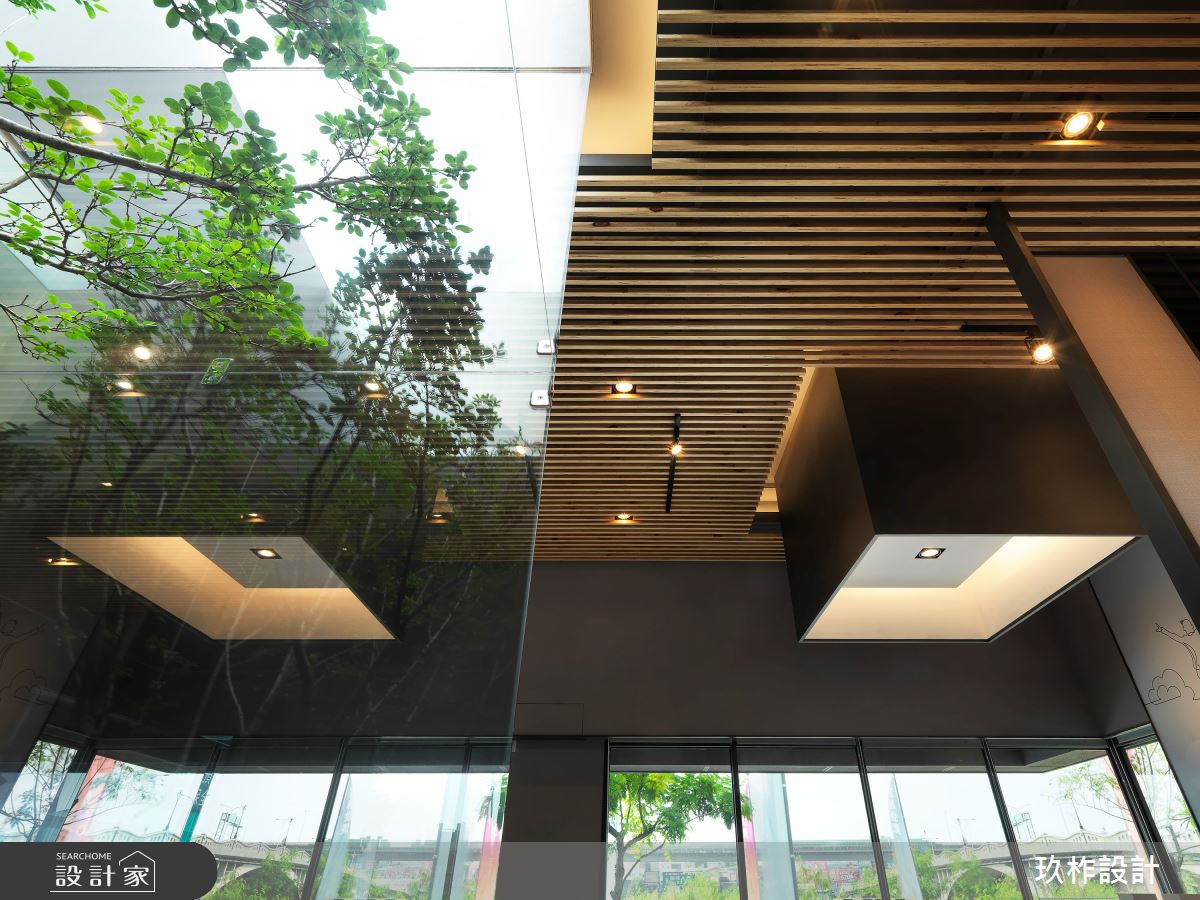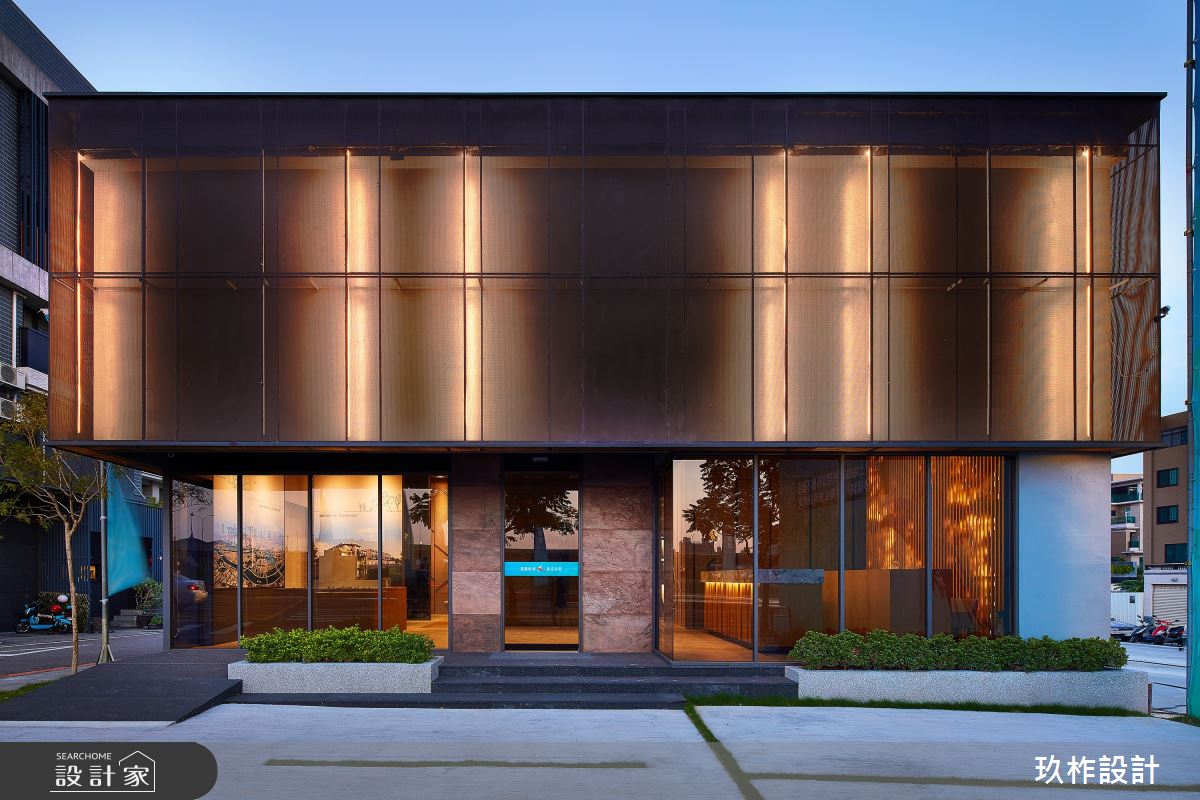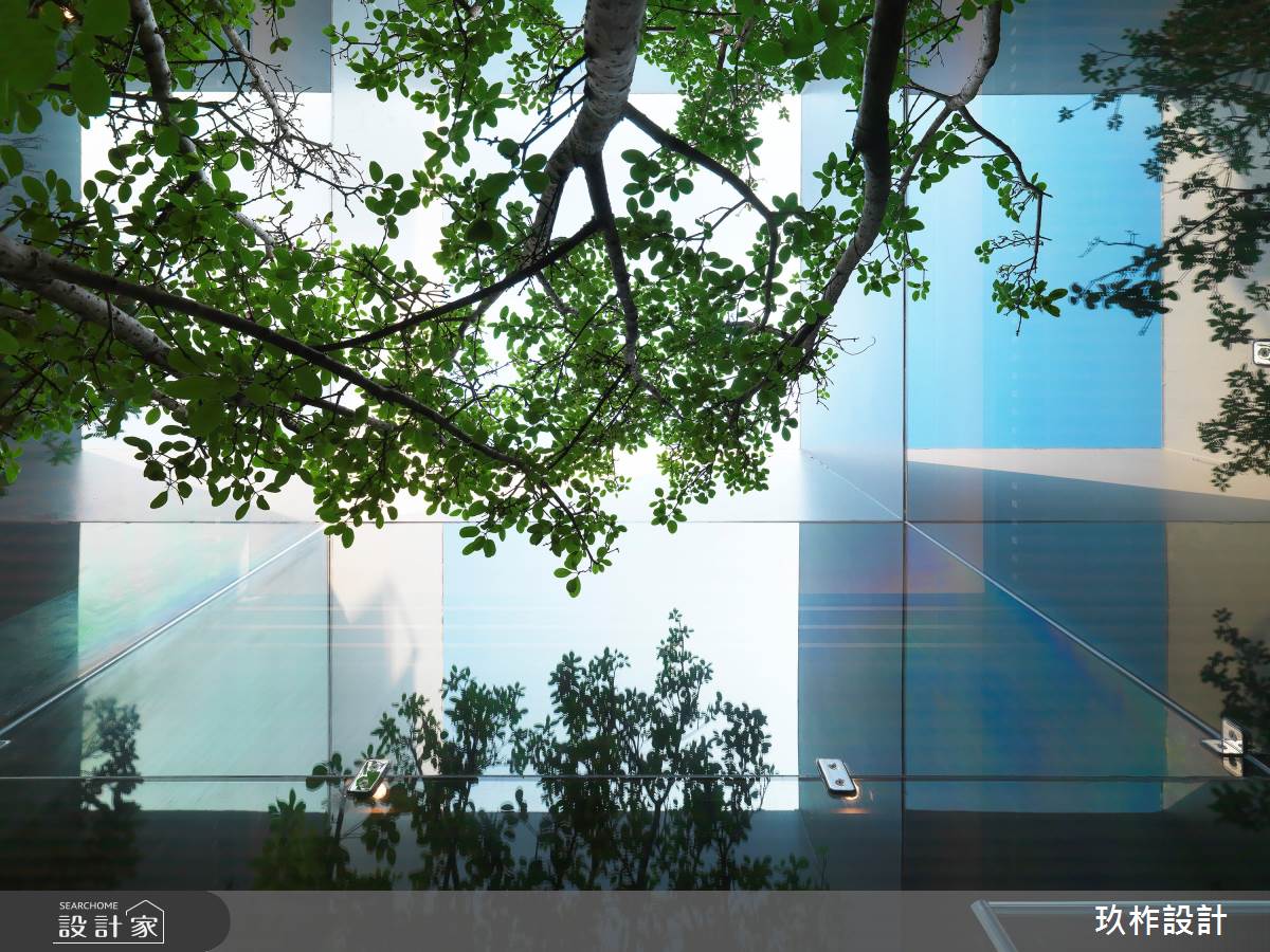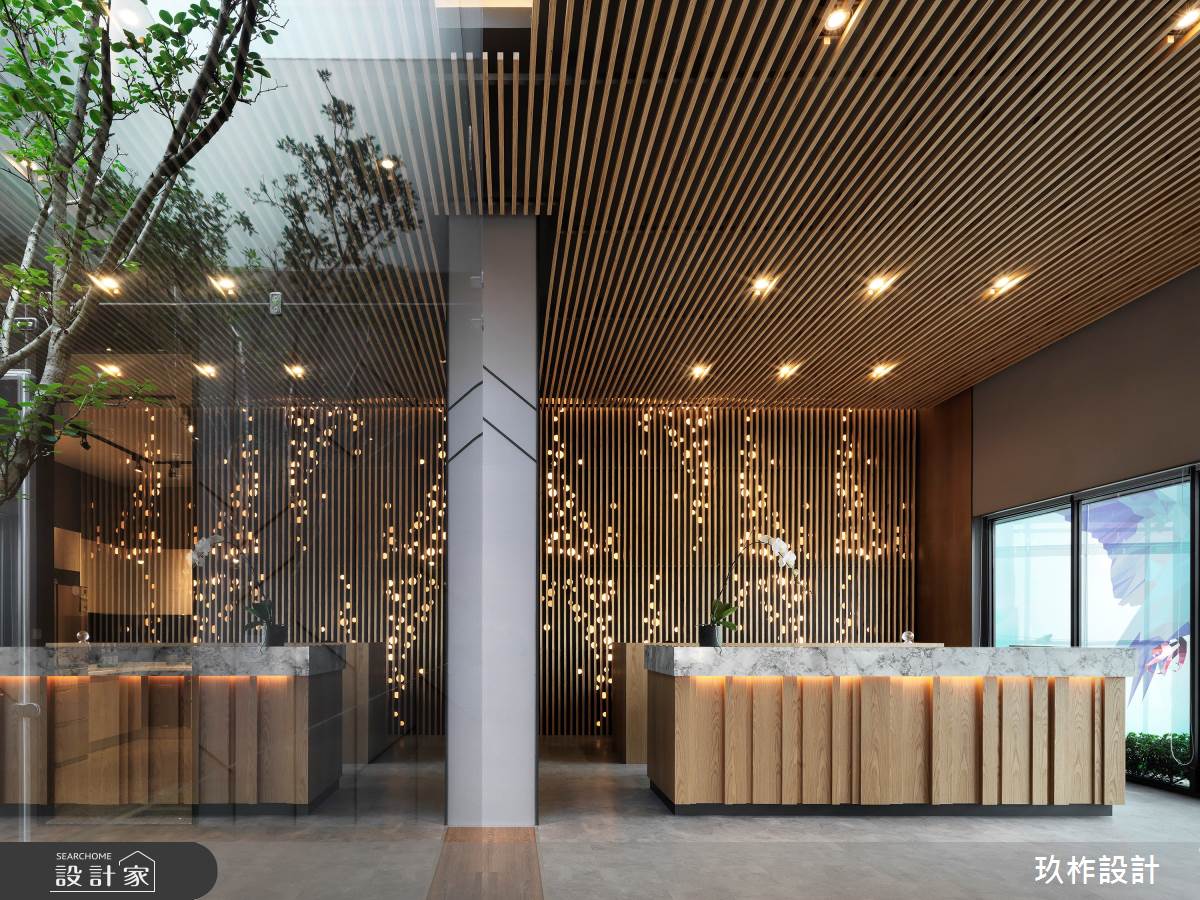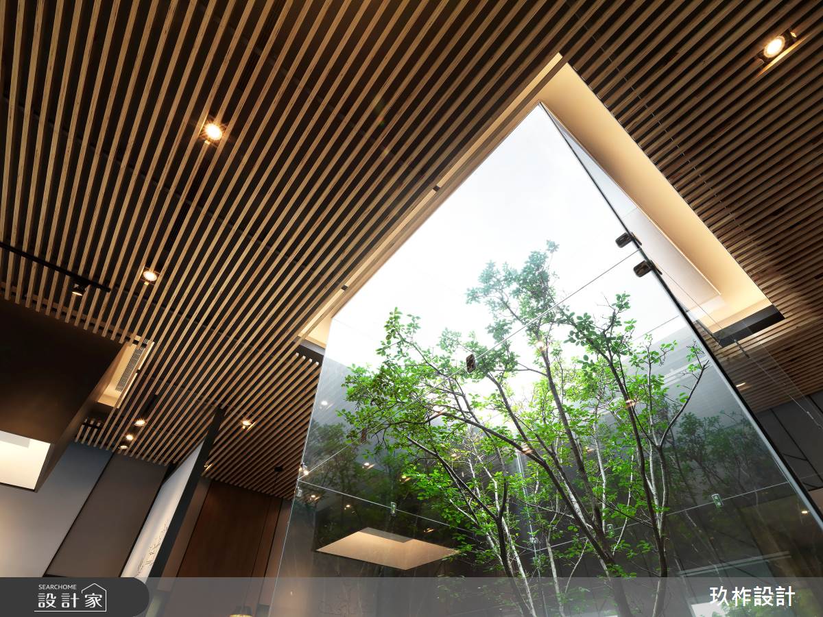 欲於熙來攘往的都市建築中打造空靈寧靜的居住環境,設計師提出「城市森林」的概念,將透天別墅的接待中心以玻璃、木格柵、金屬孔版、回字動線作為設計手法,讓室內空間與自然環境接軌,讓前來賞屋的客戶能由大廳體驗到大隱於市的靜謐氛圍。挑高的空間以大面積的落地玻璃砌起曖昧的裏外界線,建築外觀的木格柵將自然樹木的意象帶入室內;中央由玻璃包覆的類天井設計,創造悠遊的回字動線,搭配頂端的光帶,重新定義室內外的關係。光線透過玻璃折射、漫射恣意進入空間,壁面與天花板的黑鏡反射,掩映出更豐富的表情,詮釋出漫步於城市間的山林、悠然自在的別墅魅力。