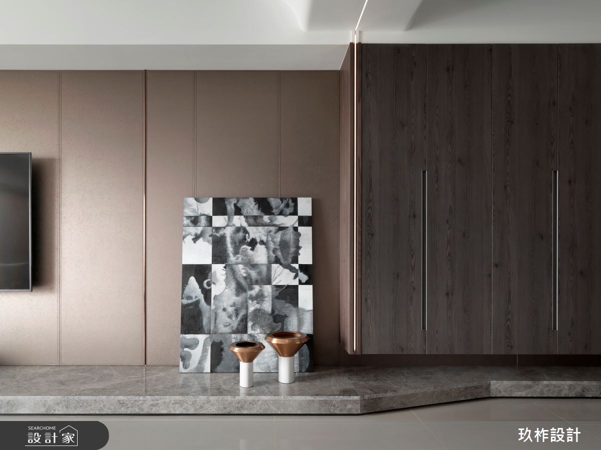 37坪居家宅邸,以簡約的現代風打底,注入低彩度色調,搭配軟性皮件、溫潤木質等天然建材,使一片簡潔俐落中卻不失溫度,並適時留白,巧妙以遠方端景,勾勒一家四口的恬靜日常,打造幸福美好的點滴回憶。 走入玄關區域,大篇幅的系統木櫃在眼前展開,增添收納機能,更與橫樑合而為一,除去櫃體的笨重感。開放式公領域空間一片無礙視野中,伴隨清透日光的遊走,替室內增添景深與溫度。視覺焦點落在皮件質地的電視牆,軟化現代簡約的冷硬,以鍍金流線畫龍點睛,營造優雅從容氛圍。 銜接客、餐廳的天花板間巧遇低樑,以木作的弧形設計化解,坎入線型夜燈加以連接走廊,譜出順暢通行的居家動線。選擇黑白畫作、金屬質感的幾何家飾點綴一二,在內斂低調間仍保有一絲迷人風韻。 小編的最愛 主臥內配置偌大衣櫃,配合長型區域,將衣櫃門片變身為滑動的鏡面拉門,減少開關門的零碎空間,更將視覺有效延伸。