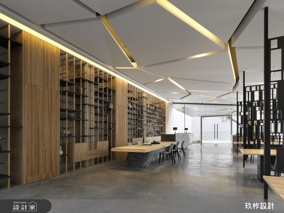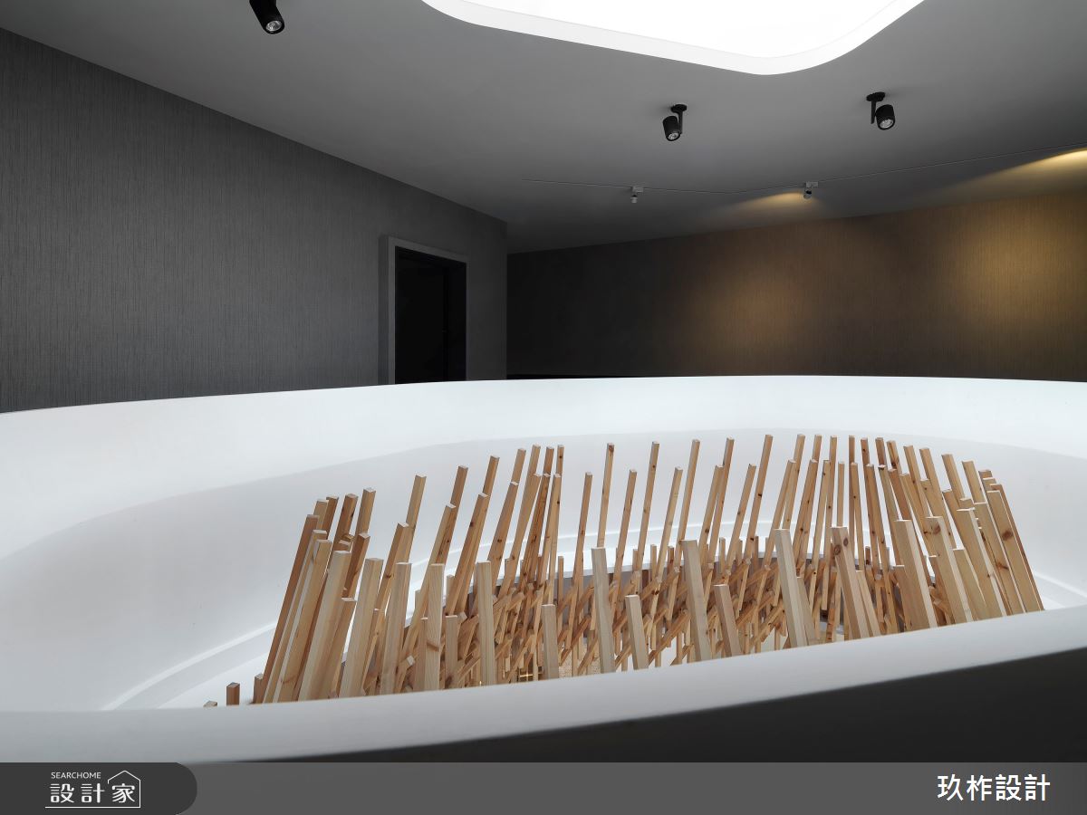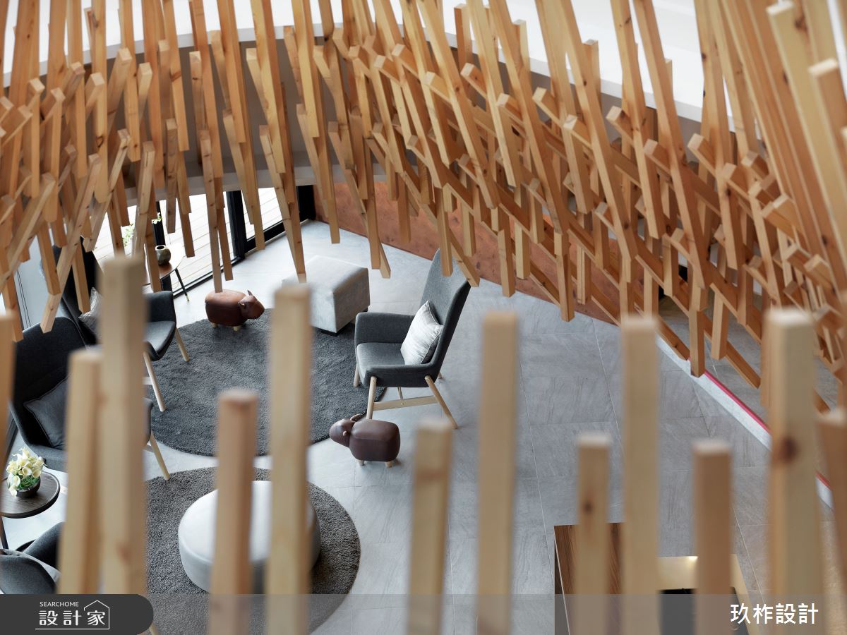 腹地寬敞的公共空間中,設計團隊將在地的山林美景作為設計靈感,80坪的空間四面採落地玻璃設計,讓戶外的庭園景緻映入室內,鐵件打造成的屏風比擬連綿山巒,虛實的切割設計讓視線產生豐富的變化性,安置在鐵件屏風之間的一張張長桌,提供住戶閱讀、待客以及會議體論的彈性空間。天花板不規則的切線搭配燈帶設計,像是天光從層疊白雲的縫隙灑落,優美而富含詩意;另一面以頂天木格收納系統展現人文風情,石材櫃檯與原木長桌相連,展現山石堆疊的層次。另一區獨立的會客室以百頁增加隱私性,灰黑色系的沙發與家具,讓空間顯得沈穩,搭配一面藝術牆上的抽象畫作,在室內空間裡也能感受到遠山、雲霧與綿雨的優美意境。