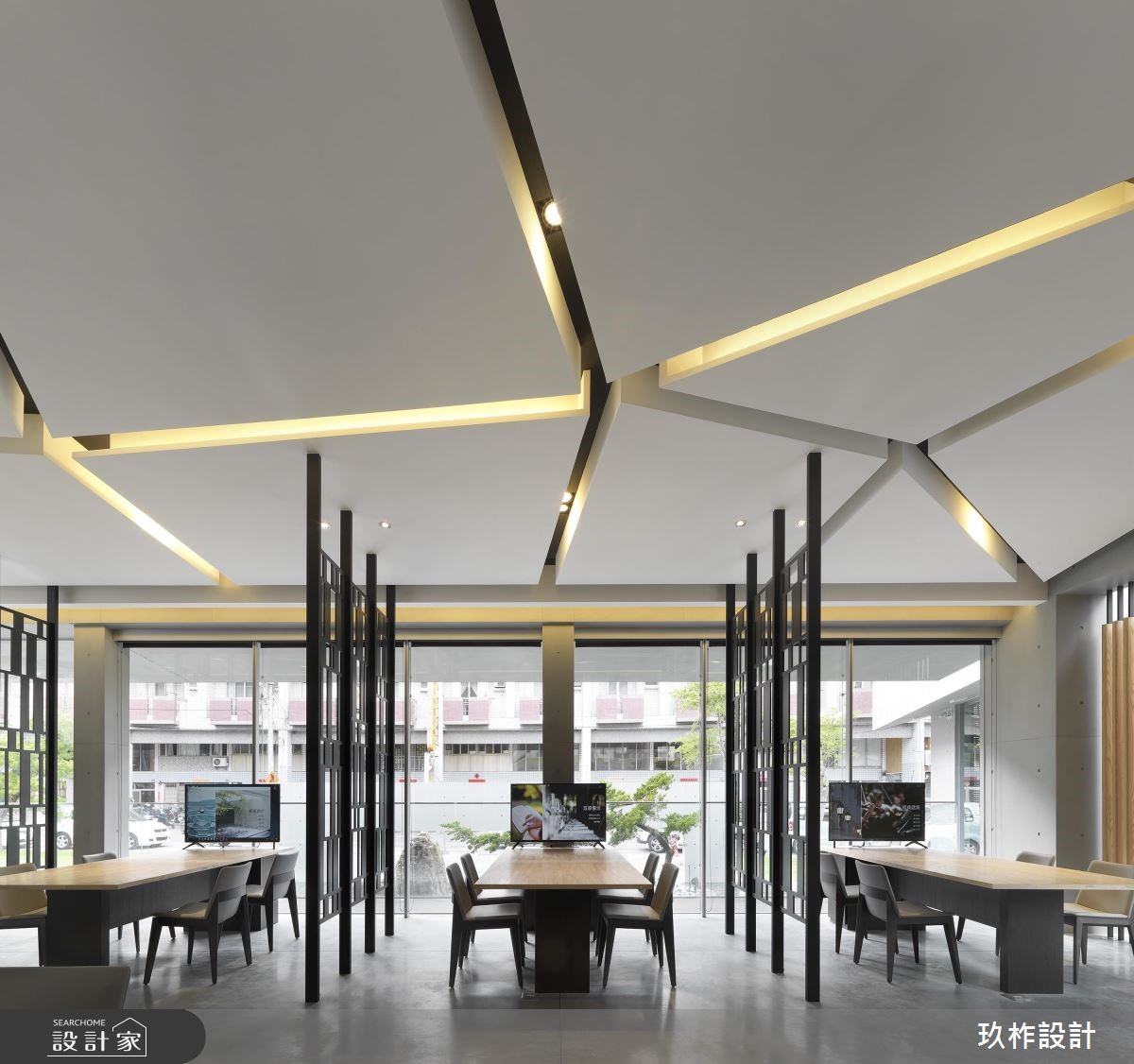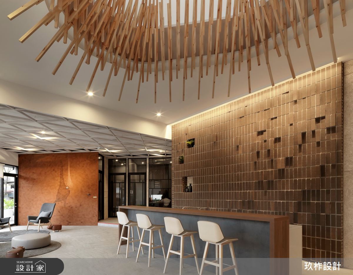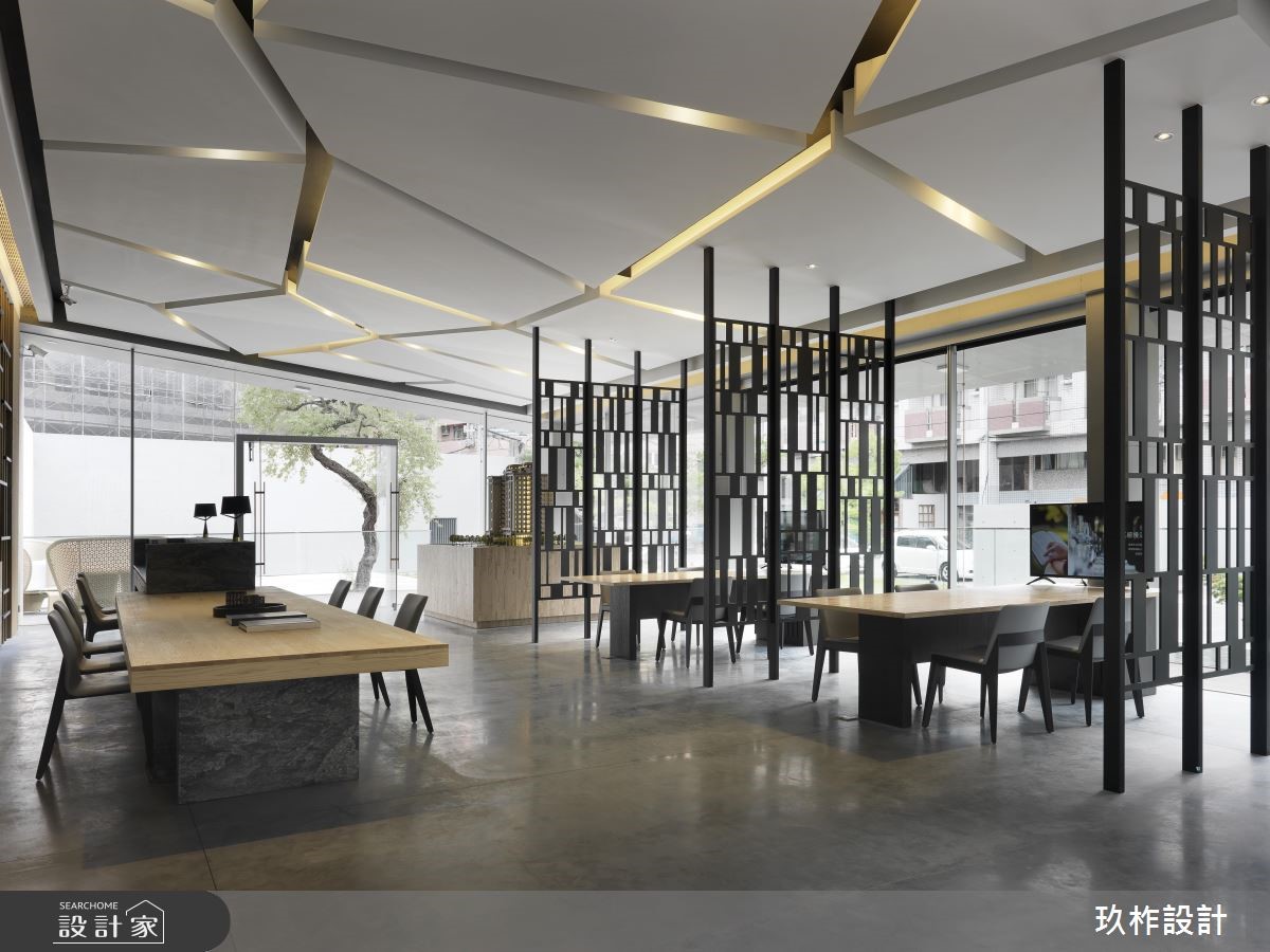 腹地寬敞的公共空間中,設計團隊將在地的山林美景作為設計靈感,80坪的空間四面採落地玻璃設計,讓戶外的庭園景緻映入室內,鐵件打造成的屏風比擬連綿山巒,虛實的切割設計讓視線產生豐富的變化性,安置在鐵件屏風之間的一張張長桌,提供住戶閱讀、待客以及會議體論的彈性空間。天花板不規則的切線搭配燈帶設計,像是天光從層疊白雲的縫隙灑落,優美而富含詩意;另一面以頂天木格收納系統展現人文風情,石材櫃檯與原木長桌相連,展現山石堆疊的層次。另一區獨立的會客室以百頁增加隱私性,灰黑色系的沙發與家具,讓空間顯得沈穩,搭配一面藝術牆上的抽象畫作,在室內空間裡也能感受到遠山、雲霧與綿雨的優美意境。