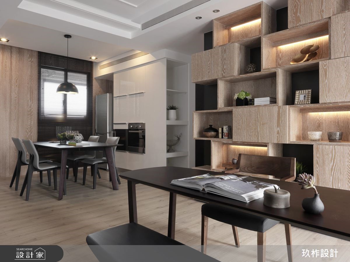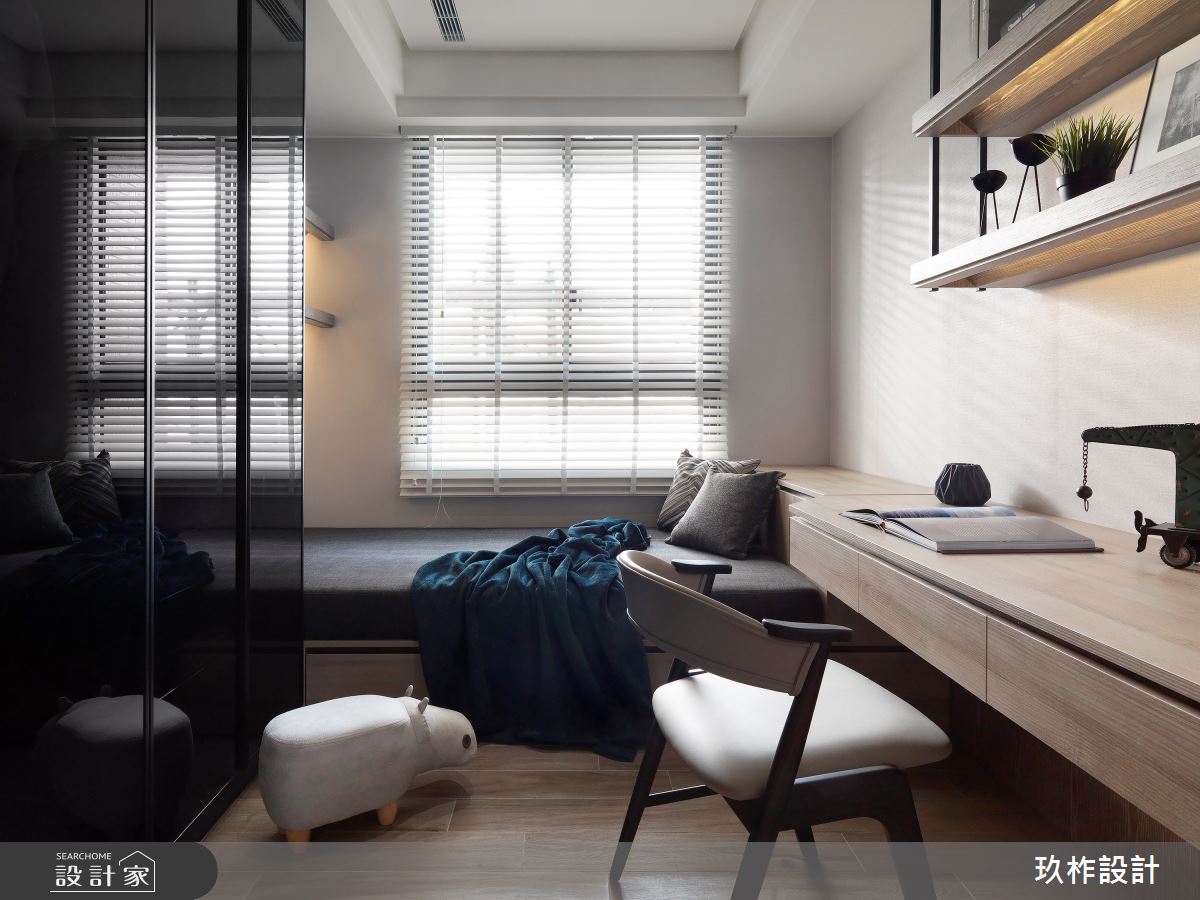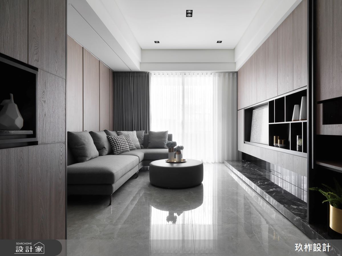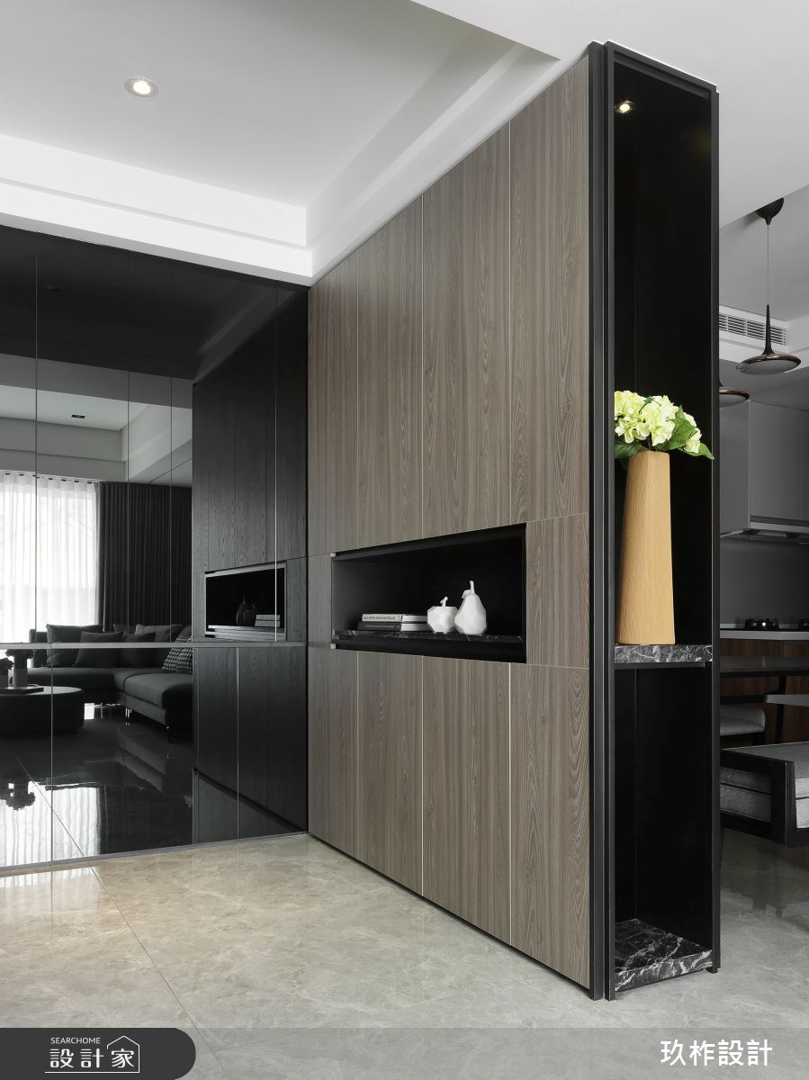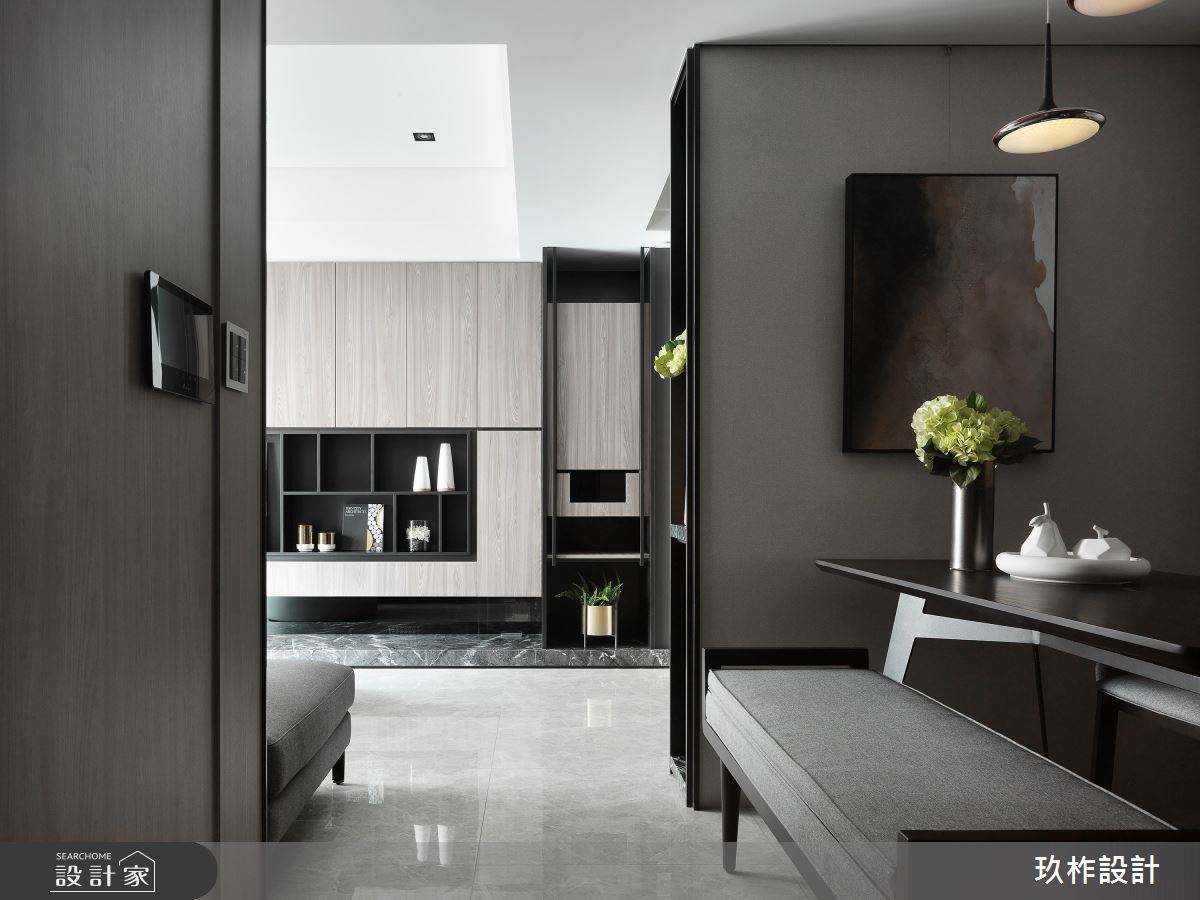 小宅該如何劃分格局,才能顯大,又能兼顧到風水?這間 20 坪現代宅以暖灰色為主調,透過各種材質的變化,讓空間在統一的色彩中,呈現豐富的層次。設計師在入門處規劃中央及側邊都鏤空的收納櫃,劃分出玄關和餐廳的界線,又能避免開門見灶的風水疑慮;一旁整面黑鏡除了延伸空間感外,也隱藏了收納機能,將空間利用到極致,又不會顯得壓迫。客廳電視牆藉由石材、木質、鏡面和鐵件的混搭,塑造能夠擺放裝飾品的美感牆面。由於公領域採取開放式設計,因此原先較為昏暗的餐廳,也能迎接明亮的自然光,使人擁有舒適寬敞的用餐環境。位於走廊底部的主臥,在灰色床頭牆隱藏收納櫃,並配合床尾的大型衣櫃與梳妝檯,讓休息時光既方便又愜意。次臥自床頭櫃、書桌到床架,皆設置完善的收納空間,徹底滿足小空間放大的實際需求。