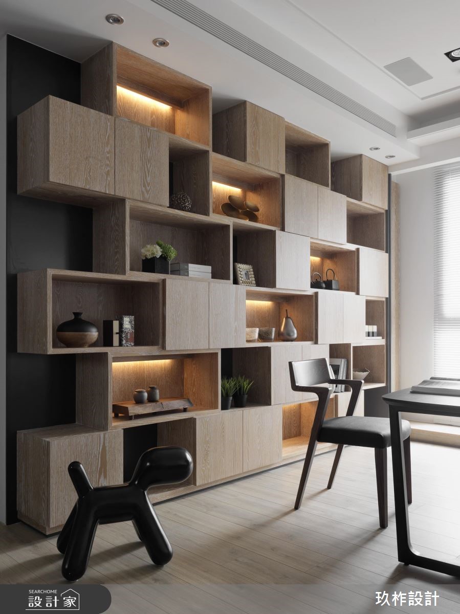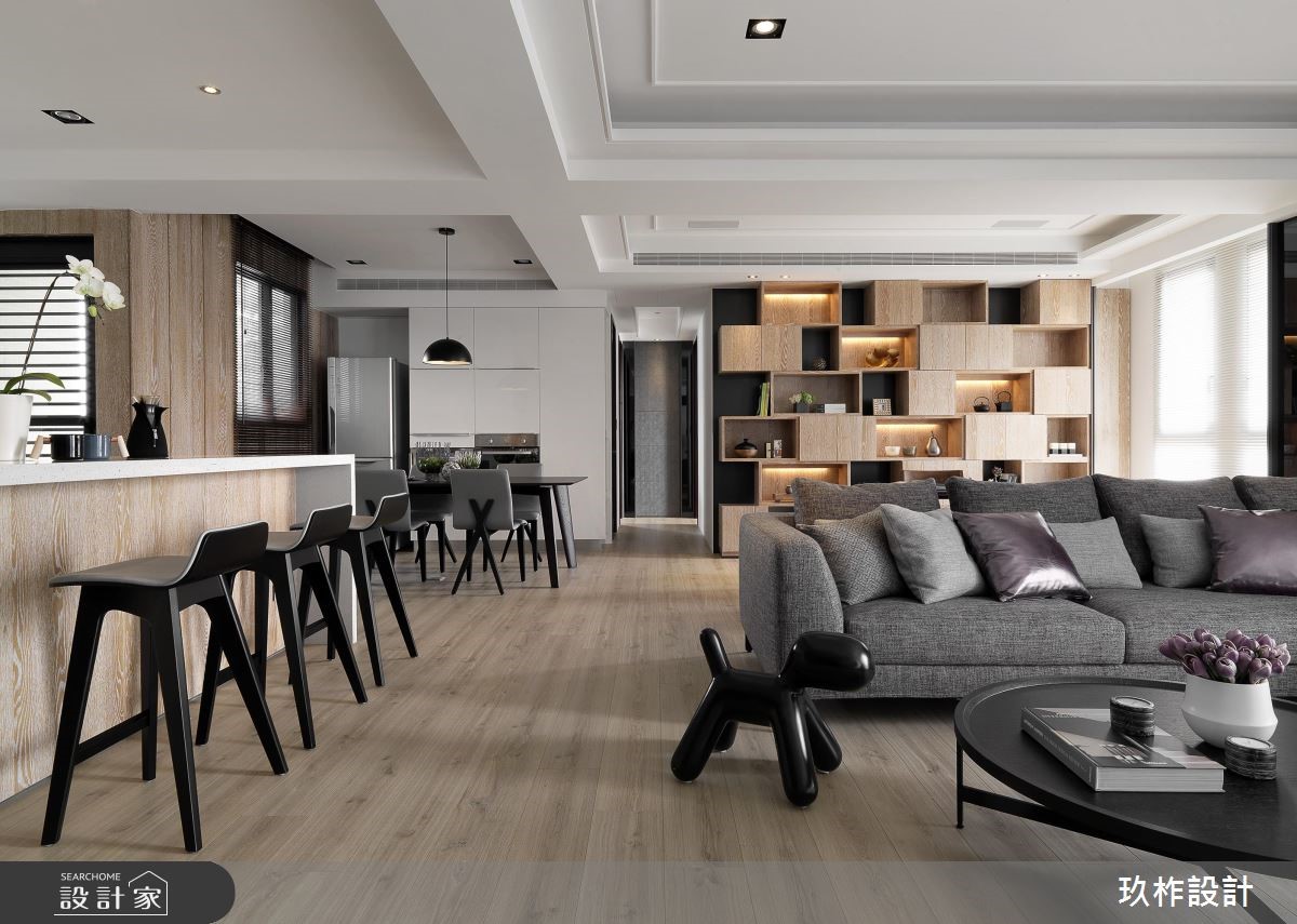 40坪的現代風居家,客變期間即將原有四房變更為兩房,並考慮屋主實際的生活需求,選擇將空間釋放出來,打造明亮而寬敞的整體空間視覺感受,而此住宅也作為退休宅使用,考量到屋主平常喜歡閱讀、鑽研茶藝,特意依循其興趣,在休閒區規劃一處木質調展示收納櫃,不僅具有收納功能,也能分享屋主的各式收藏;在開闊的空間尺度中,挹注優美的姿態,讓居住者可與空間產生溫柔的對話,讓住宅不只是五感,而能享受到更多的生活。