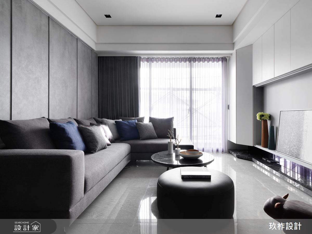 空間以大量灰白色作為主軸,搭配溫潤木質地板,勾勒出俐落閒適感,並給予現代簡約的元素,不做過多的複雜裝飾,於公領域大量採用大理石材,與溫潤木質地板形成冷暖交融,主牆大理石更勾勒獨特的分割線條,讓牆體更具立體層次,客廳沙發也特地挑選加大尺寸,瞬間提升廳區的大器感;廚房區域,則配置玻璃拉門促成光線穿透,並顧阻隔油煙功能,讓空間使用更具彈性;主臥房,承襲著輕盈的灰白調性,並沿牆面配置閱讀木桌,替房間挹注更多的使用功能。
