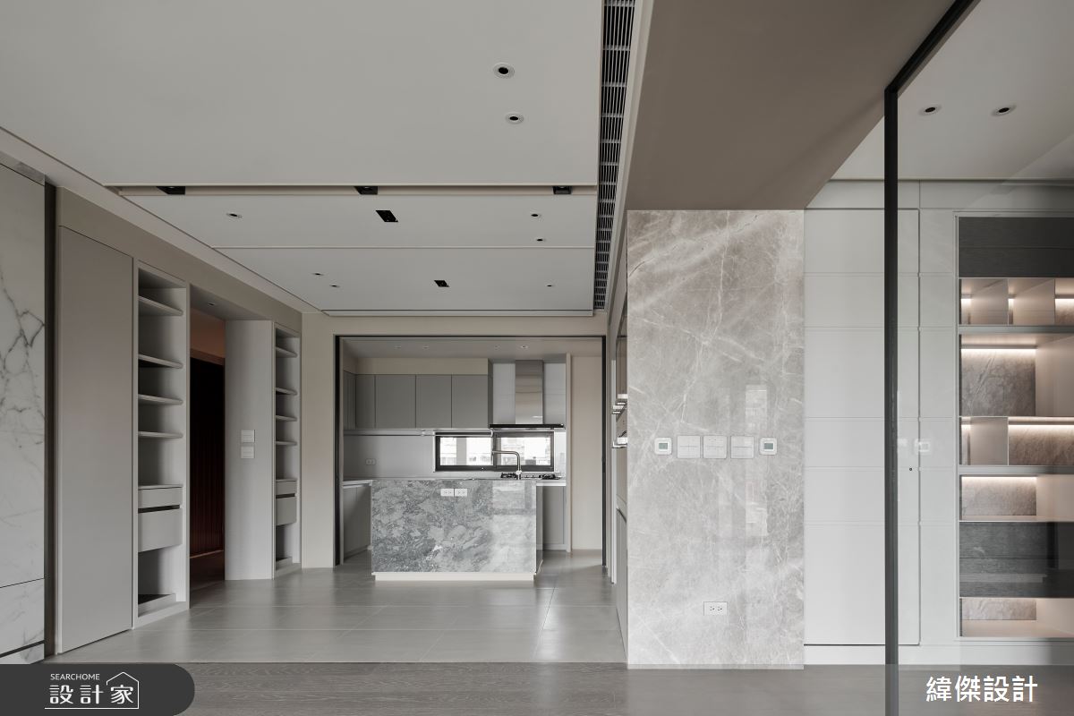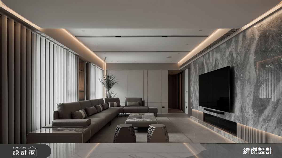 來自緯傑設計的124坪現代風住宅案,屋主一家人共有2位大人、3位小孩,是一間單層預售屋的六房以上格局,設計師藉由建材以油漆、大理石的搭配應用,實現一家人的理想生活。