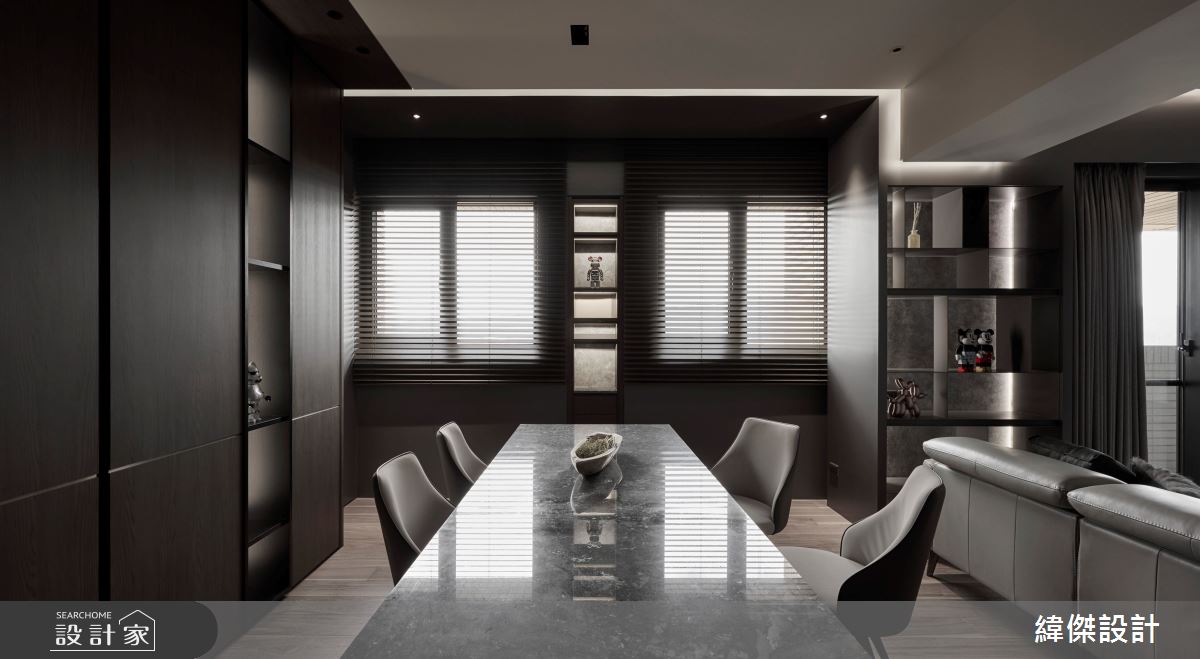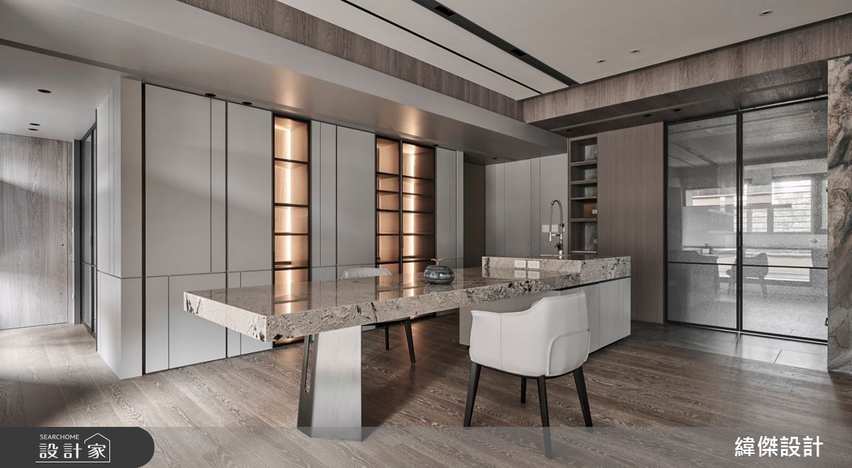 來自緯傑設計的50坪奢華風住宅案,是一間單層中古屋(5~15年)的三房格局,設計師藉由建材以木地板、鐵件、石材、木皮的搭配應用,實現一家人的理想生活。