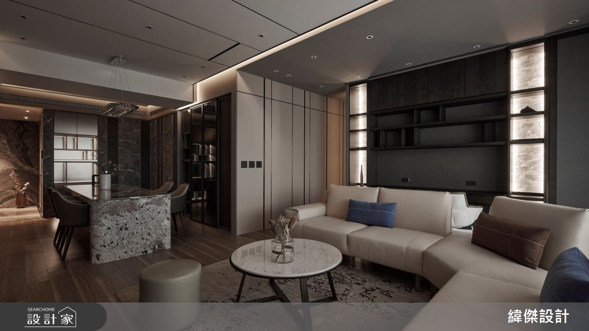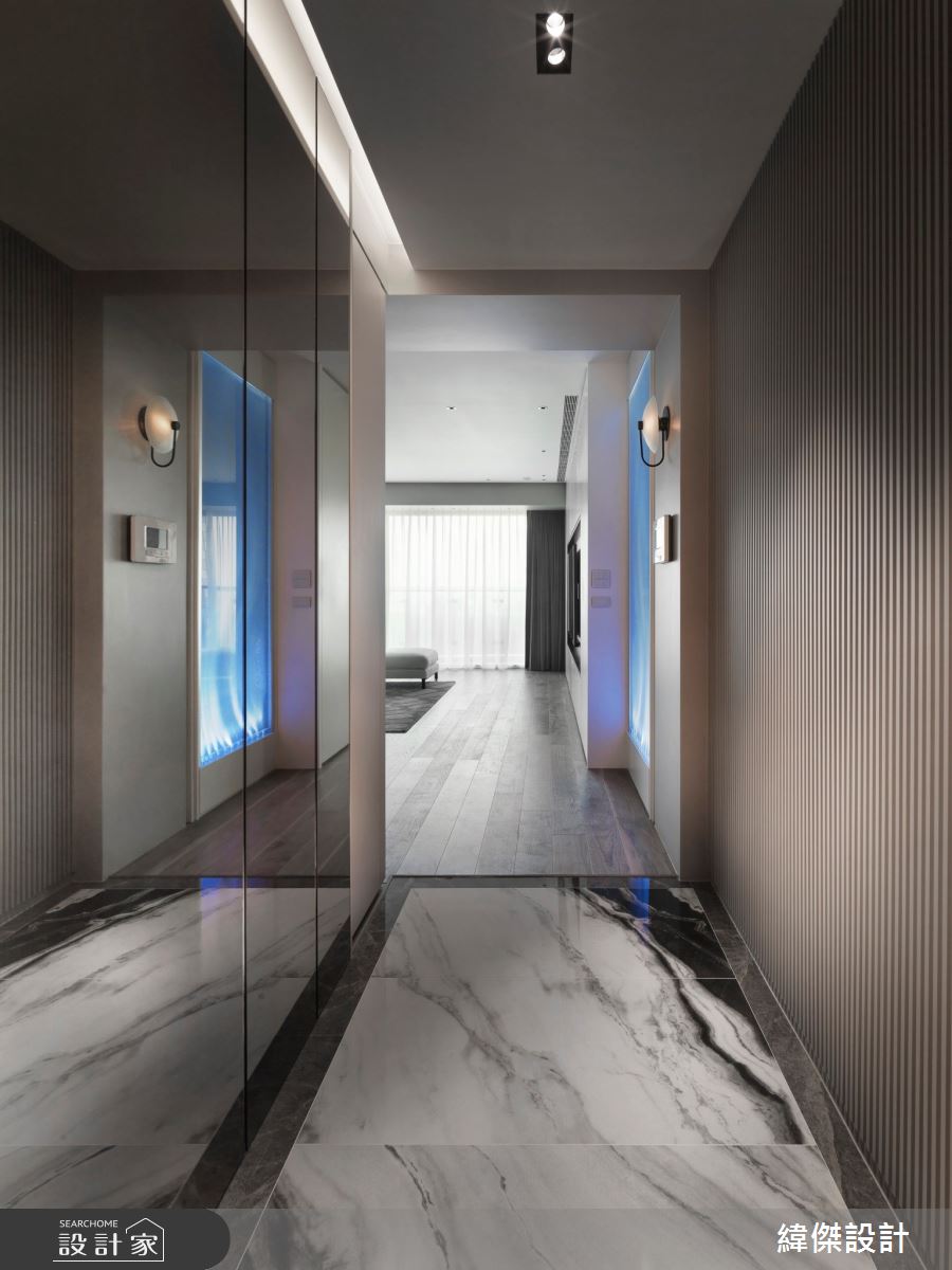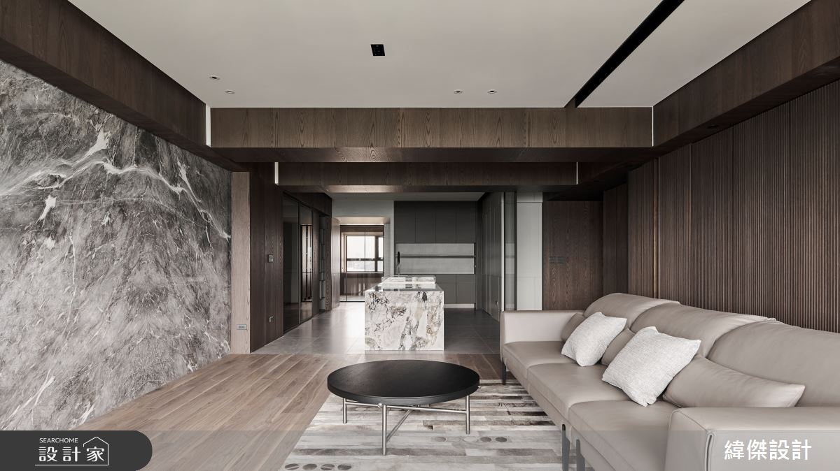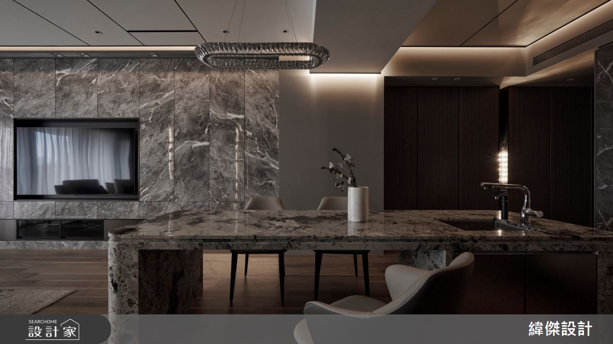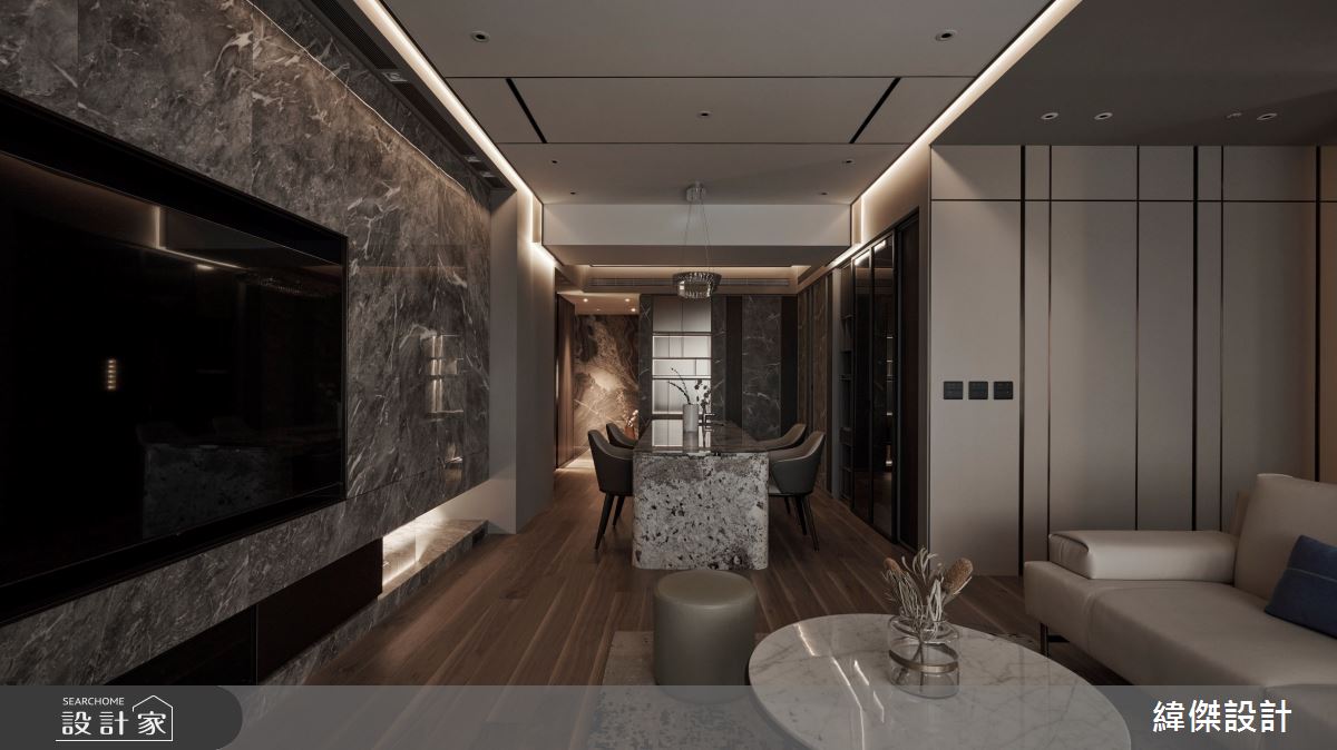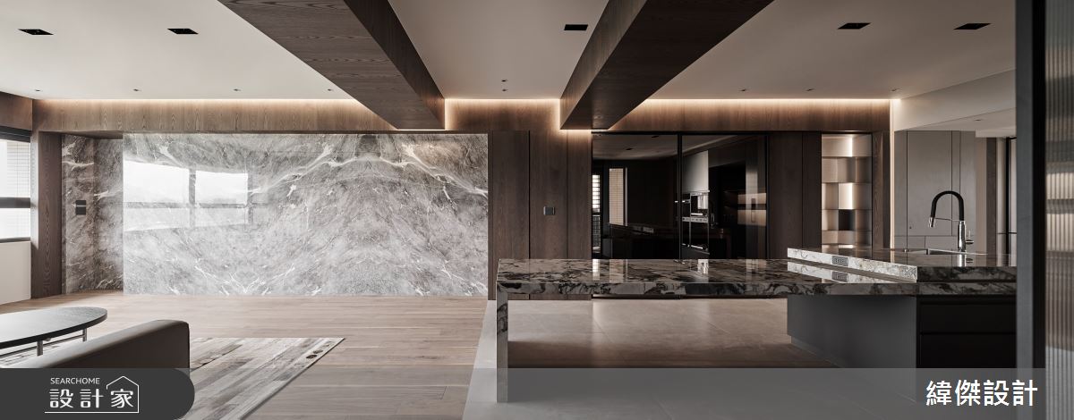 緯傑設計以大理石、壁布、鍍鈦金屬、實木皮、人造石、繃布、噴漆、花崗岩、茶鏡的搭配應用,呈現現代風居家氛圍,將此間30坪、三房、單層、新成屋(5年以下)打造成舒適愜意的家庭空間,完成全家人的夢想之居。