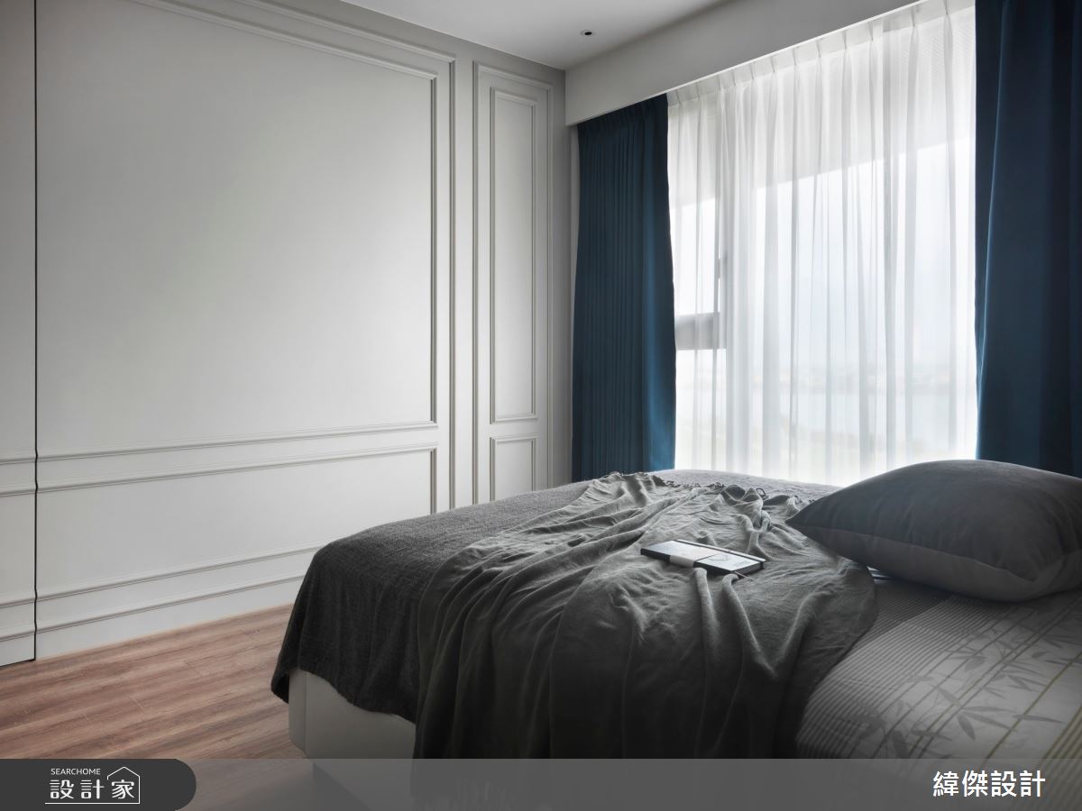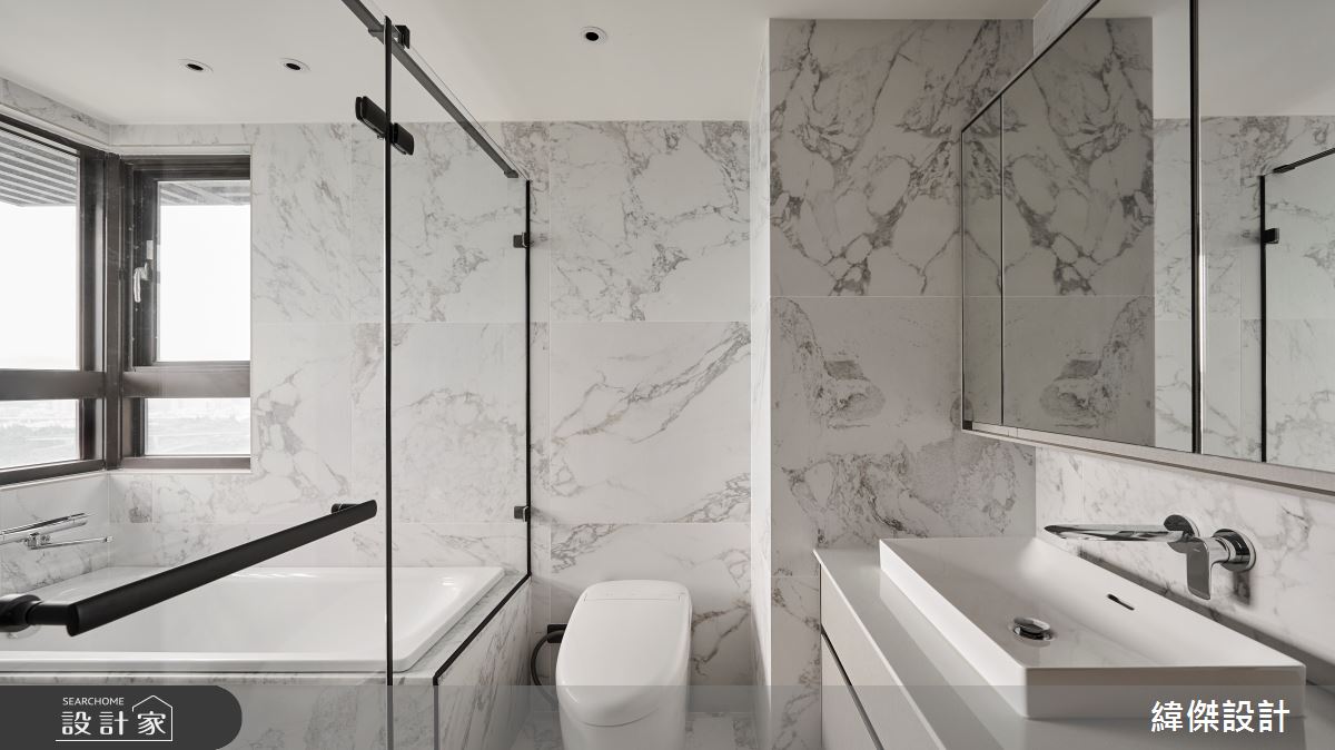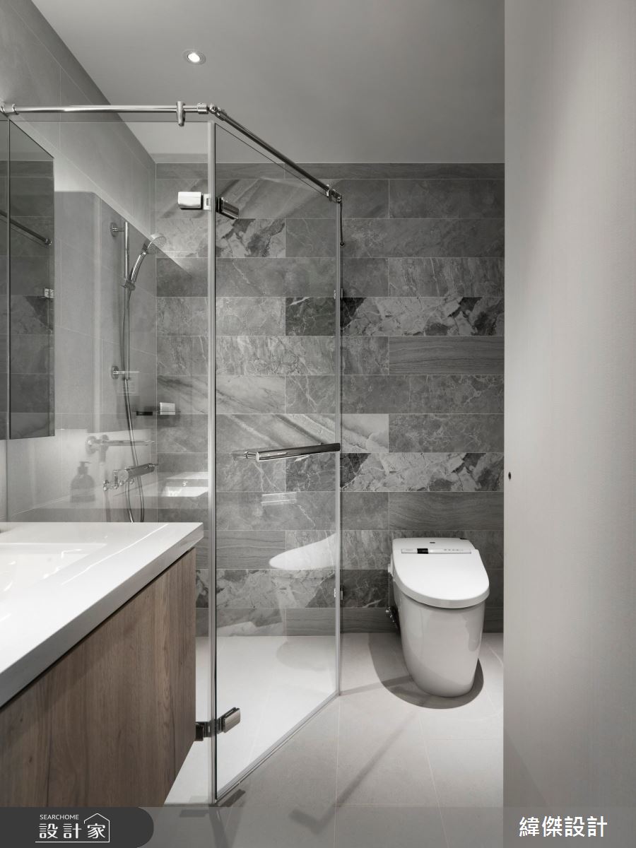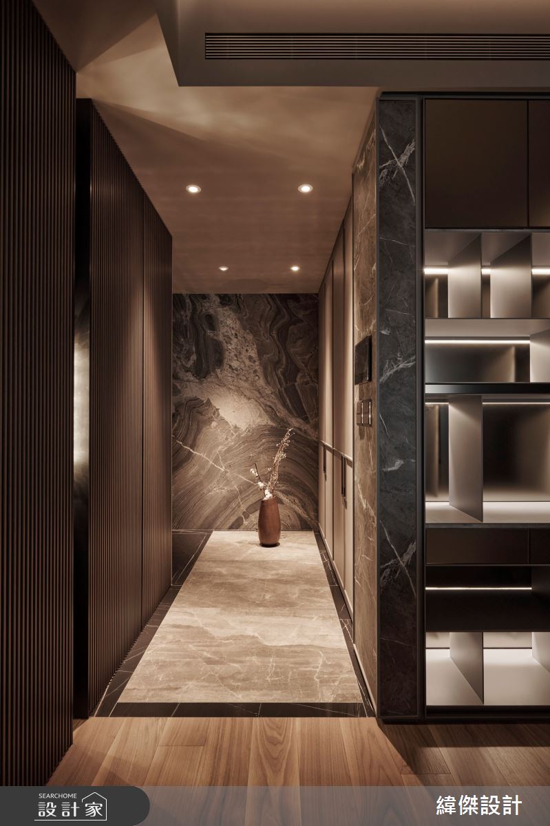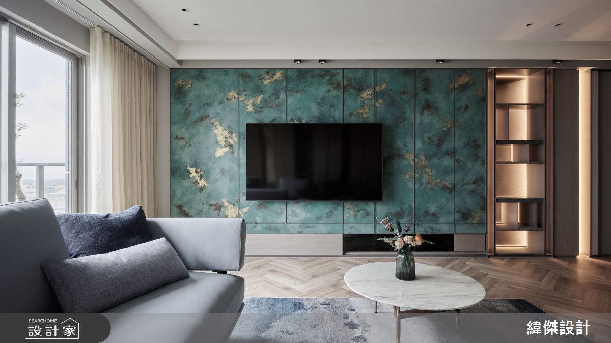 緯傑設計以大理石、壁布、鍍鈦金屬、實木皮、人造石、繃布、噴漆、花崗岩、茶鏡的搭配應用,呈現現代風居家氛圍,將此間30坪、三房、單層、新成屋(5年以下)打造成舒適愜意的家庭空間,完成全家人的夢想之居。
