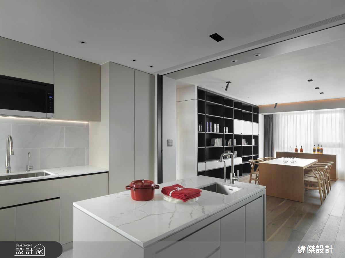 緯傑設計以海島型木地板、鐵件、烤漆、實木皮、美耐板的搭配應用,呈現現代風居家氛圍,將此間21坪、兩房、單層、新成屋(5年以下)打造成舒適愜意的家庭空間,完成2位大人全家人的夢想之居。