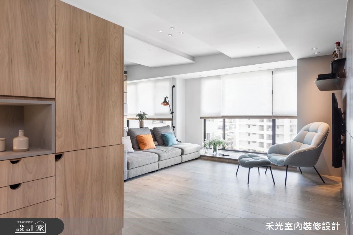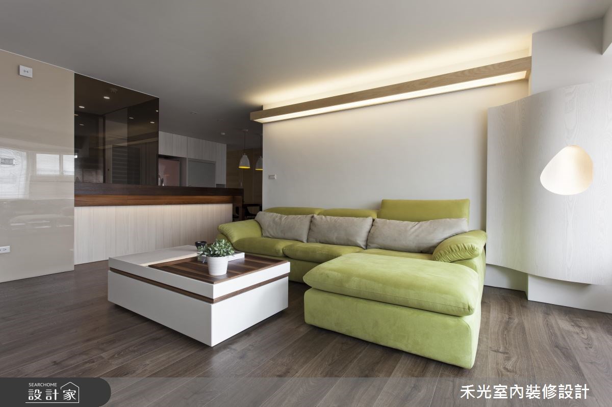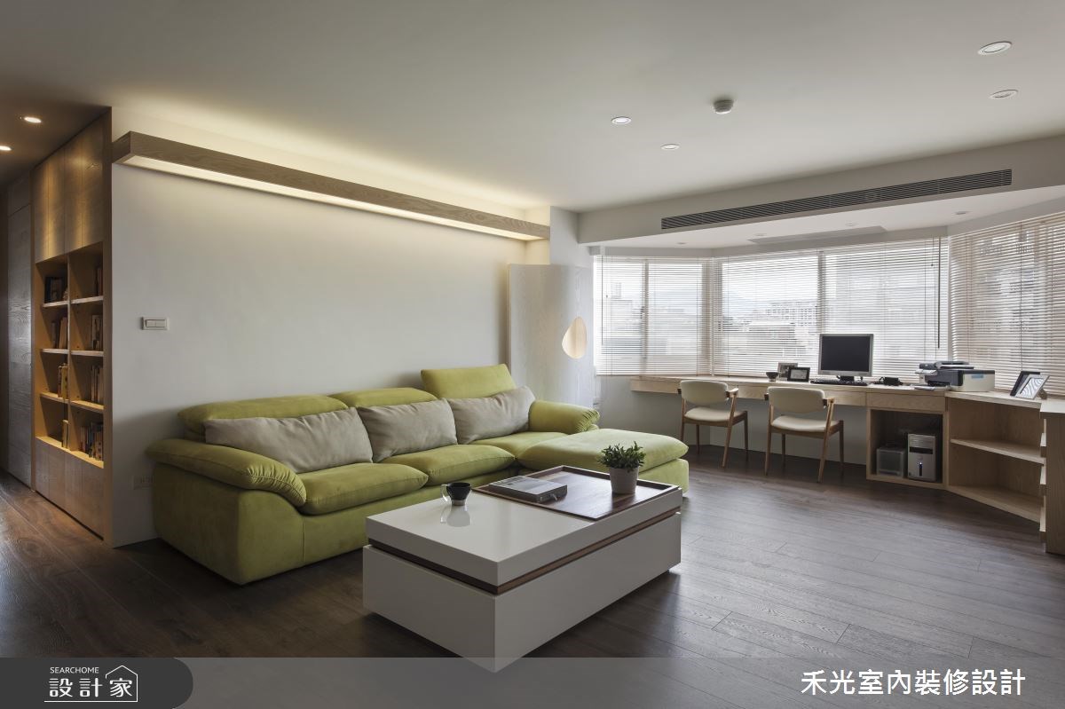 38 坪簡約風格宅,公共空間以開放式設計,讓日光、空氣及對話得以暢行無阻,而全室以木質地坪的鋪排營造溫暖居家氛圍,線條與間接光源的絕妙搭配,則展現純白立面及天花頂部俐落、有趣又時尚的空間表情。 玄關處無明顯的場域分界,以客廳及廊道延伸的懸空木作櫃體作為玄關收納物品處,視線也不自覺被木櫃引導入室;客廳區電視牆櫃的特殊造型線條搭佐柔和溫暖的間接燈光設計,賦予立面簡約又帶有趣味層次感,並在空間正中央擺置一張 L 型沙發讓視野更加寬敞;緊接沙發後方的開放式書房背牆延伸至天花板處,以黑色格線內崁間接燈光,並連結廊道骨牌般設計的立面展示收納,劃出家的時尚表情;餐廚區運用文化石牆混搭純白廚具跳色設計,框出場域特色;臥鋪區正面迎來和煦日光,灑進粉嫩色壁面的臥房空間,加乘私領域紓壓、放鬆氣息。 小編的最愛 隱身於書房後方的多功能空間無高低差木地坪的設計,為屋主做瑜珈的最佳場所,兩道門中的其中一道開啟即與客廳區臥榻相連結,延伸放大兩空間的使用範圍。