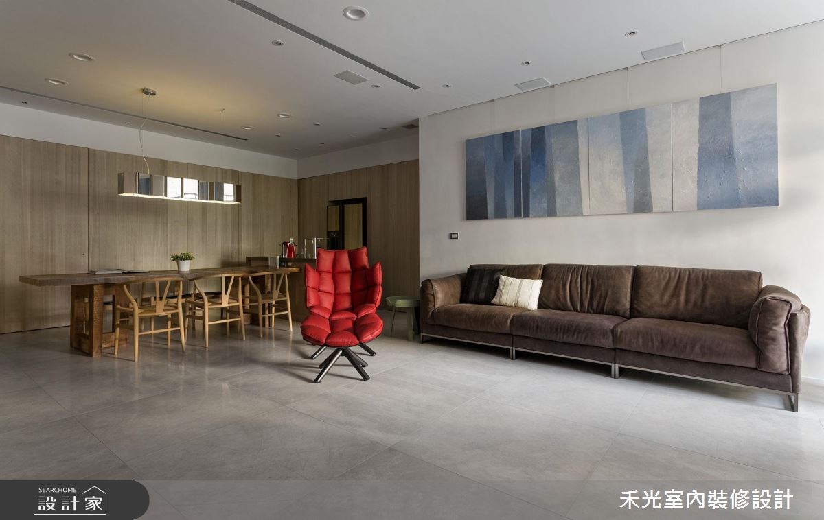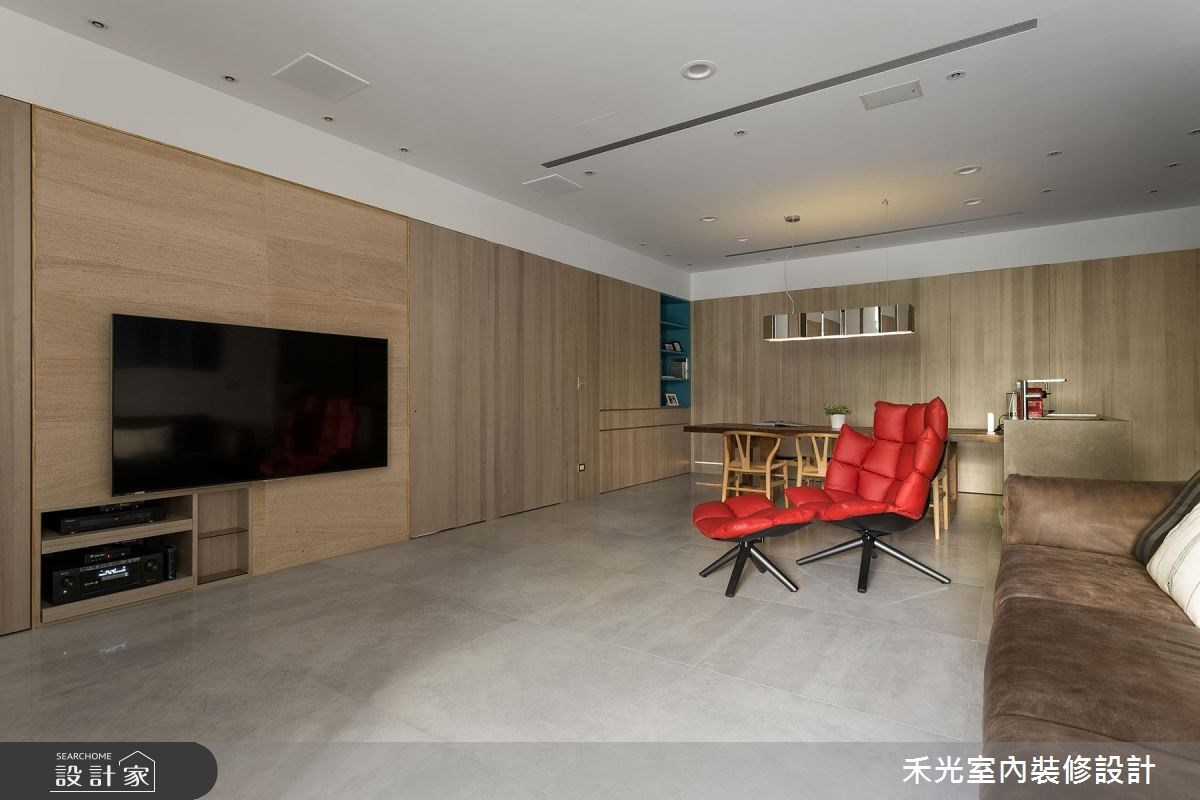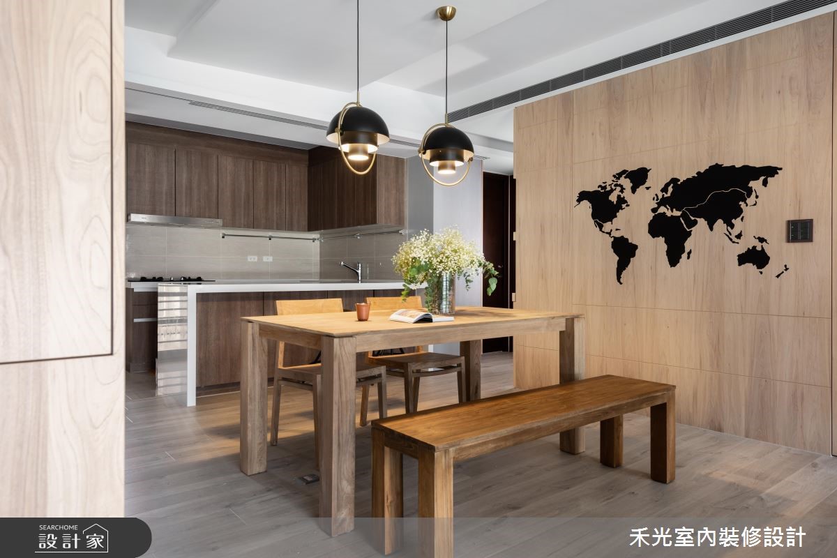 居住在 40 坪老屋的一家五口,因為 3 個孩子需要大量收納需求,加上舊屋有著容易潮濕、採光不佳的問題,屋主希望設計師可以解決綜合型問題,許一家人寬敞舒適的甜蜜居家! 設計師變更既有格局與動線,打通原本陰暗幽閉的玄關,援引唯一的光線來源至開放式客餐廳空間,同時將收納機能與木皮牆面結合,讓日光順著牆面由外而內包覆整個開放式空間,為現代風格營造溫潤木感。拆除阻擋出入動線的牆片,以黃金木化石作為電視牆面,並利用蘊含自然紋理的檜木拼打造隱藏門片,不著痕跡的注入俐落與簡潔;同時,設計師抹除沙發背牆的轉折牆面,適時留白,佐以畫作與燈飾增添藝術感,將簡約美感歸還居家空間。 開放餐廳由吧台與實木長桌結合,以 T 字型描繪了歡聚的藍圖,延續親子天倫溫馨時光,顯得寬敞毫無隔閡。現代感十足的一字型廚房利用天空藍色調系統櫃增添童趣,讓廚房設計與單調成為絕緣體!主臥調和甜美色調與溫潤木質,更善用巧思,將邊几設計為嵌入牆面的層板;而衛浴則利用木紋磚與板岩磚營造大器成熟的層次感。 小編的最愛 抹去不必要的空間隔閡、去除繁複的動線與裝飾,設計師將自然通透回歸居家空間,讓大人小孩可以盡情在充滿陽光與笑意的開放式居家環境開心玩樂!