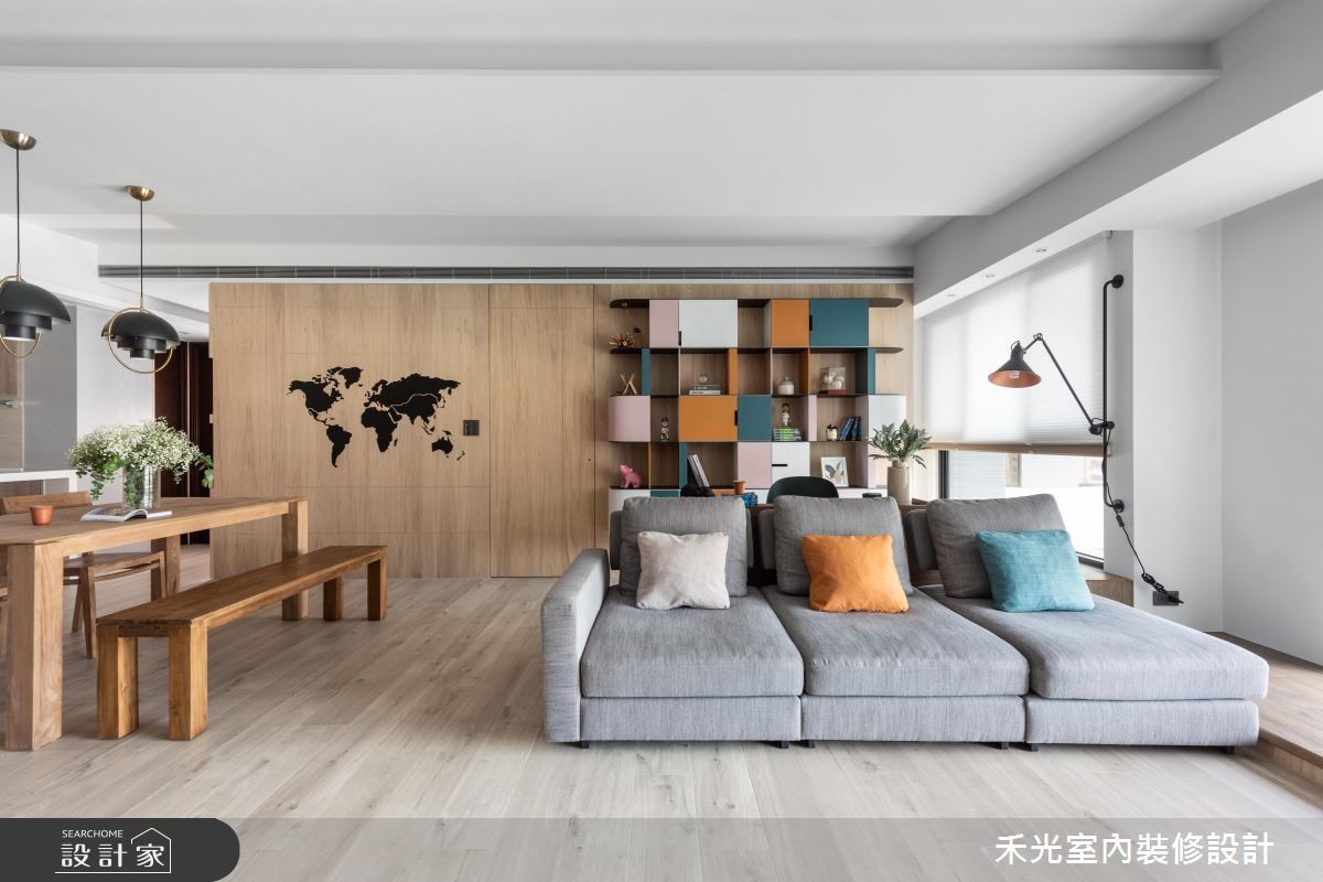 36 坪休閒風居家,設計師針對屋主夫妻的生活需求,於空間內加入合適的收納機能,並變更主臥隔間、改變入口位置,額外增添一間女主人的更衣間,同時以獨到的色彩美學貫穿全室,打造出安心宜居的視野,快跟著小編一起來看看吧! 玄關區域,讓鞋櫃兼具屏風功能,加以花磚鋪陳地坪,定義入口落塵範圍,同時在牆面規劃黑板漆加鐵板,提供留言塗鴉的互動功能;公領域則針對天花大樑的問題,以造型屋頂作出修飾,搭配柔和燈光烘托,形成具層次感的頂上風景;並藉由延續的木質紋理,銜接客餐廚與書房,促成更為完整流暢的動線脈絡,而餐廳牆面則加入世界地圖圖案,將旅行的美化軌跡帶入生活之中;客廳後方的書房場域,除了坐擁明亮的好採光之外,也打造了吸睛的色彩櫃體,以鮮明的色彩交錯、圓潤的線條修飾,兼顧居家安全性與裝飾功能! 小編的最愛 主臥以淡雅色彩帶出舒適氛圍,並規劃具收納功能的窗邊臥榻,串聯至一旁的梳化檯,形成一體成形的機能規劃,讓起居生活更流暢!