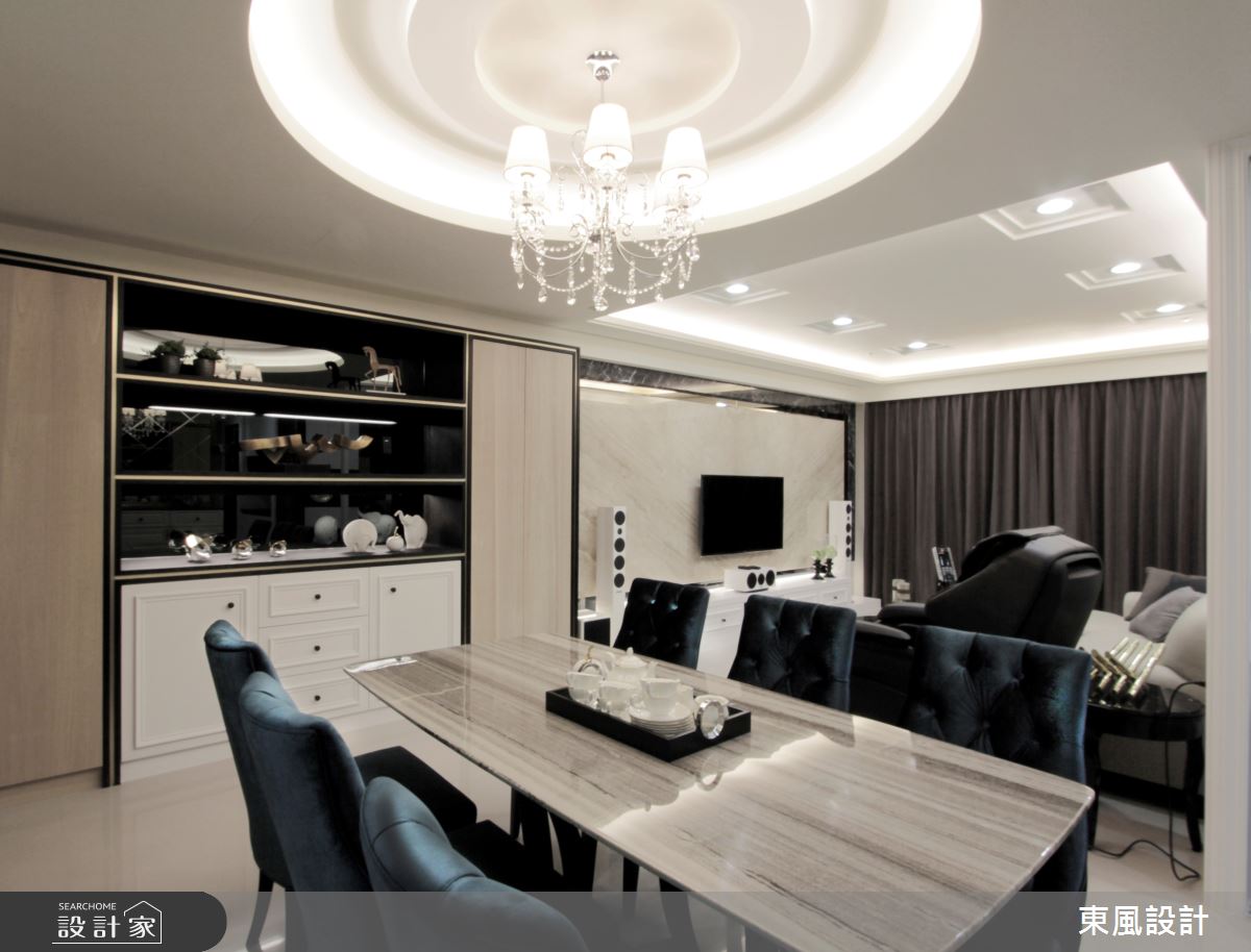 由東風室內設計精心規劃的80坪四房住宅空間,家庭成員一共有2位大人、3位小孩。因應屋主需求,設計師運用新古典作為主軸,搭配石材、實木皮、皮革、烤漆、繃布、德國系統櫃、鏡面、壁紙、鋁框拉門、烤漆玻璃,打造全家人的夢想家居。