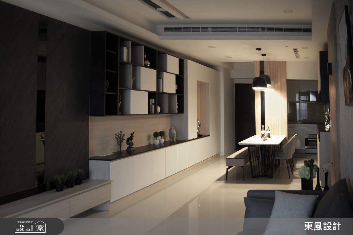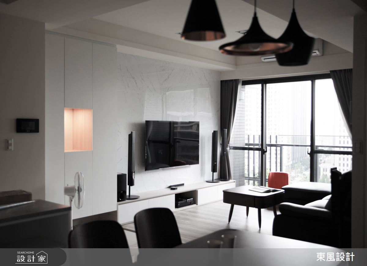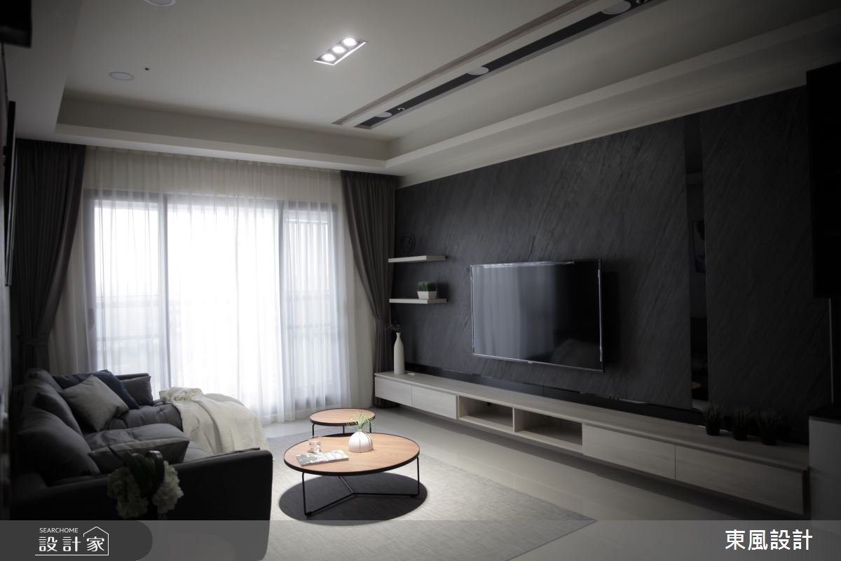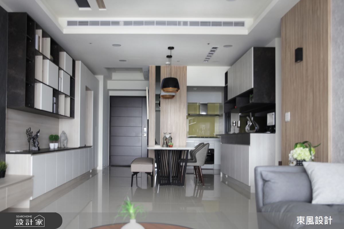 本案為東風室內設計的35坪現代風新成屋(5年以下)設計作品,格局為單層四房的居住空間。居住成員包含2位大人、2位小孩。全室建材的搭配,應用薄石板、實木皮、高級壁紙、德國系統櫃、黑鏡,展現溫馨的居家氛圍。