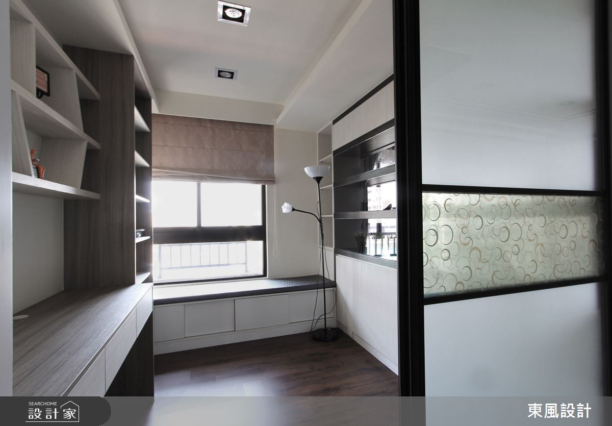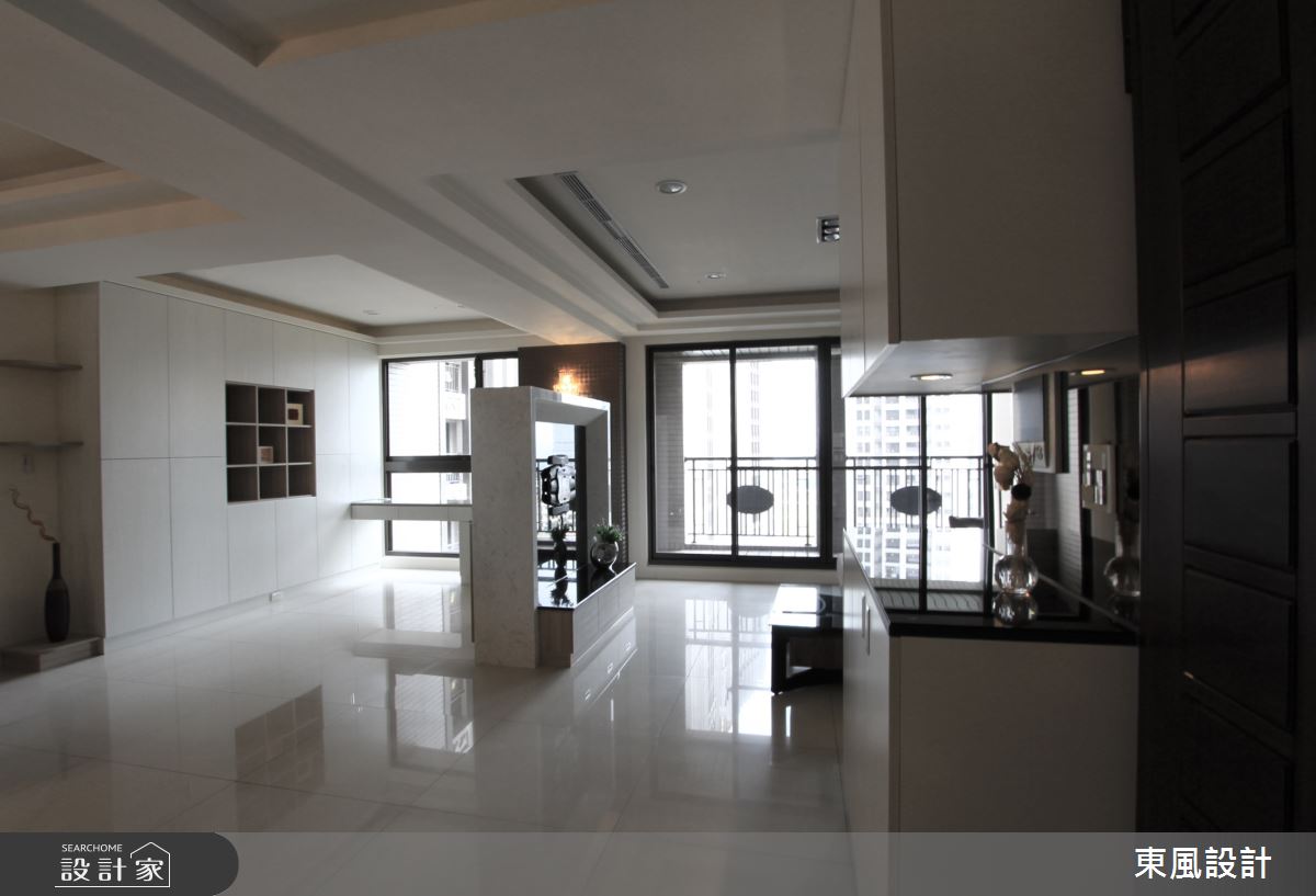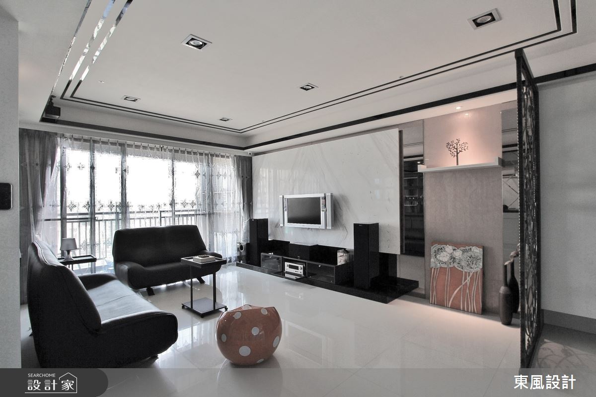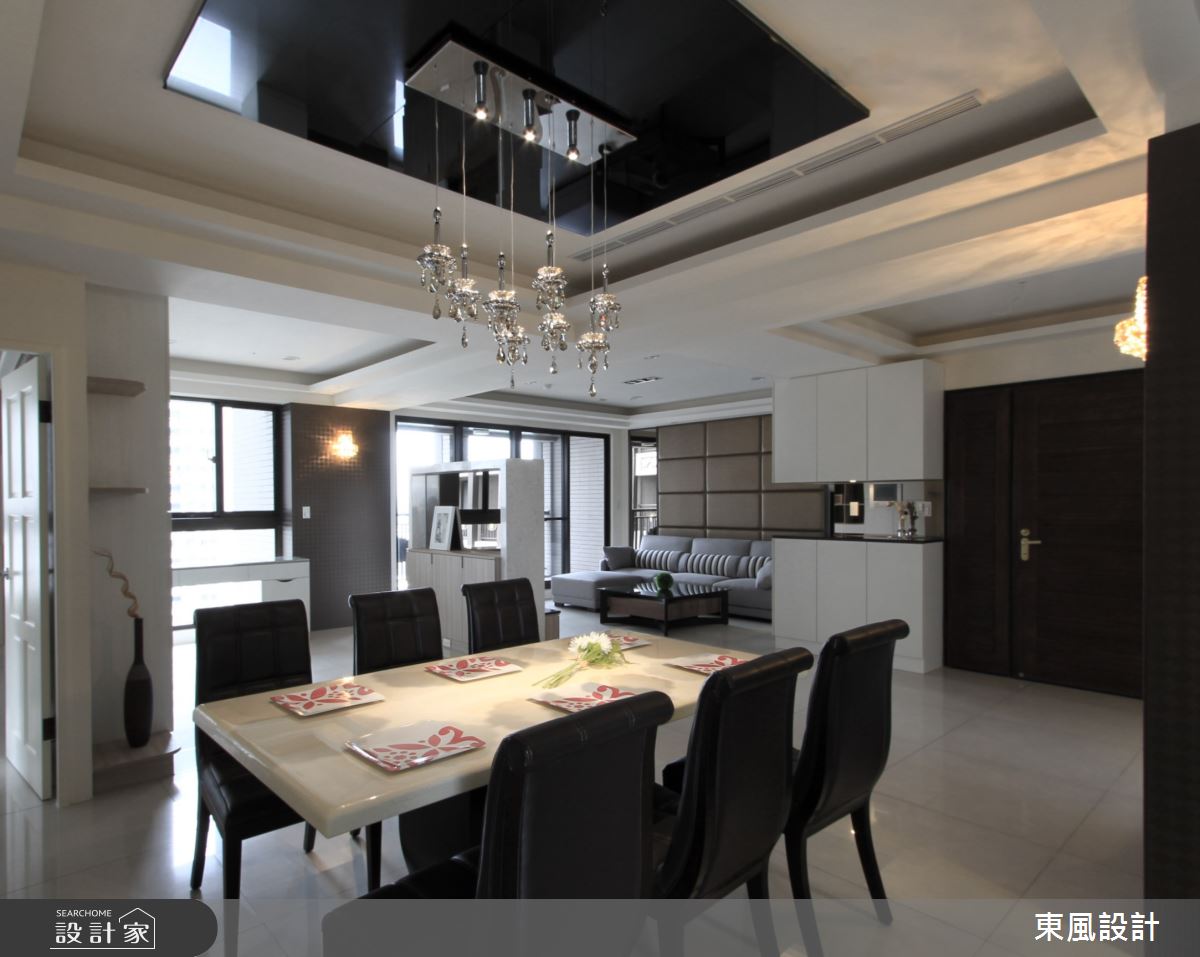 並非只有大坪數才能做出豪宅的奢華氣派感。在35坪的空間裡,玄關處前後錯列的系統櫃塑造出一個沒有壓迫的落塵區,沒有屏風阻擋下,內部空間顯得格外寬敞。天花板的層次雕刻與區塊排列,營造出低調而優雅的氣質;設計師更善用採光面,將陽台的窗景與自然光線引入室內,讓沈穩的空間自然散發寧靜典雅的氛圍。在人工光源的配置上,牆上的壁燈以及餐桌上方一盞水晶吊燈,打造猶如星級飯店的住宅體驗,黑鏡反射後延續空間高度與設計的精緻度。寢居空間走溫馨路線,木質與噴砂玻璃為主要設計,在柔美之中依然帶有現代奢華感。全室謹慎挑選建材,並在黑與白的配比拿捏,俐落的切線與斷點,完美詮釋出低調奢華的生活品味。