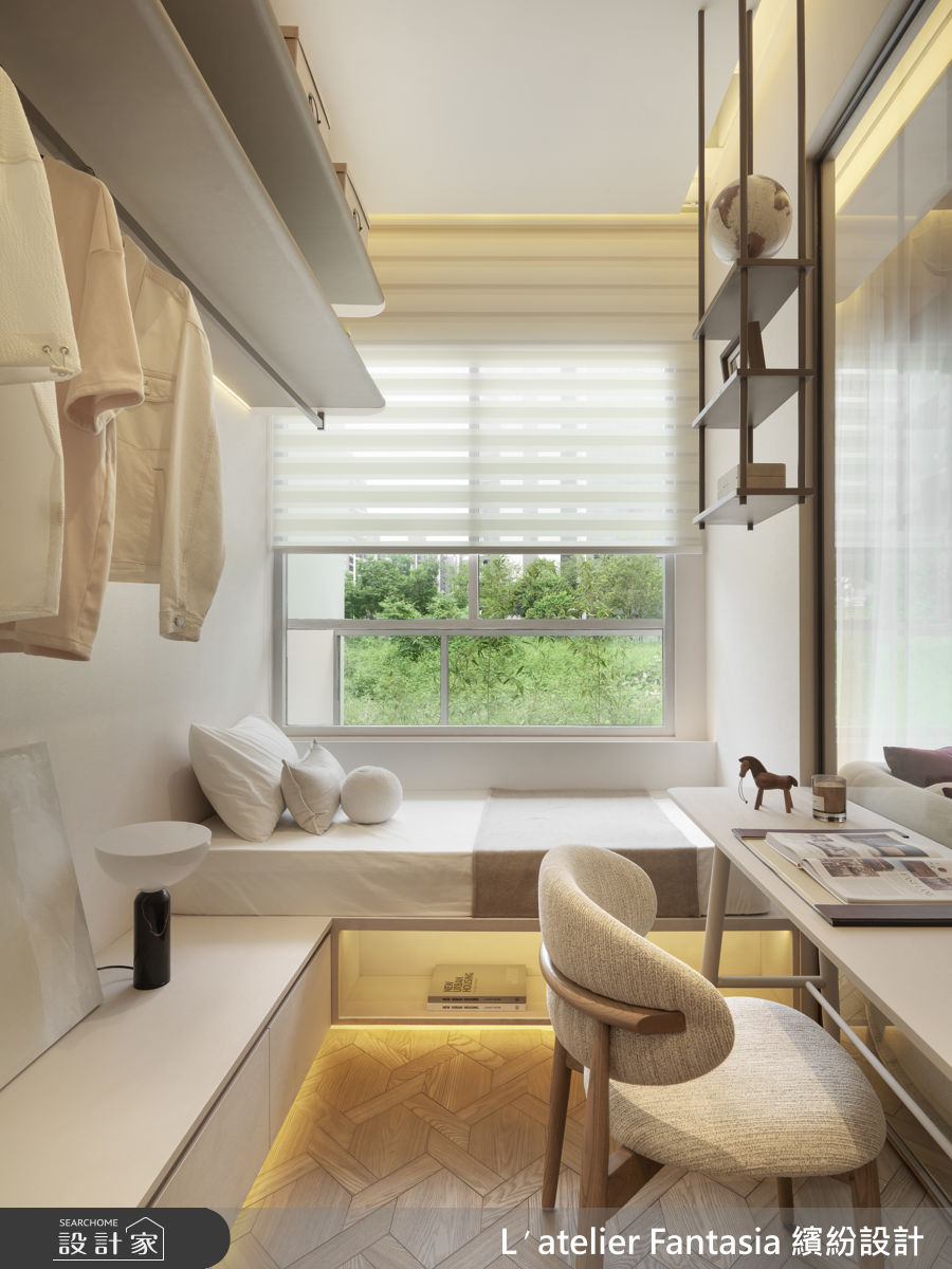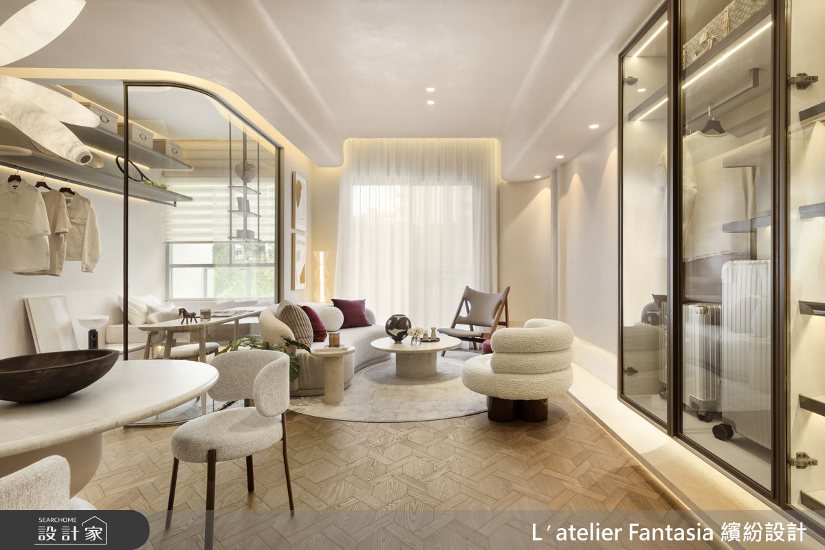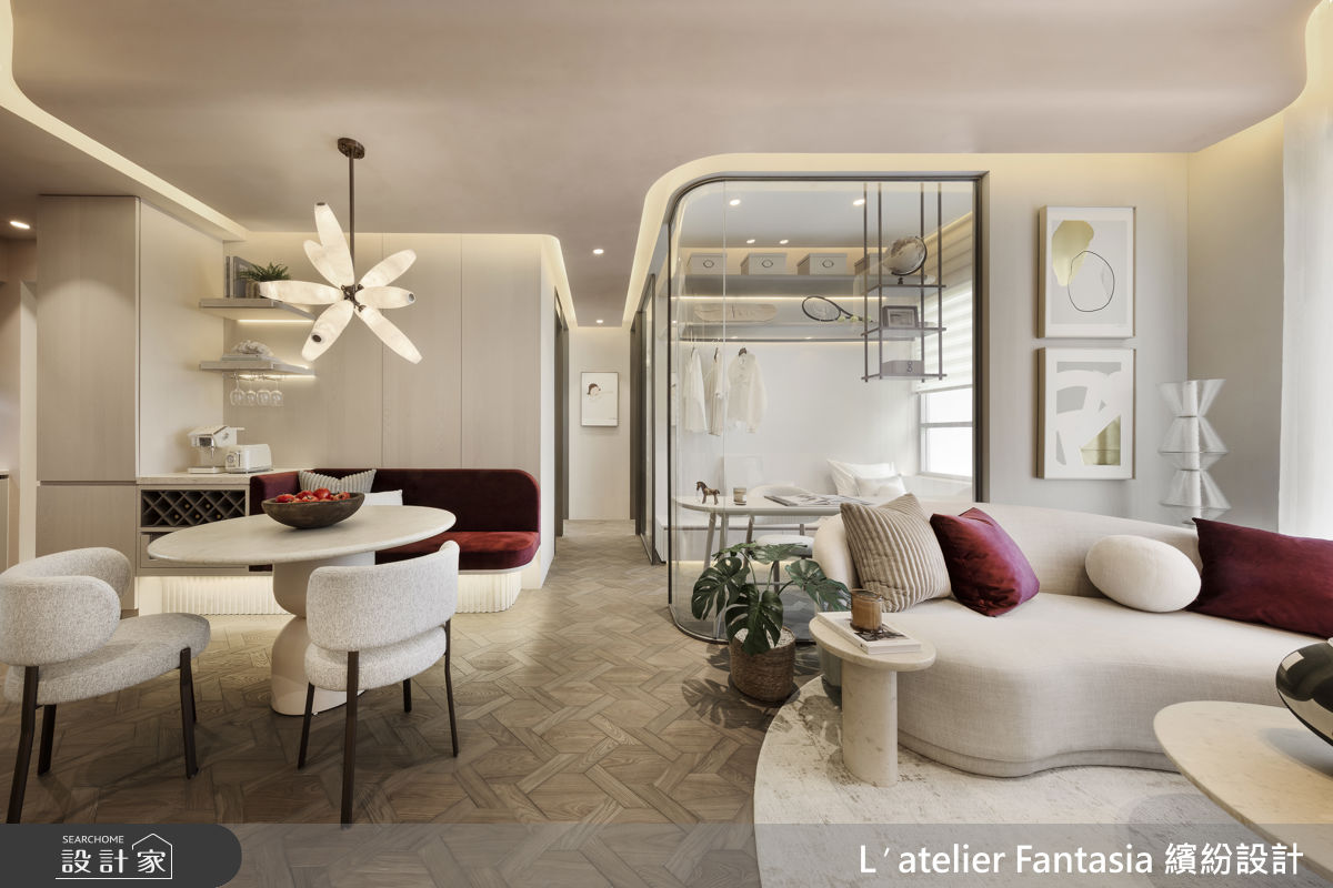 繽紛設計以大理石、鍍鈦、進口布料、特殊塗料、進口超耐磨木地板的搭配應用,呈現奶油法式風居家氛圍,將此間19坪、三房、單層打造成舒適愜意的家庭空間,完成全家人的夢想之居。