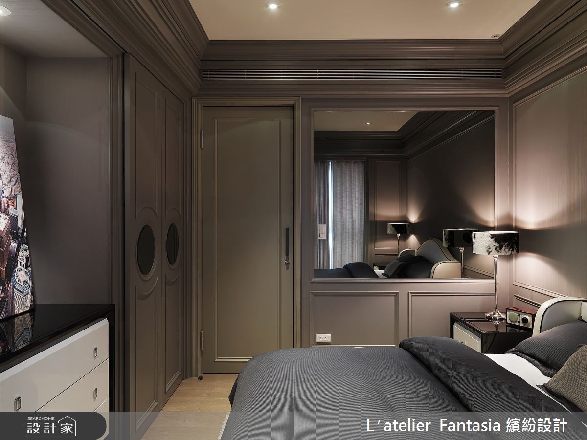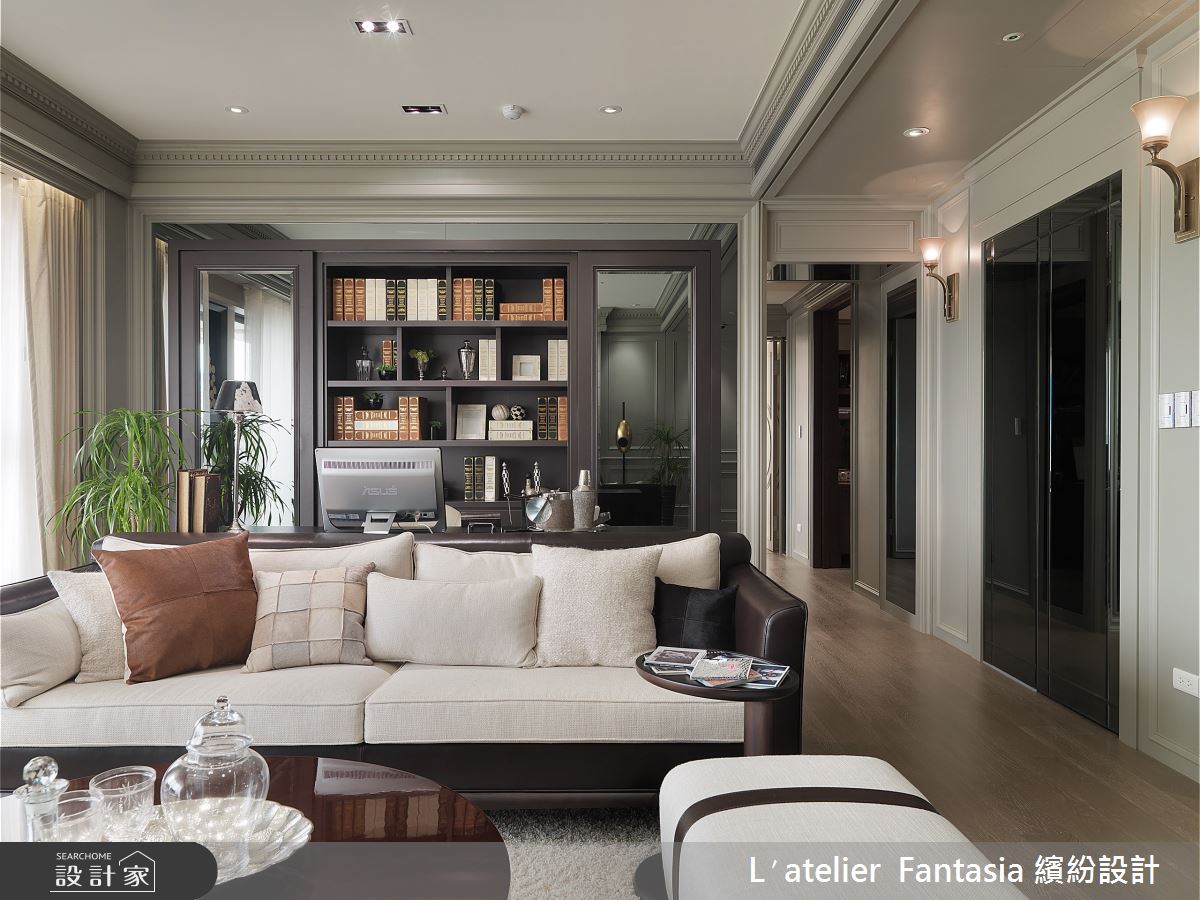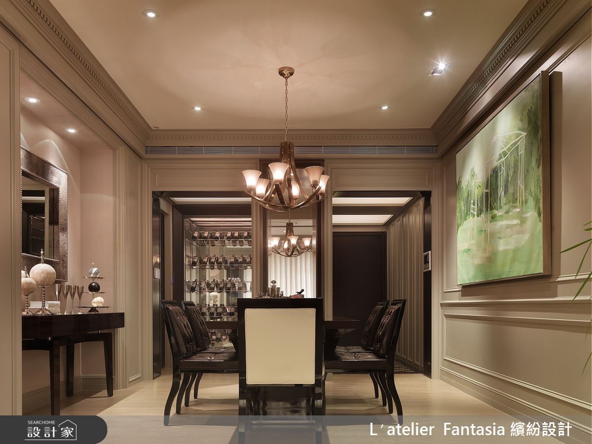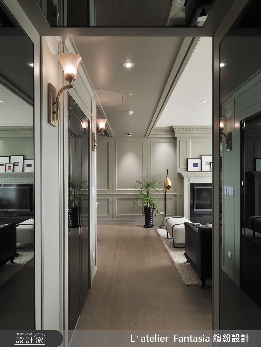 屋主希望在40坪的空間中營造出豪宅氛圍,大器而不俗氣。整體設計由一幅畫開始,特別從英國LIANGWEST藝廊進口的畫作,讓空間有了人文氣息與暖度。玄關的客製化大理石拼花讓朋友一入門就印象深刻,客餐廳、開放式書房的配置,搭配豐富化的鏡面設計,讓空間增添趣味感與放大空間效果。古典風格的經典壁爐,經過化繁為簡的線條設計與色系,呈現紐約上城現代風貌。廚房與餐廳中過渡空間的酒櫃設計,營造豪宅內才有的大器氛圍。整體空間的色調、線條與材質都由餐廳中的畫作開始延伸發想,貫徹繽紛獨有的「發散式設計」理念。主要建材:客製大理石拼花、木皮、木地板、古典線板、噴漆、灰鏡、茶鏡、鐵件、貝殼板、進口壁紙、進口家具、手工畫框、全室自動化控制系統。