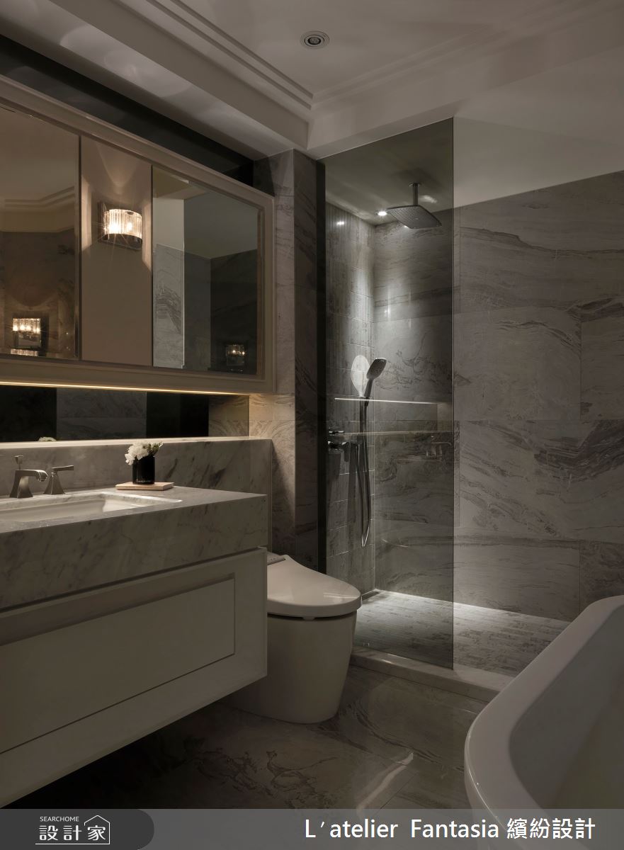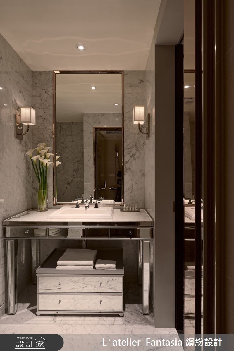 僅僅 23.4 坪,可以擁有怎樣的奢華體驗?在小空間居宅裡,設計師注入了總統套房的概念,採以環繞型動線,不僅打造出實用的 3 房 2 廳,更加入專屬更衣室、高級吧台、星級衛浴等,豪宅配備可說是應有盡有;且佐以金屬、石材等質感建材,讓小豪宅氣勢更上一層樓! 在空間裡,設計師刻意挪除電視牆,讓家回歸到放鬆與交流初衷,並以清玻打造客廳、書房的隔牆,形成敞朗通透的視野,再點綴淺色軟件,營造出輕質雅致的感受,同時以白色大理石牆串聯客廳、餐廚,並將門片隱於牆內,透過大面積自然紋理展現磅礡意象;來到餐廚領域,則將吧檯整合餐桌,拉抬量體與餐椅高度,讓空間層次更顯俐落;而一道連貫公、私領域的廊道軸線,以更衣室作為盡頭端景,創造出長遠的視覺景深,形成空間放大的錯覺;來到主臥,可見到加大的床頭板設計,型塑寬廣無壓的睡眠場域,並以茶玻、金屬打造拉門,隔出專屬更衣室,輔以溫柔的燈光規畫,替私領域帶入豐富機能與摩登美感! 小編的最愛 難以想像在小小的居宅裡,也可擁有美輪美奐的星級衛浴空間;在衛浴洗手台上,設計師加入石材、鏡面、金屬等,營造俐落有型的時尚風格,不僅如此,下方還採用可挪動的櫃體設計,賦予空間更多彈性,讓人倍感貼心!
