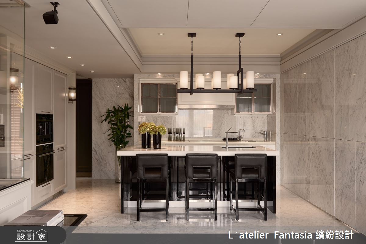 70 坪的樓中樓,因脊樑位置問題,造成局部天花板無法升高,於是設計師運用線板型塑垂直線條,並以電視牆尺度拉高空間比例,搭配燈飾、鏡面妝點,打造出一間挑高氣派的新古典歐美華宅! 走進玄關,可見大理石地坪鋪述華麗場景,呈現出宛如倫敦豪宅的第一印象;來到客廳,則轉換為木地板陳述溫潤氛圍,並以白色作為居家主調,呈現放大感受,電視牆則一路延伸至2樓,引領視覺向上,同時加入線板點綴,形成延伸的挑高效果,牆面中央妝點一面長型古銅鏡,透過折射效果豐富空間層次,天花則懸吊高雅吊燈,在奢華之中挹注一絲簡約美感;廚房設計則採用開放式規劃,在中島吧檯加入發光透光雲石,展現出有如夜店般的時尚氣息! 小編的最愛 設計師將「音樂」置入空間設計的一環,於 2 樓玄關處擺放鋼琴,做出樓層串聯,把鋼琴化為空間擺飾,搭配綠意植栽陪襯,形成靜謐愉悅的美好畫面!