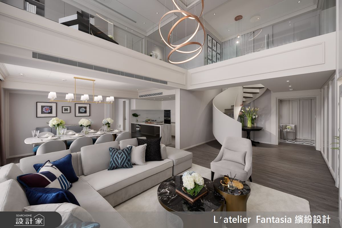 來自繽紛設計的60坪新古典住宅案,屋主一家人共有2位大人、2位小孩,是一間樓中樓新成屋(5年以下)的三房格局,設計師藉由建材以油漆、乳膠漆、壁紙、超耐磨木地板、木地板、鐵件、灰鏡、木作貼皮、烤漆、系統板材、大理石、木百葉、石材、線板、噴漆的搭配應用,實現一家人的理想生活。