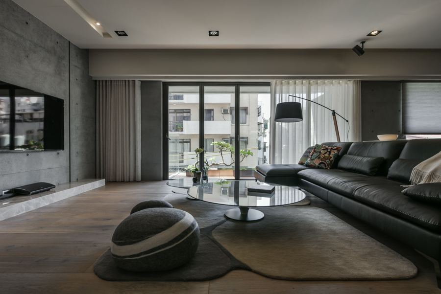 為未來的退休生活做準備,企業家屋主買的新成屋,設計師以材質鋪飾清樸潤澤的色調,並加入考量銀髮族生活的細節設計,而陽台處規劃綠意植栽和水池,大面玻璃摺疊窗引景入室,為 40 坪居宅繪上療癒舒適的自然原色。 走進室內,屏風以玻璃和俐落鐵件交錯配置,為玄關勾勒獨樹一格的風景,具粗獷原木紋理的懸空實木櫃,承載實用儲藏機能,完整收納出門時常用的鞋、帽、大衣等。納入客廳和餐廚的主空間地坪略微上抬,玄關處並貼心做出微斜的引渡坡道,銜接場域轉換。 採開放式設計的空間,單純動線串連客廳、餐廚等機能,碳化橡木地坪延續至牆面,將空間感二次延展放大。室內以大面開窗迎入採光和綠景,營造都市中的一方自在天地,大量清水模的使用,營造寧靜如水的素雅質感。與陽台配置水平並行的開放式廚房,正面迎向窗景,將蓊鬱綠緻融入下廚時光。 走廊側邊以隱藏式拉門融入收納規劃,無高低差的空間,可直接將大型行李箱推入,省去提放物品的困擾。書房採用通透玻璃隔間,活潑色彩的軟件單品提亮空間彩度,提點出繽紛的閱讀心情。主臥室背牆與收納櫃體相互呼應,使用寮國香檜讓室內飄散屋主喜愛的淡淡木香,營造舒眠氛圍。 小編的最愛 除了美型的外觀,許多設計巧思皆藏於在細節上,除了全室加入地暖設備和智慧型中央控制面板,設計師在地坪上採無高低差的銜接手法,以及轉角處加設圓弧形防撞邊條,避免老人跌倒碰撞而受傷,為銀齡族打造安全舒適的退休生活。