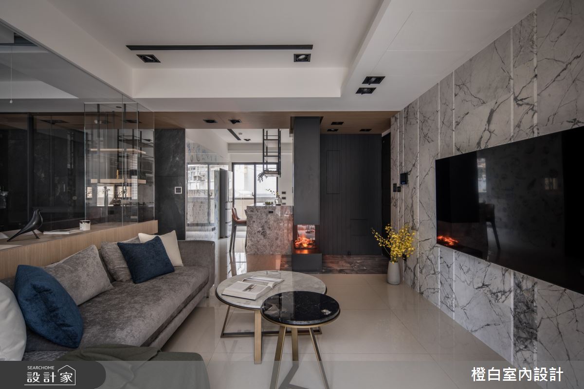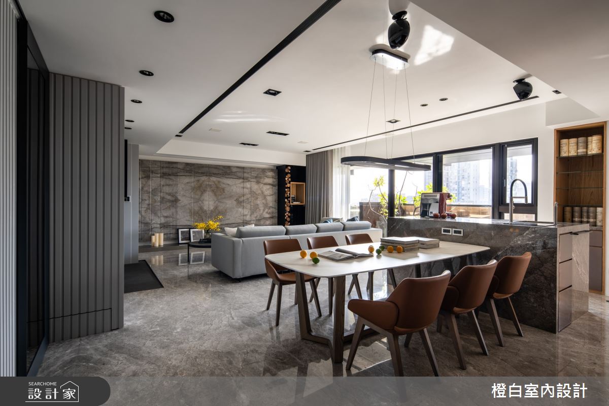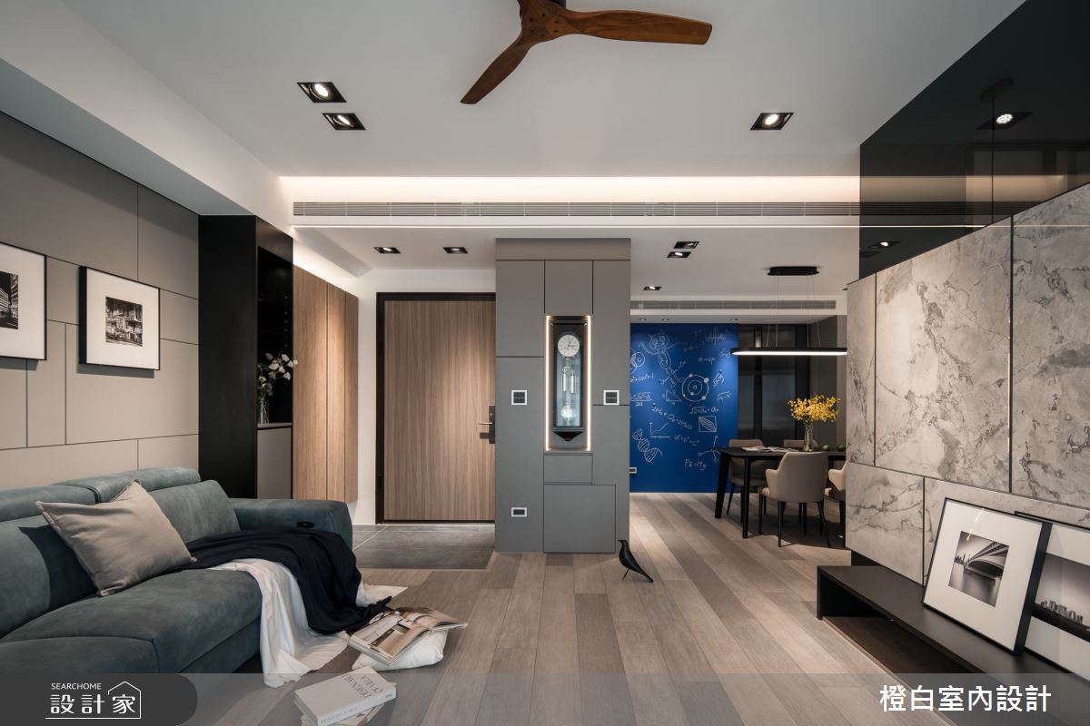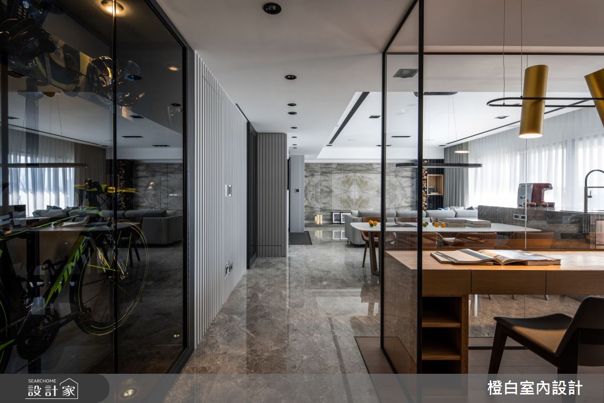 來自橙白室內裝修設計的55坪混搭風住宅案,屋主一家人共有2位大人、1位小孩,是一間單層新成屋(5年以下)的三房格局,設計師藉由建材以大理石、鐵件烤漆、人造石、木皮、超耐磨木地板、優白玻璃、烤漆玻璃、灰玻璃、磁磚的搭配應用,實現一家人的理想生活。
