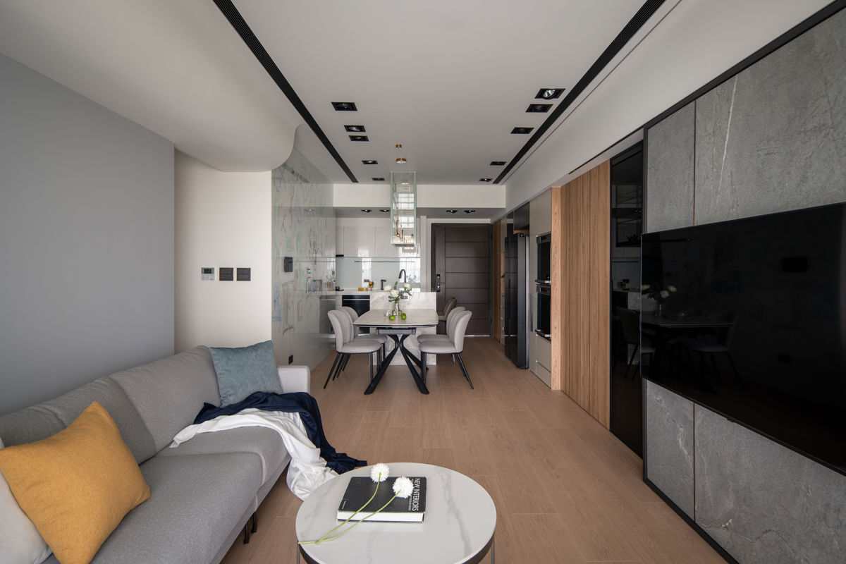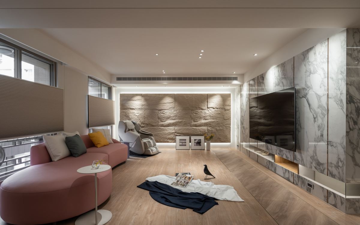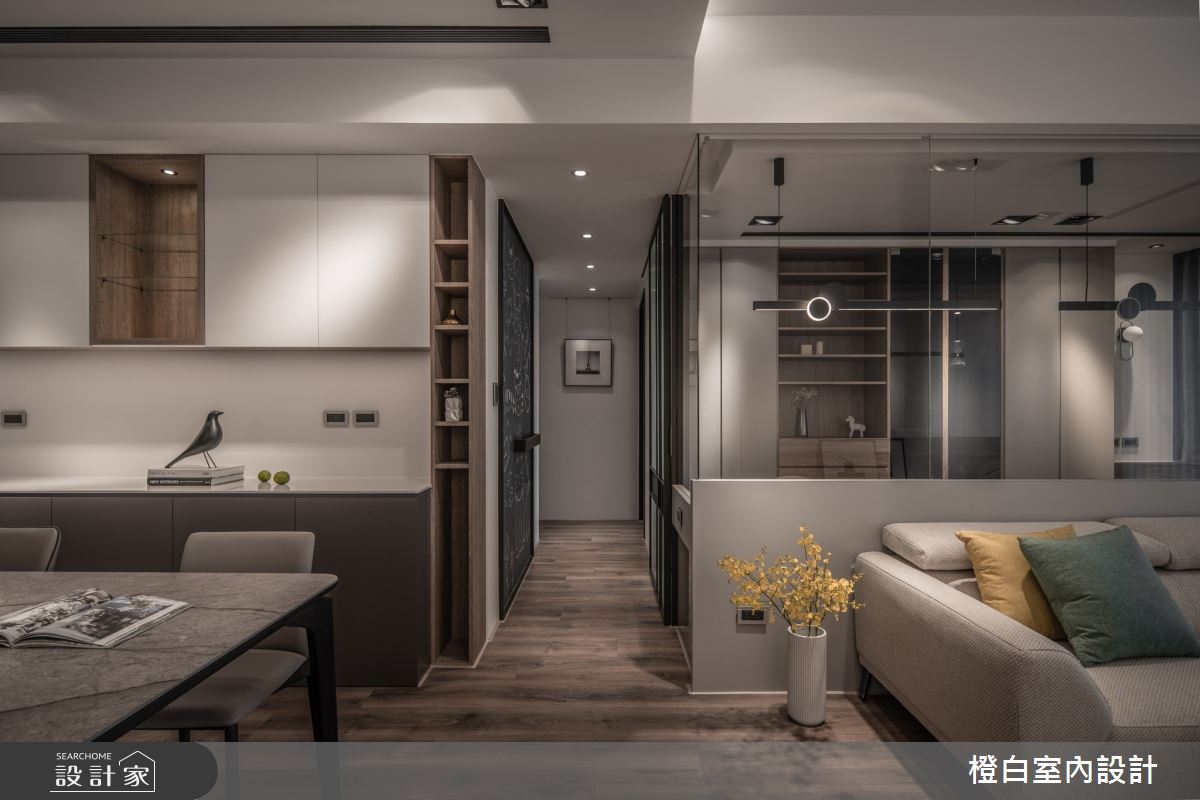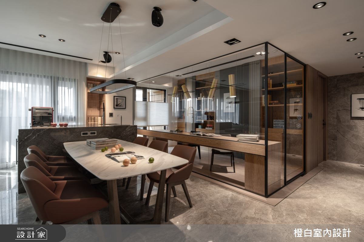 來自橙白室內裝修設計的55坪混搭風住宅案,屋主一家人共有2位大人、1位小孩,是一間單層新成屋(5年以下)的三房格局,設計師藉由建材以大理石、鐵件烤漆、人造石、木皮、超耐磨木地板、優白玻璃、烤漆玻璃、灰玻璃、磁磚的搭配應用,實現一家人的理想生活。
