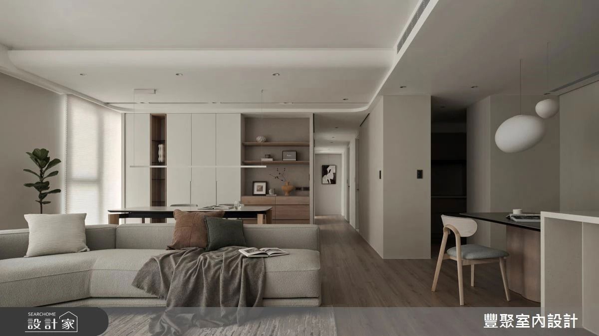 豐聚室內設計以超耐磨木地板、鐵件、系統板材、石材、義大利進口特殊漆、訂製家具、大板磚、長虹玻璃、白橡、安格拉珍珠、雕刻白、玻璃、實木、木皮、無醛屋的搭配應用,呈現現代風居家氛圍,將此間60坪、四房、單層、毛胚屋打造成舒適愜意的家庭空間,完成2位大人、3位小孩全家人的夢想之居。