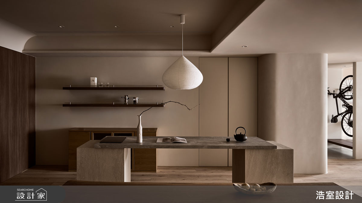由浩室設計精心規劃的35坪兩房住宅空間,家庭成員一共有2位大人。因應屋主需求,設計師運用侘寂風作為主軸,搭配磁磚、超耐磨木地板、實木皮、義大利塗料、鐵件、進口系統板,打造全家人的夢想家居。