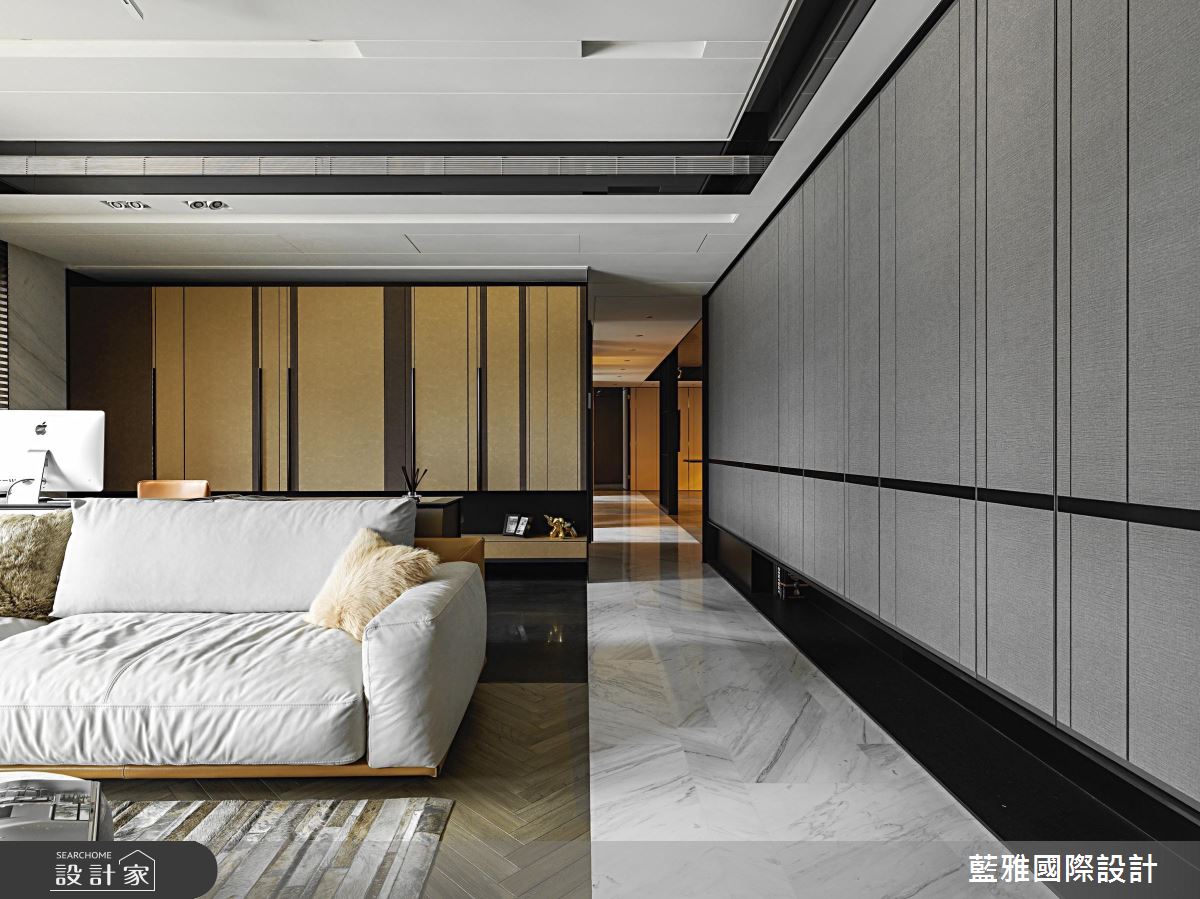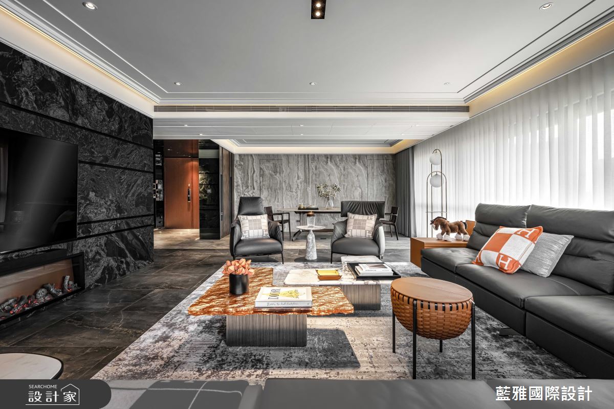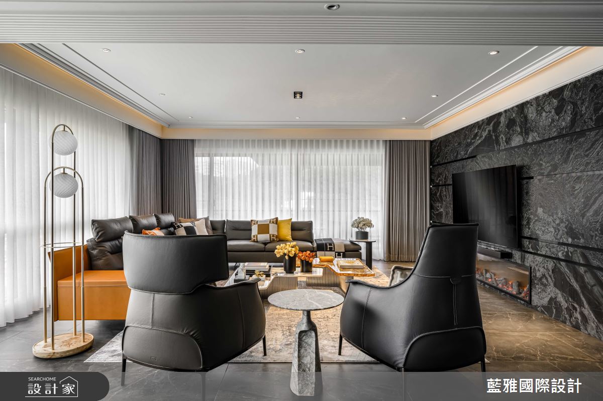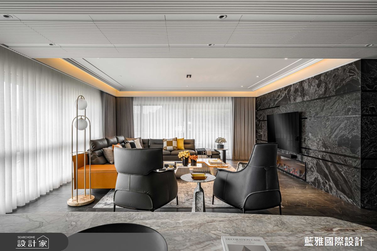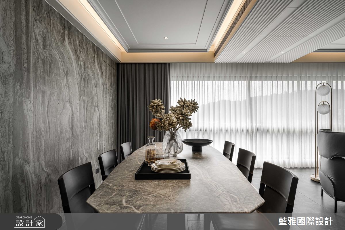 藍雅國際設計以石材、金屬、皮革、薄磚、木皮、塗料的搭配應用,呈現飯店風居家氛圍,將此間68坪、三房、單層、新成屋(5年以下)打造成舒適愜意的家庭空間,完成全家人的夢想之居。