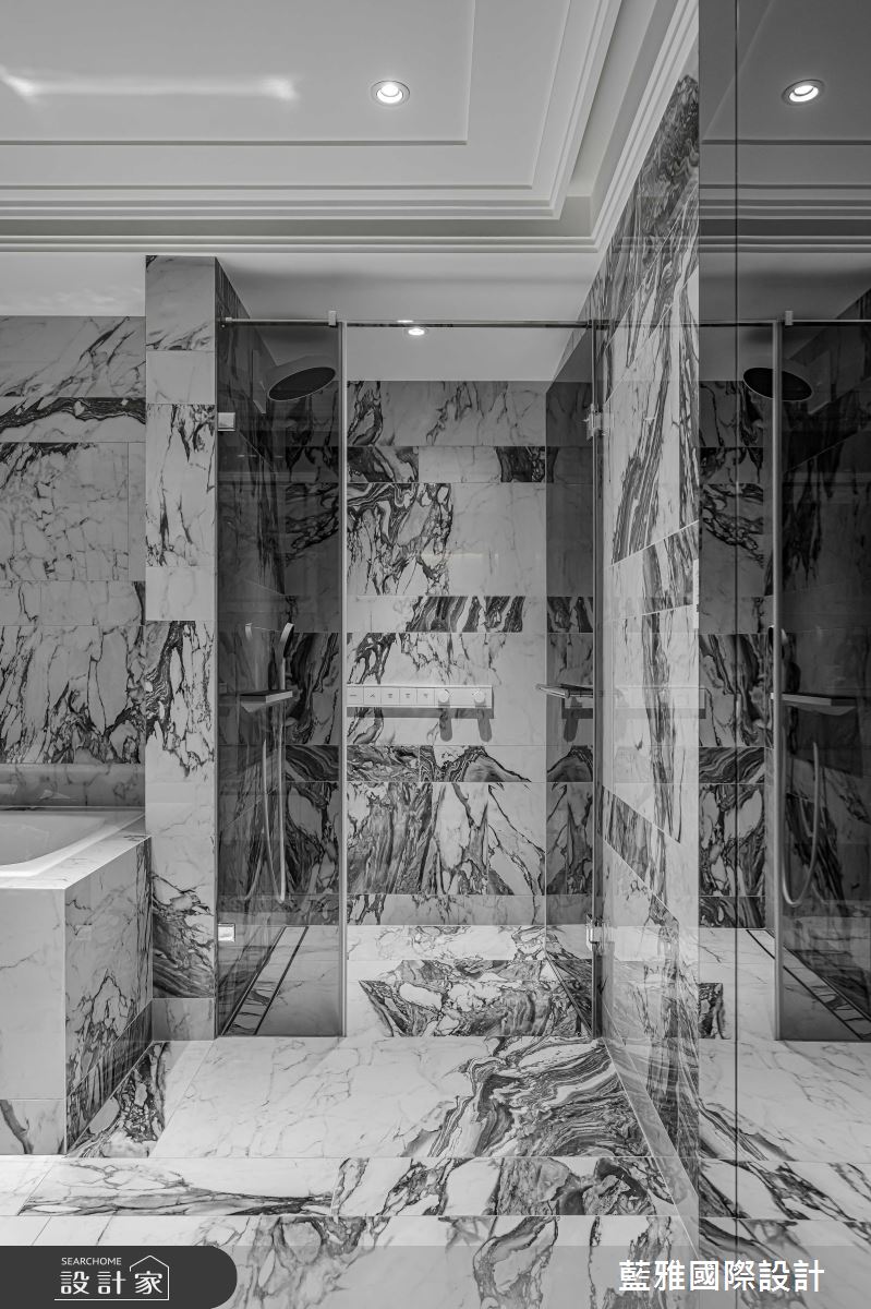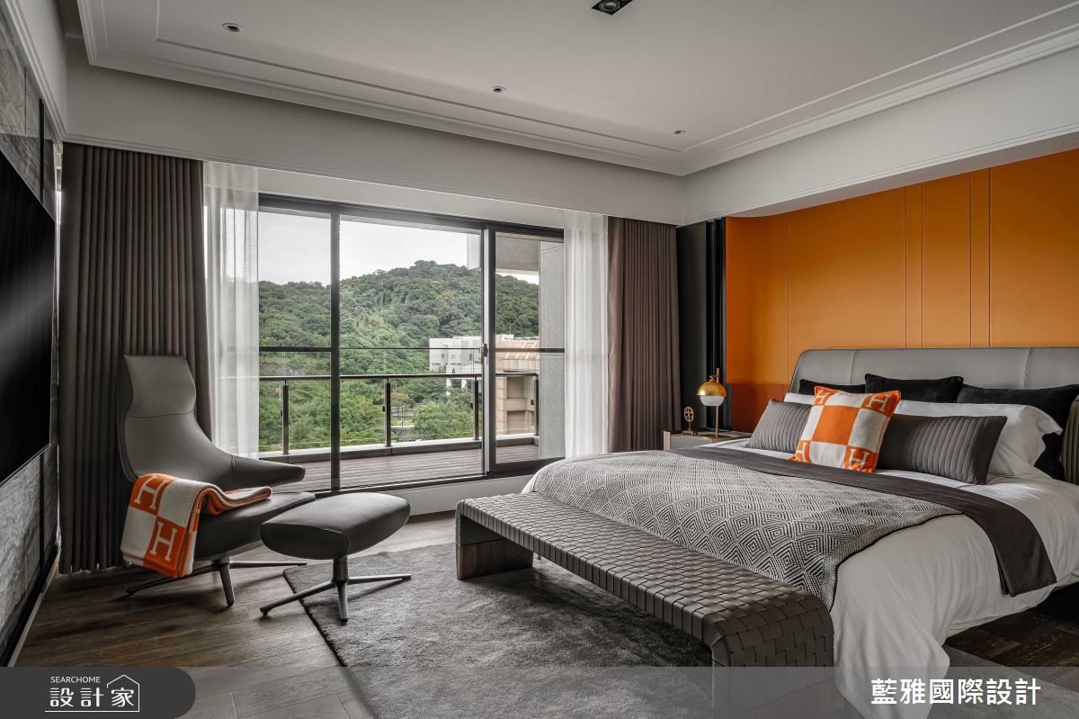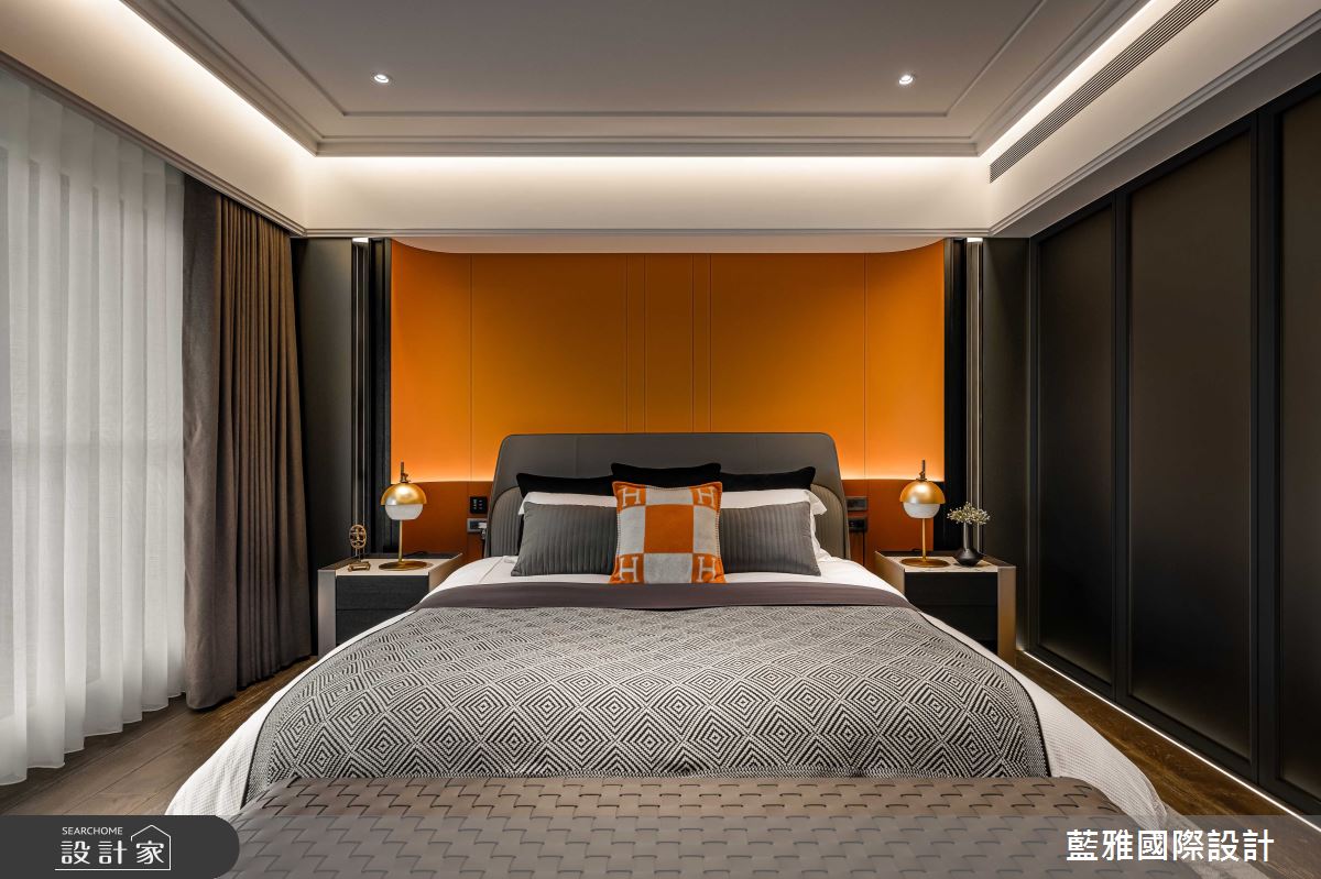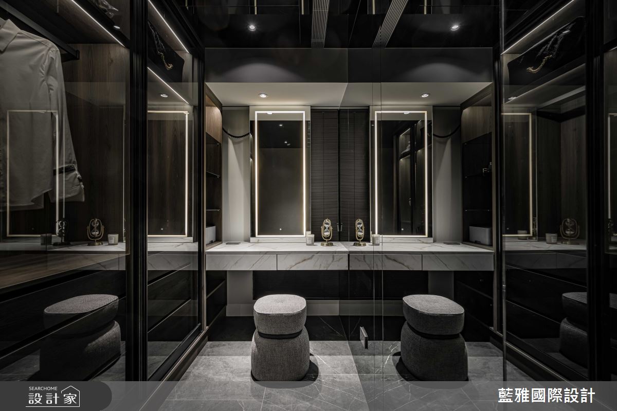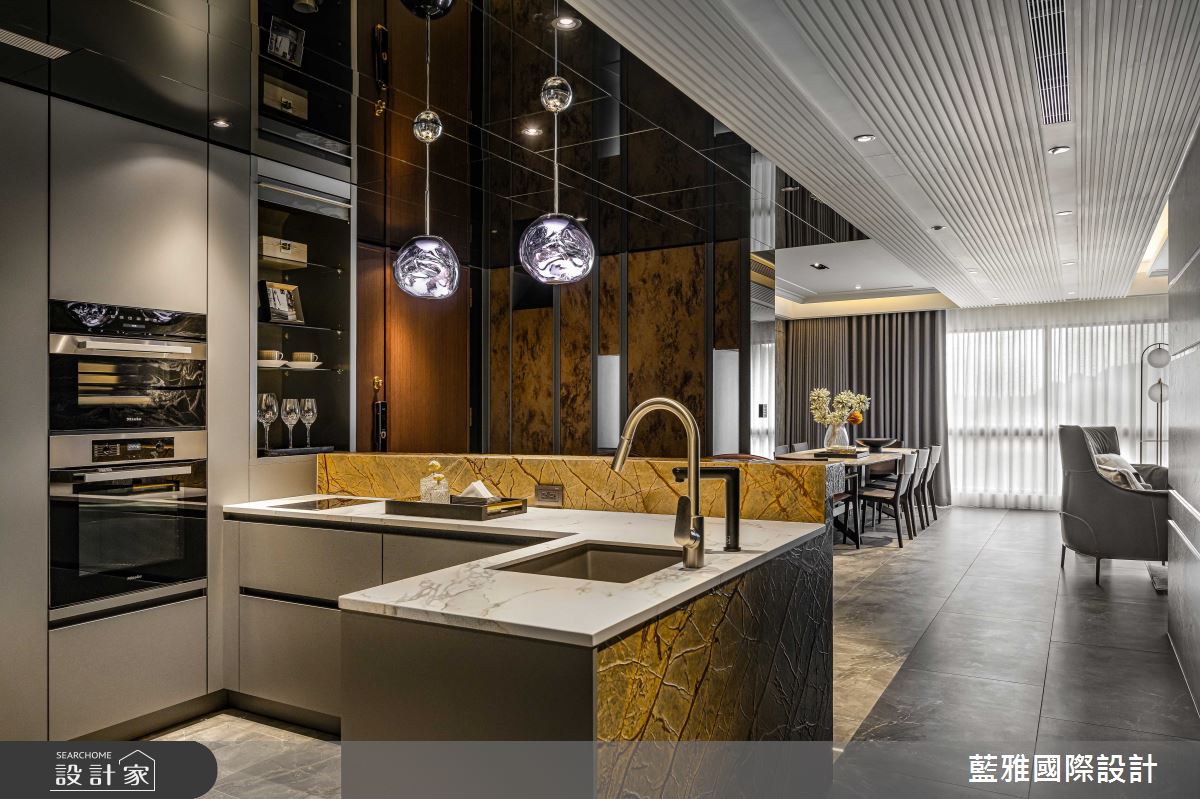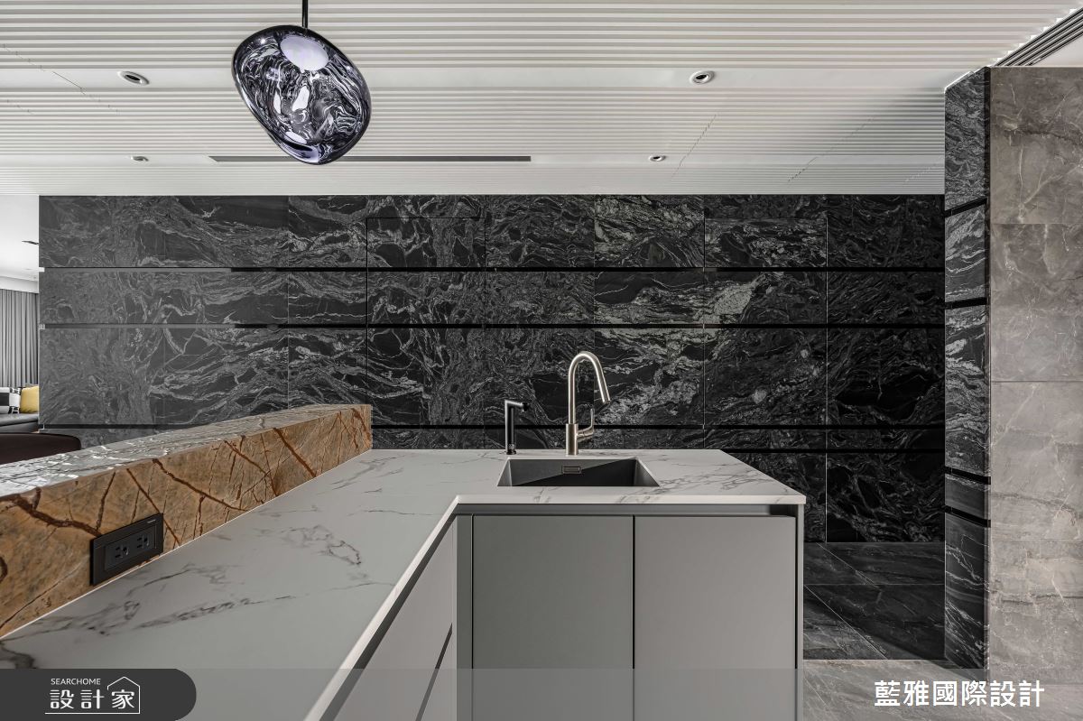 藍雅國際設計以石材、金屬、皮革、薄磚、木皮、塗料的搭配應用,呈現飯店風居家氛圍,將此間68坪、三房、單層、新成屋(5年以下)打造成舒適愜意的家庭空間,完成全家人的夢想之居。