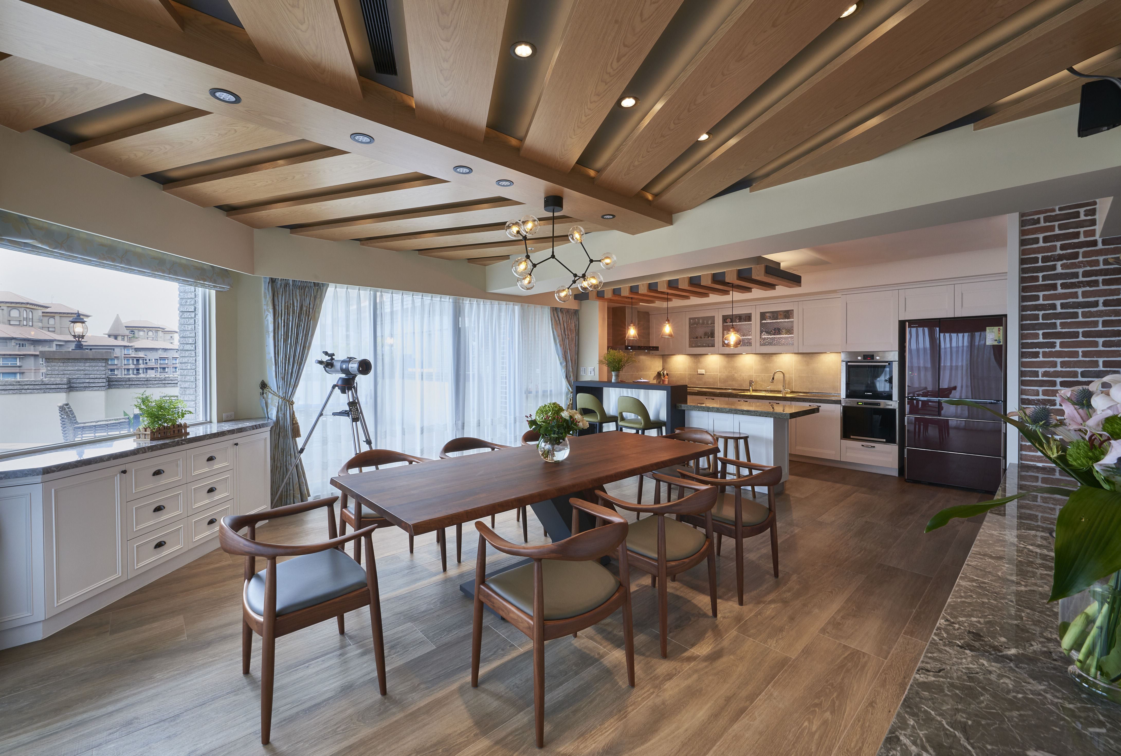 原是中古屋的樓中樓,在經由設計師的巧思重塑,挹注美式風加以改造後,不僅讓室內每個場域都萬分精彩,更搭配著日夜皆美的戶外景致,讓住宅也能坐擁景觀餐廳般的絕美視野,快跟著小編一起來看看吧! 公領域,透過透空的電視牆取代實牆,將客廳、餐廚區予以串聯,創造回字型的自由動線,並在牆面復古紅磚的砌築下,形成與窗外藍天的趣味對比,天花造型亦充滿著界定意味,於客廳採用俐落框架、用餐區則選用木作鋪敘,締造二者之間的不同氛圍;寢臥空間內,融入了細膩的美式新古典韻味,展演出場域的優雅之姿,藉由壁紙凝聚立面質感,搭佐漸進式的起居動線,完善生活中的每個使用時刻;同時善用廳區樓梯上方的挑高地帶,以獨特的格局及位置,打造出休憩兼書房領域,且配置大容量的書牆設定,使空間猶如國外圖書館般美輪美奐! 小編的最愛 多面向的落地開窗,讓室內可隨時坐享自然美景,而庭院外,則運用桌椅擺設、露天 spa池、木地板等元素,營造出充滿度假感的場景,讓人不必出遠門,也能在家享受異國午茶時光!