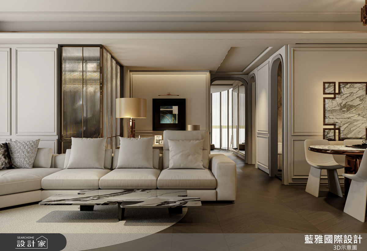 藍雅國際設計以石材、金屬、皮革、薄磚、木皮、塗料的搭配應用,呈現飯店風居家氛圍,將此間68坪、三房、單層、新成屋(5年以下)打造成舒適愜意的家庭空間,完成全家人的夢想之居。