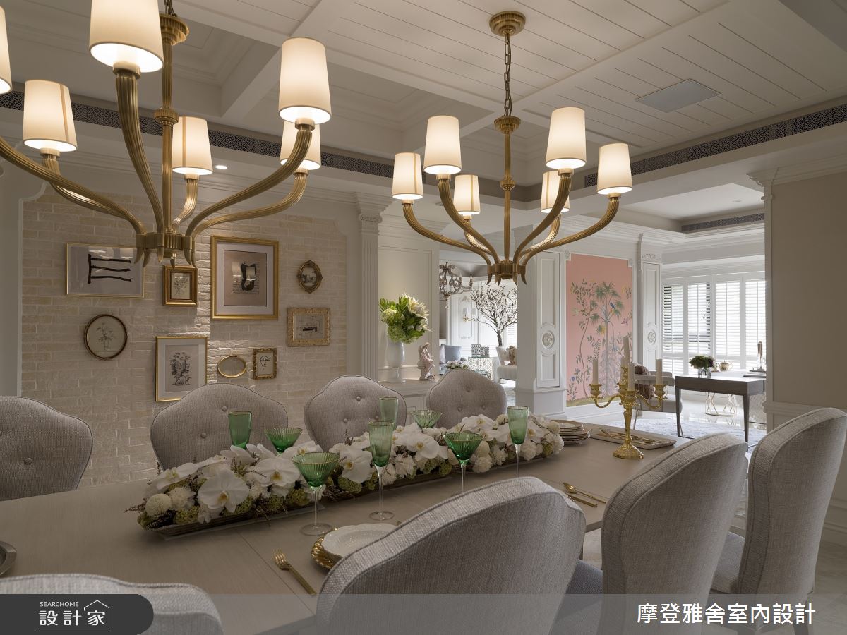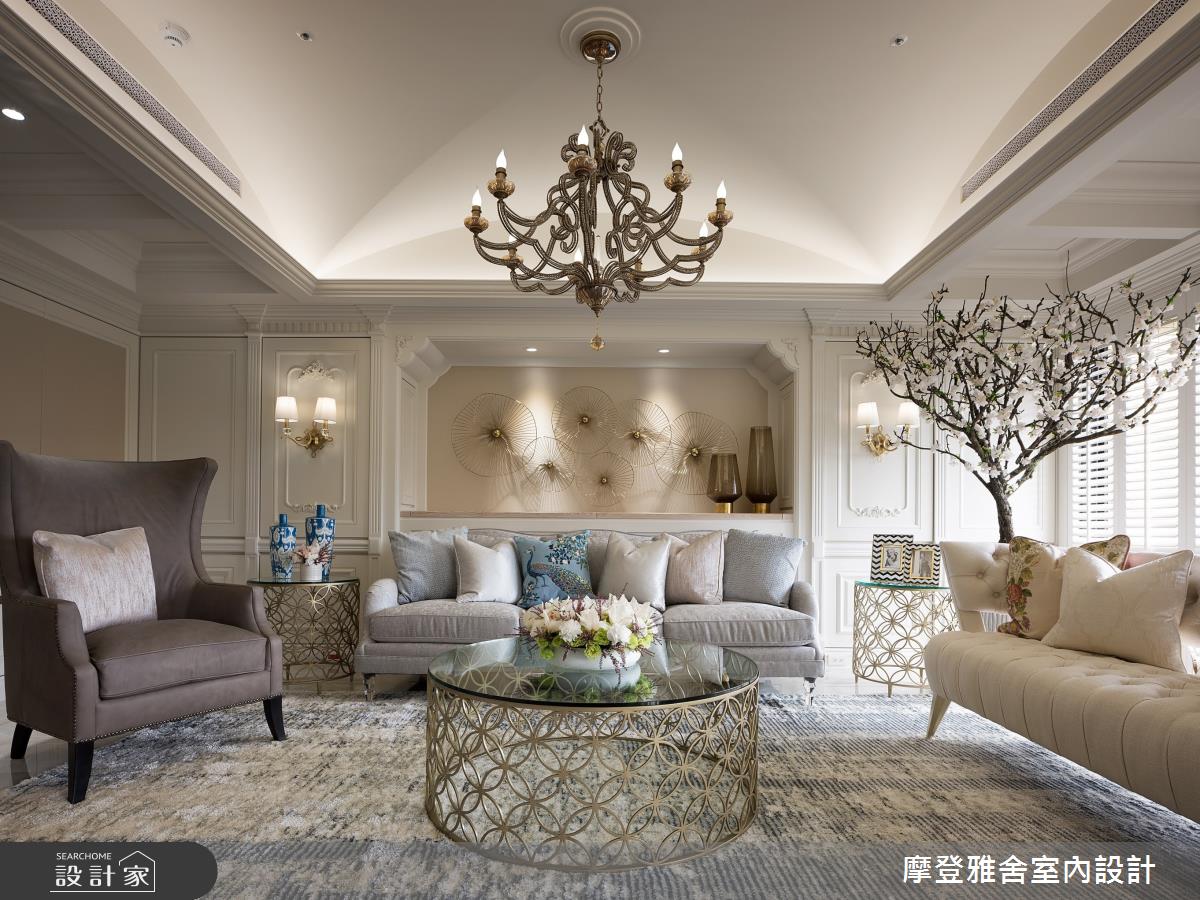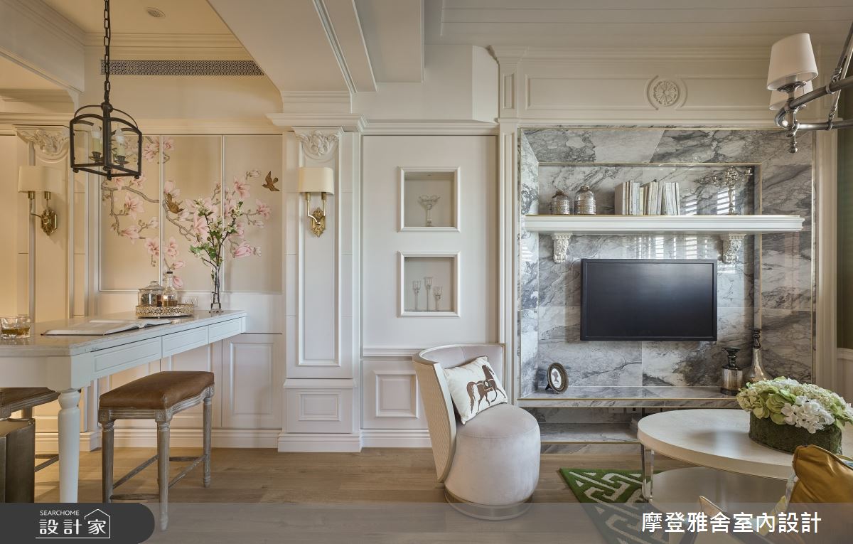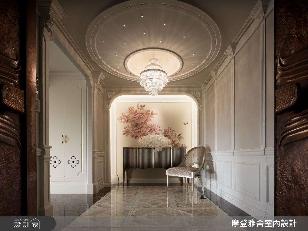 本案為摩登雅舍室內設計的100坪新古典中古屋(5~15年)設計作品,格局為單層三房的居住空間。居住成員包含2位大人。全室建材的搭配,應用超耐磨木地板、烤漆、木百葉、水晶燈、手繪壁布、進口藝術磚、木作,展現溫馨的居家氛圍。