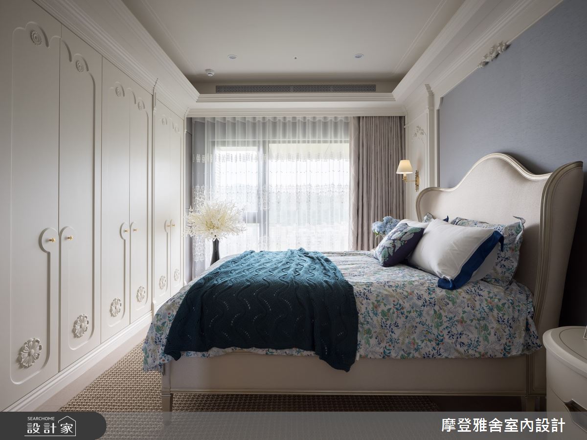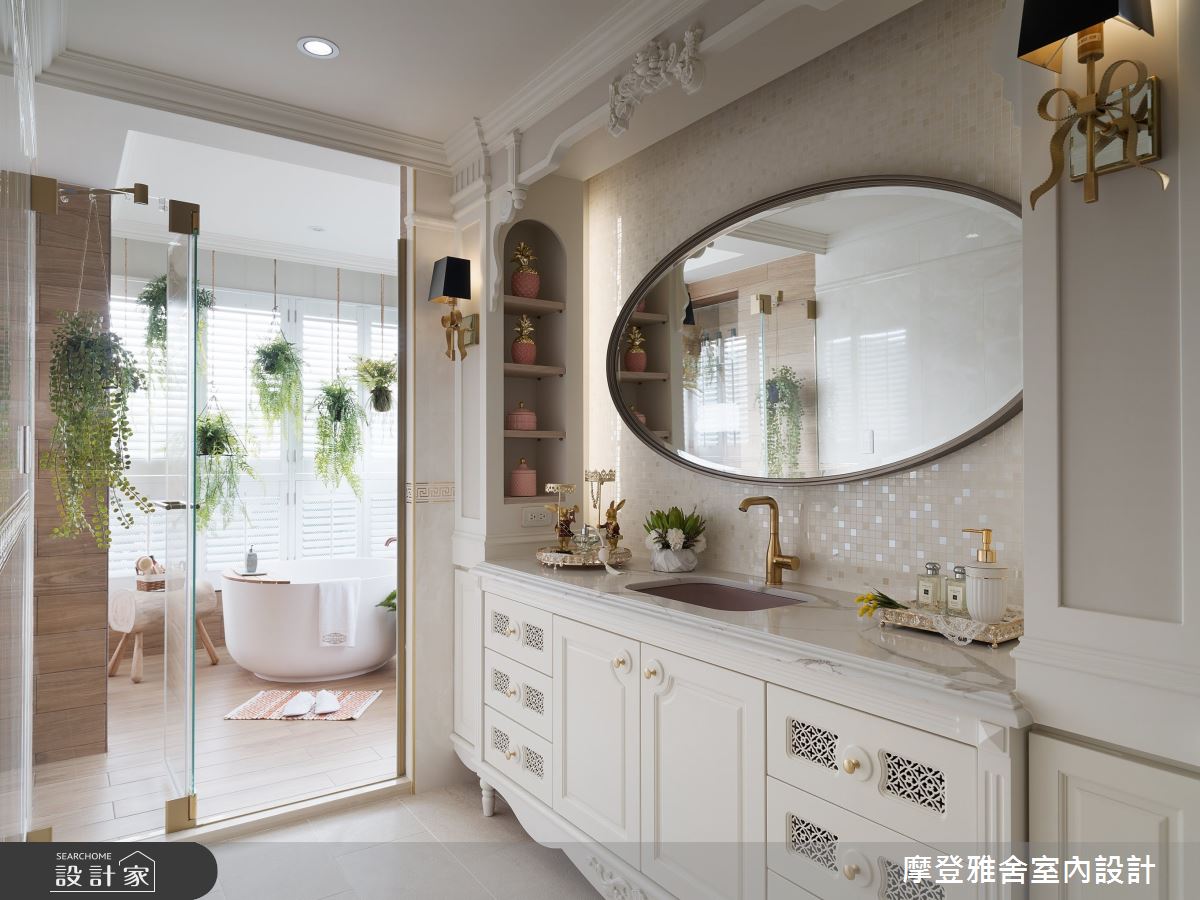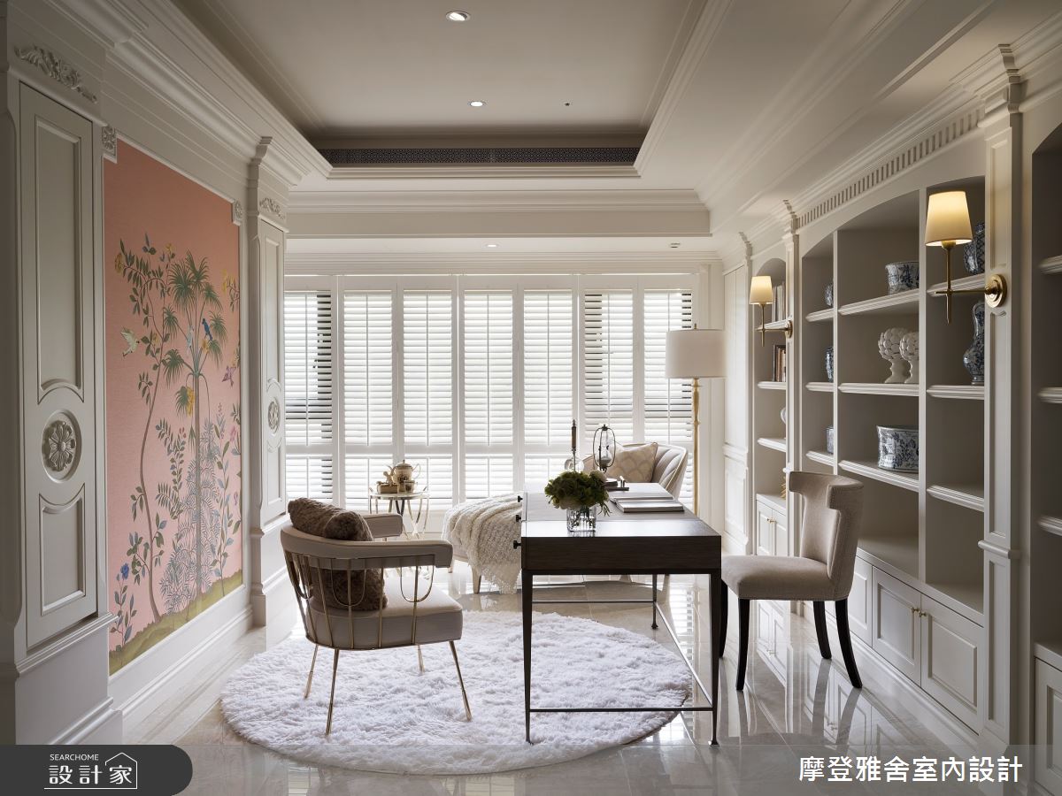 本案為摩登雅舍室內設計的100坪新古典中古屋(5~15年)設計作品,格局為單層三房的居住空間。居住成員包含2位大人。全室建材的搭配,應用超耐磨木地板、烤漆、木百葉、水晶燈、手繪壁布、進口藝術磚、木作,展現溫馨的居家氛圍。