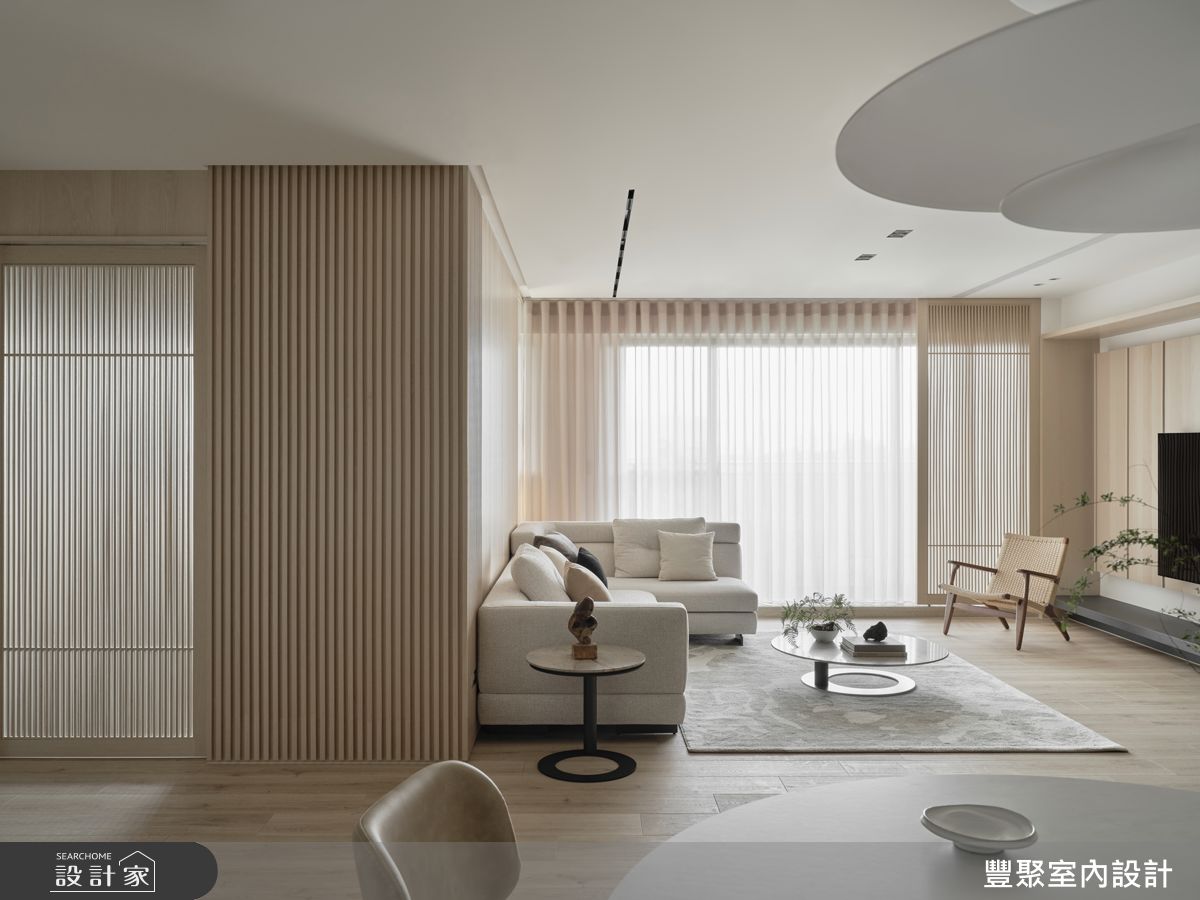 豐聚室內設計以超耐磨木地板、灰鏡、鍍鈦金屬、烤漆、大理石、磁磚、木百葉、賽麗石、石材、繃布、線板、耐麗石、環控系統、風琴簾、原廠燈具、班傑明塗料、原廠家具的搭配應用,呈現奢華風居家氛圍,將此間50坪、三房、單層、中古屋(5~15年)打造成舒適愜意的家庭空間,完成2位大人、2位小孩全家人的夢想之居。