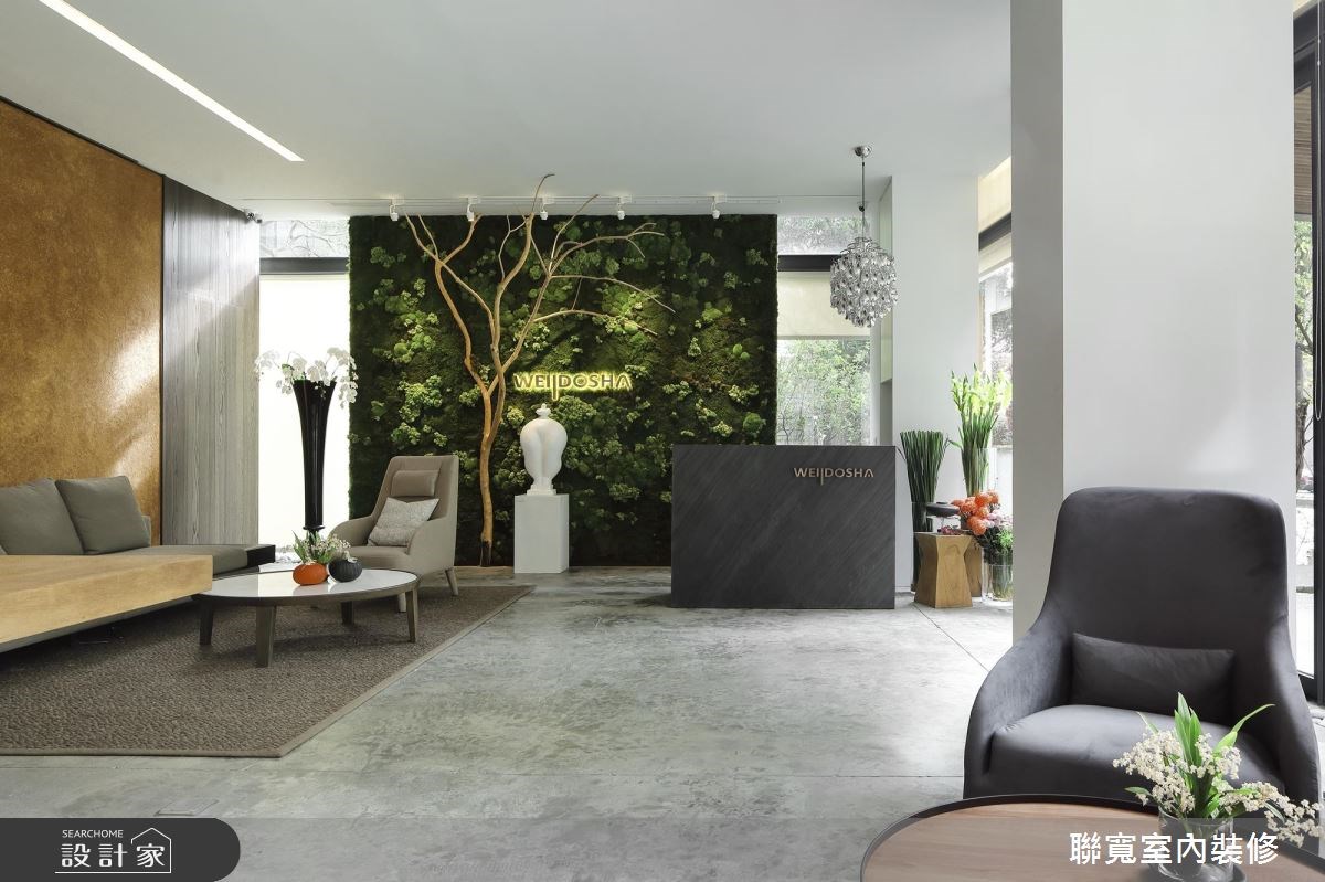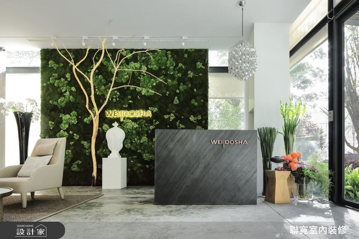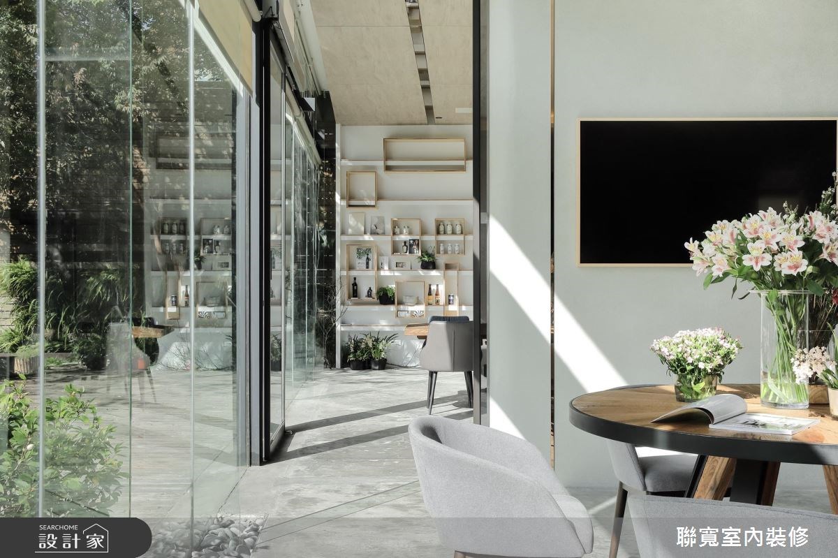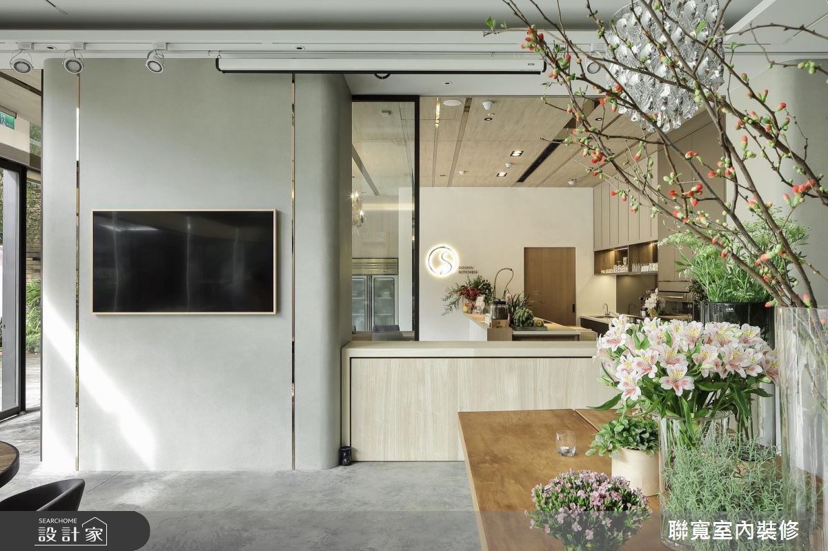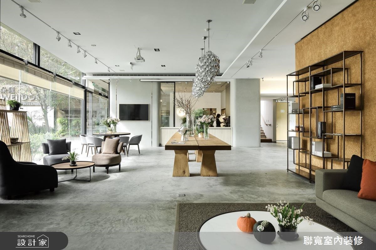 溫暖的陽光穿透巨型玻璃拉門、隔間牆,走進80坪挑高、寬敞的空間裡,通透材質界定的手法,烘托植栽、花卉的天然色澤,以及華麗、層次感的燈飾設計,創造藝術與人文的美學空間,體驗五感昇華的美好生活。 綠意景觀環抱清水模打造的建築體,傳遞療癒的休閒風尚,替都會裡的人們打造一處安定的淨土。推開玻璃大門來到室內,無繁複的裝修技法,白色的天花板串連整個領域,局部以階梯式安排,美化大樑結構,藉由視覺高低差的感受,塑造出軒昂大器;周圍擁有大面採光,引入戶外綠意,室內以簡約、明亮的元素作為風格調性,內外景緻相互呼應且延伸,讓設計回歸純粹性,而空間裡的植栽牆、華麗感吊燈、結構感的展示層架從背景中脫穎而出,演繹雅緻的生活品味;中央擺設一張大型的原木長桌,成為各式各樣花藝的展演處;後方的餐廚區以大量的木紋飾底,增添溫馨情誼,天花板與壁面則利用細長條的金屬質材描繪,提升視覺明亮度,挹注時尚風采。 小編的最愛 讓自然、簡約的風格打底,藉由空間裡的色彩、線條與綠意花卉,揉合出充滿藝術與休閒感的質感生活;而運用穿透質感的玻璃材質,形塑輕盈、流動感的空間氛圍。