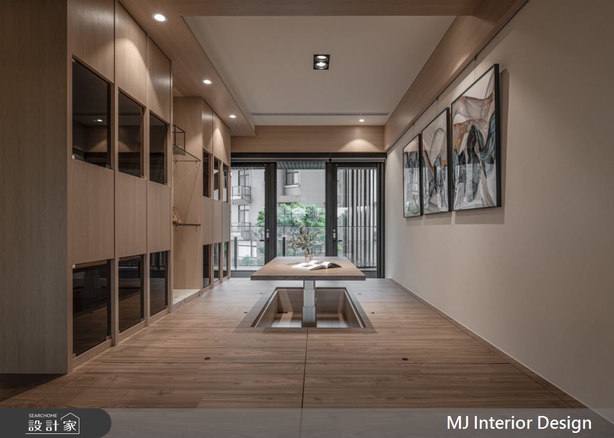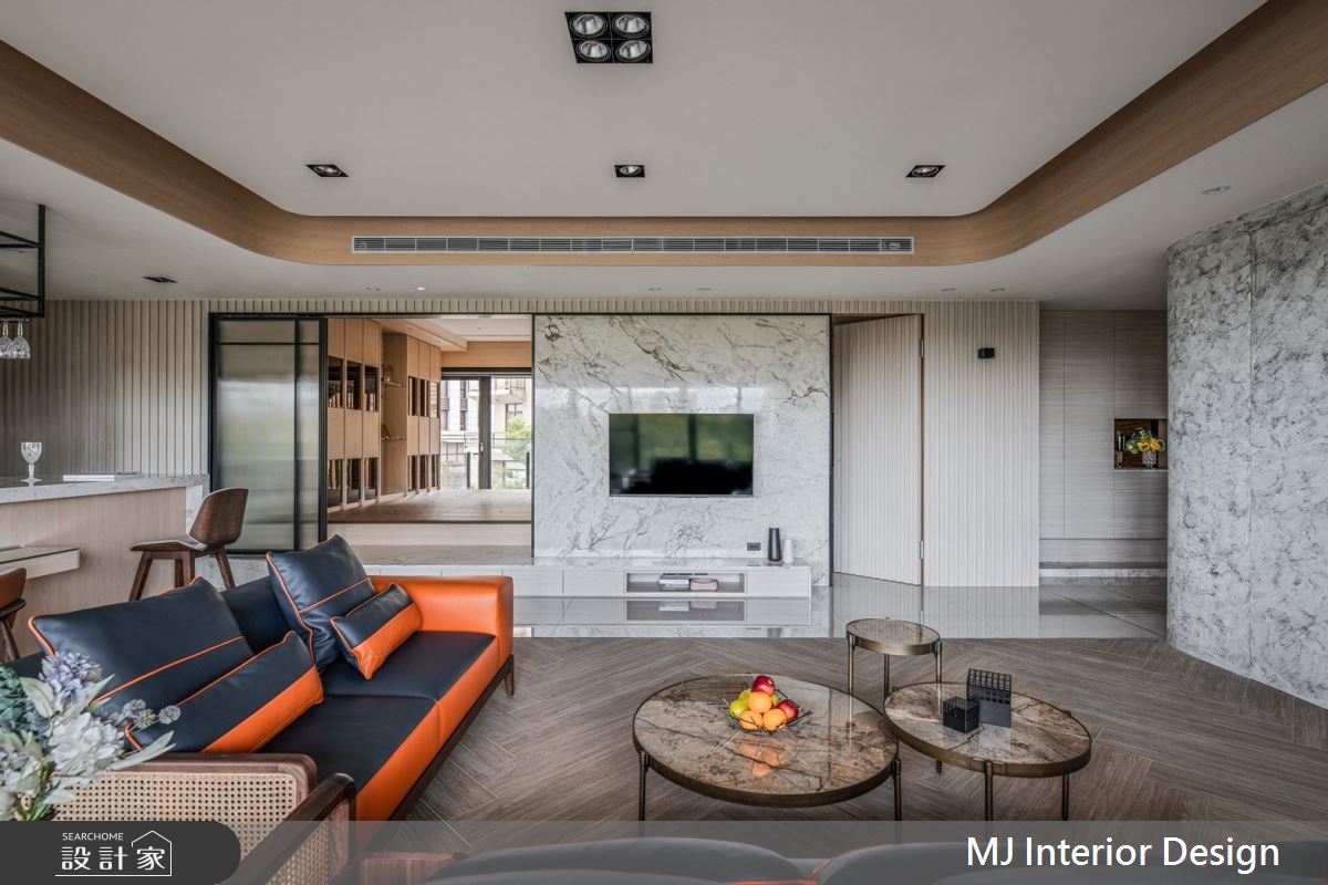 銘家MJ Interior Design以六角磚/蜂巢磚、木紋磚、鐵件、鍍鈦金屬、大理石、磁磚的搭配應用,呈現奢華風居家氛圍,將此間50坪、四房、單層、毛胚屋打造成舒適愜意的家庭空間,完成2位大人、2位小孩全家人的夢想之居。