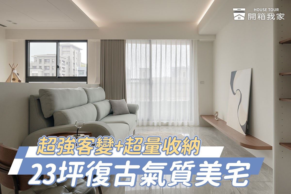 23坪復古混搭美宅,客變微調格局,將衛浴動線調整,增量收納讓空間更好用。格柵隱藏收納,沉穩柚木色系搭配藤編櫃、老窗花玻璃,打造居家復古氛圍,開放式格局開展生活空間,一家三口舒適的親......