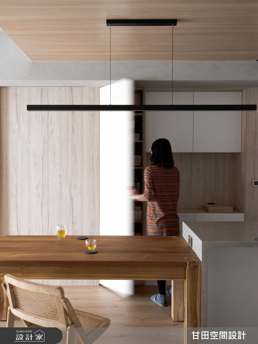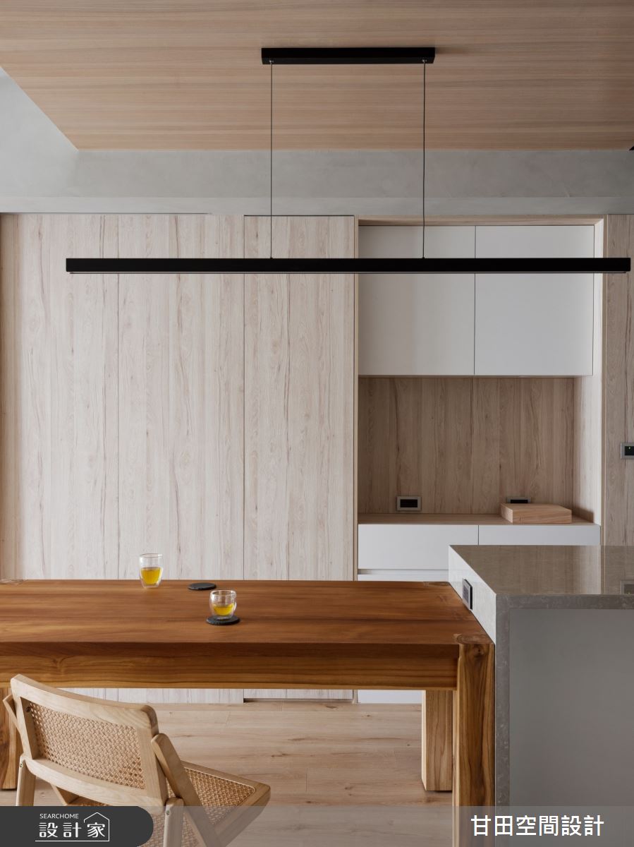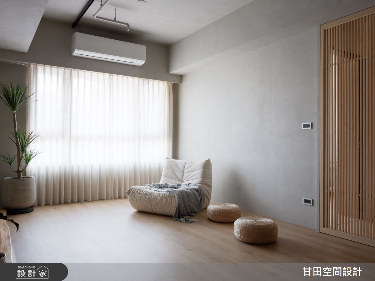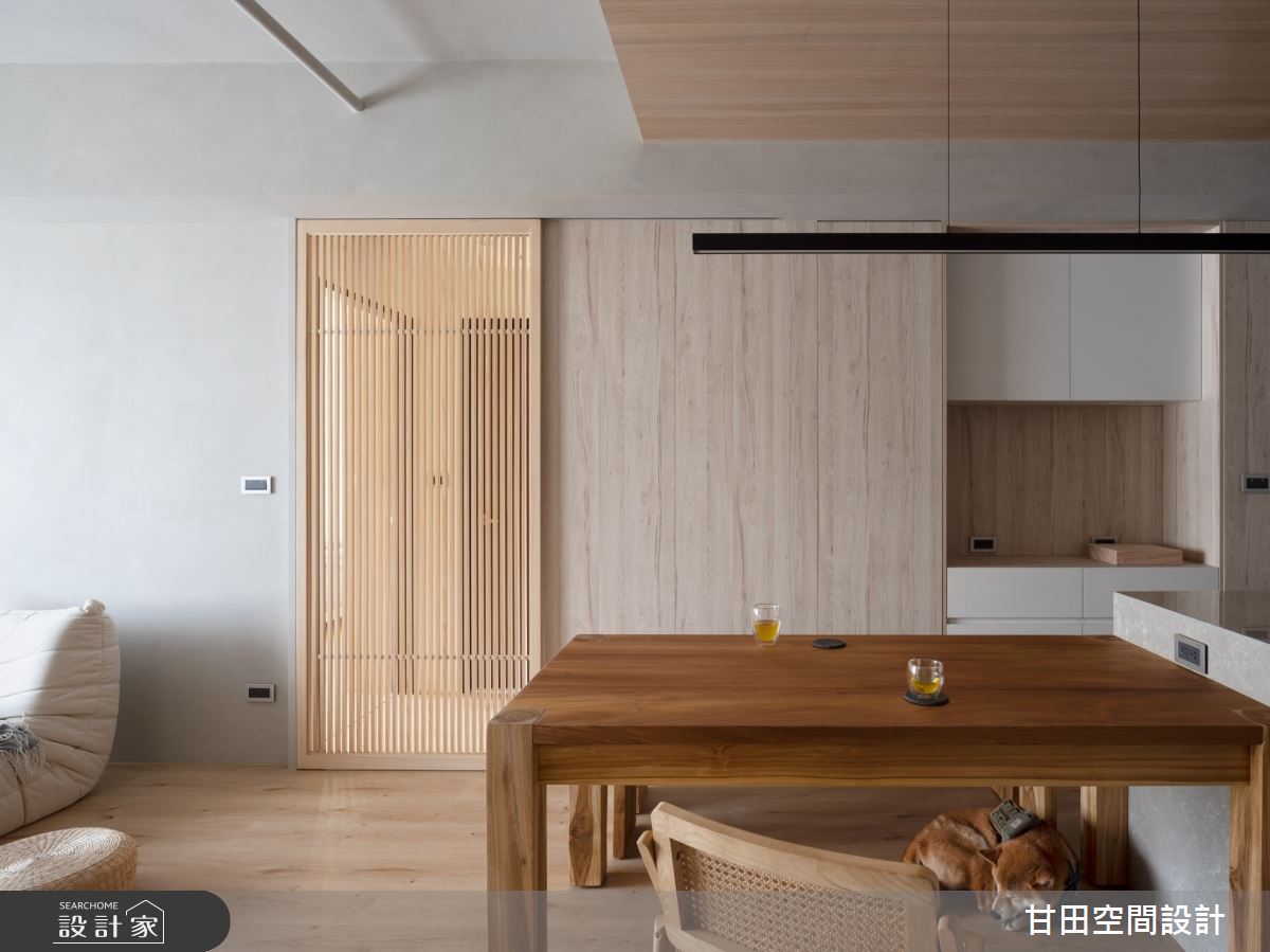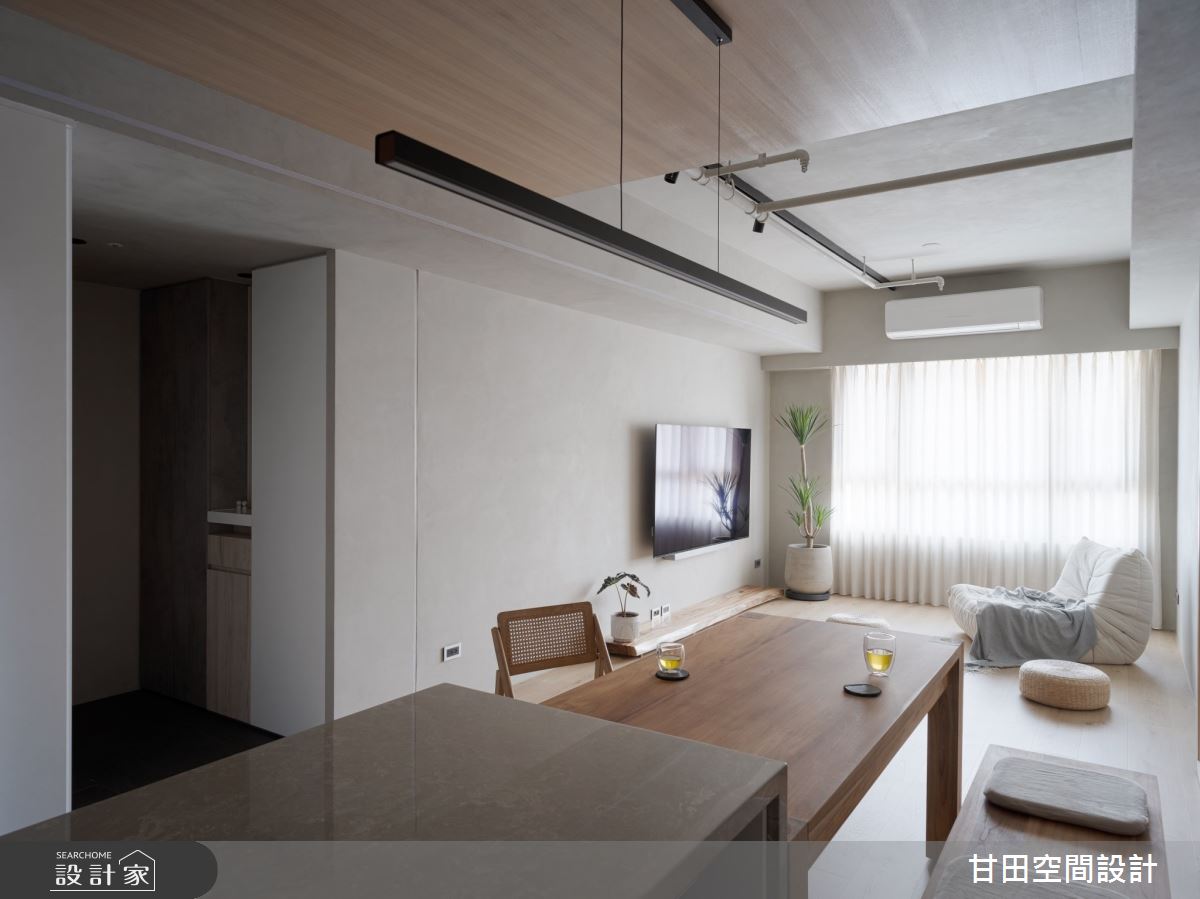 來自甘田空間設計的22坪日式無印風住宅案,屋主一家人共有2位大人,是一間單層新成屋(5年以下)的兩房格局,設計師藉由建材以油漆、乳膠漆、超耐磨木地板、不鏽鋼、木作貼皮、鋼刷木皮、軌道燈、仿清水模塗料、線燈、木格柵、磁吸軌道的搭配應用,實現一家人的理想生活。
