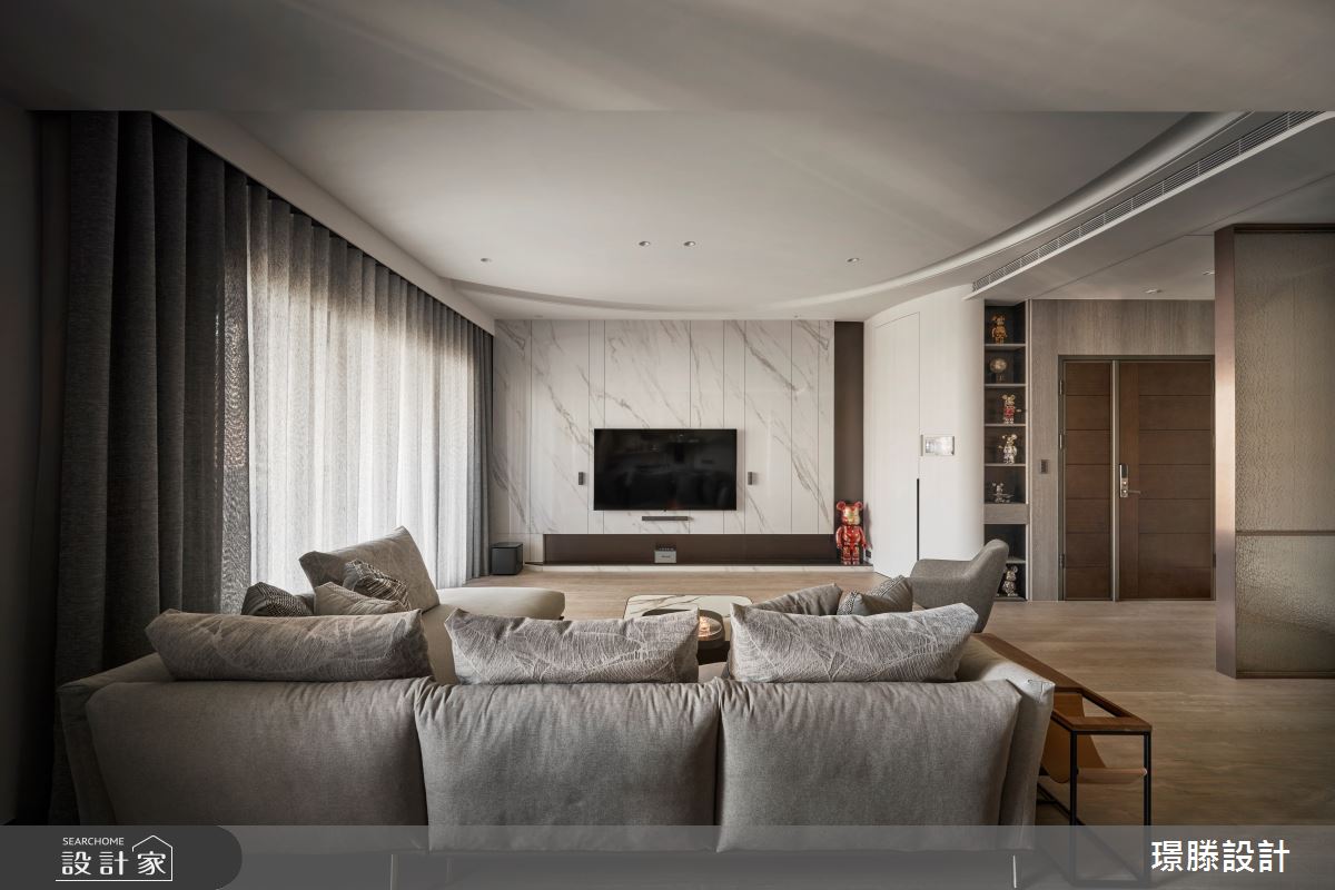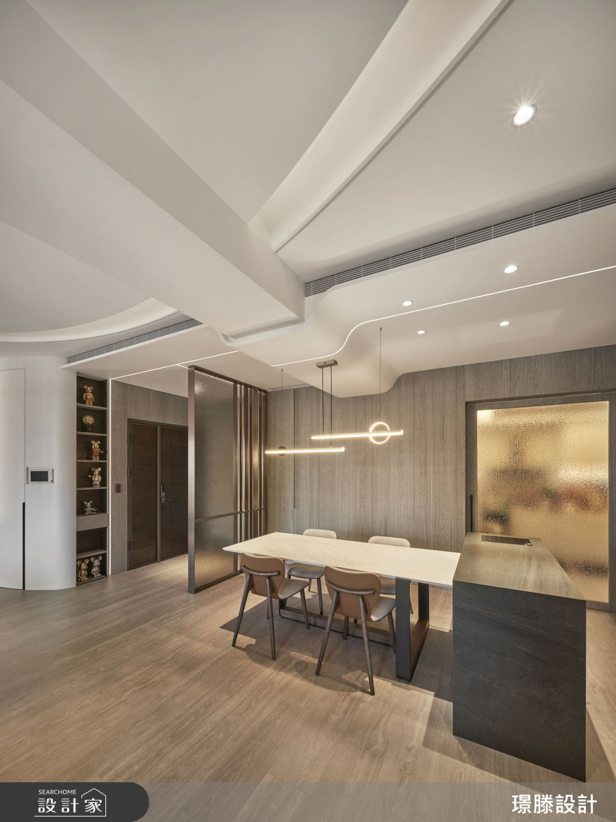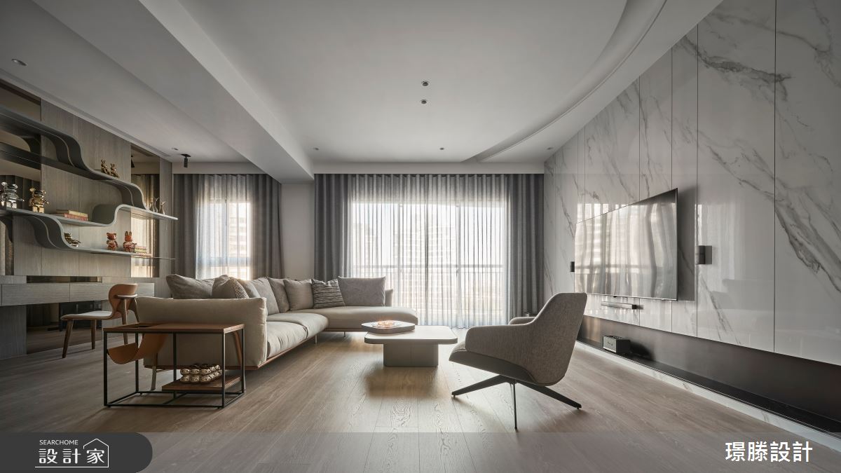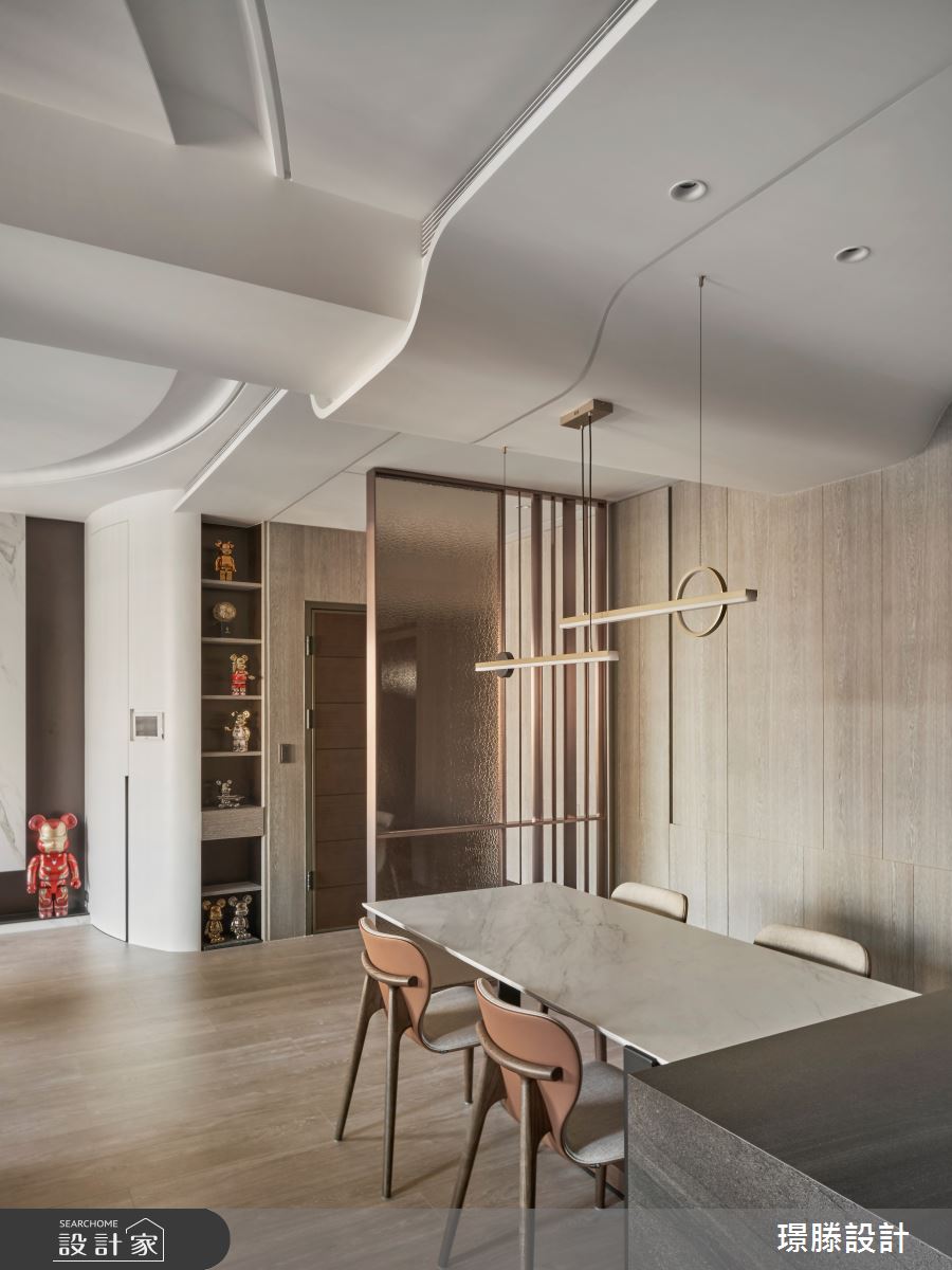 王麗慧、于葳颽、王哲旻 設計師將精緻俐落的大理石與鏡面材料做出輕巧舒適的質感設計,搭配圓弧曲型燈飾呈現出自由自在的氛圍,建構出符合居住者期待的細緻現代宅